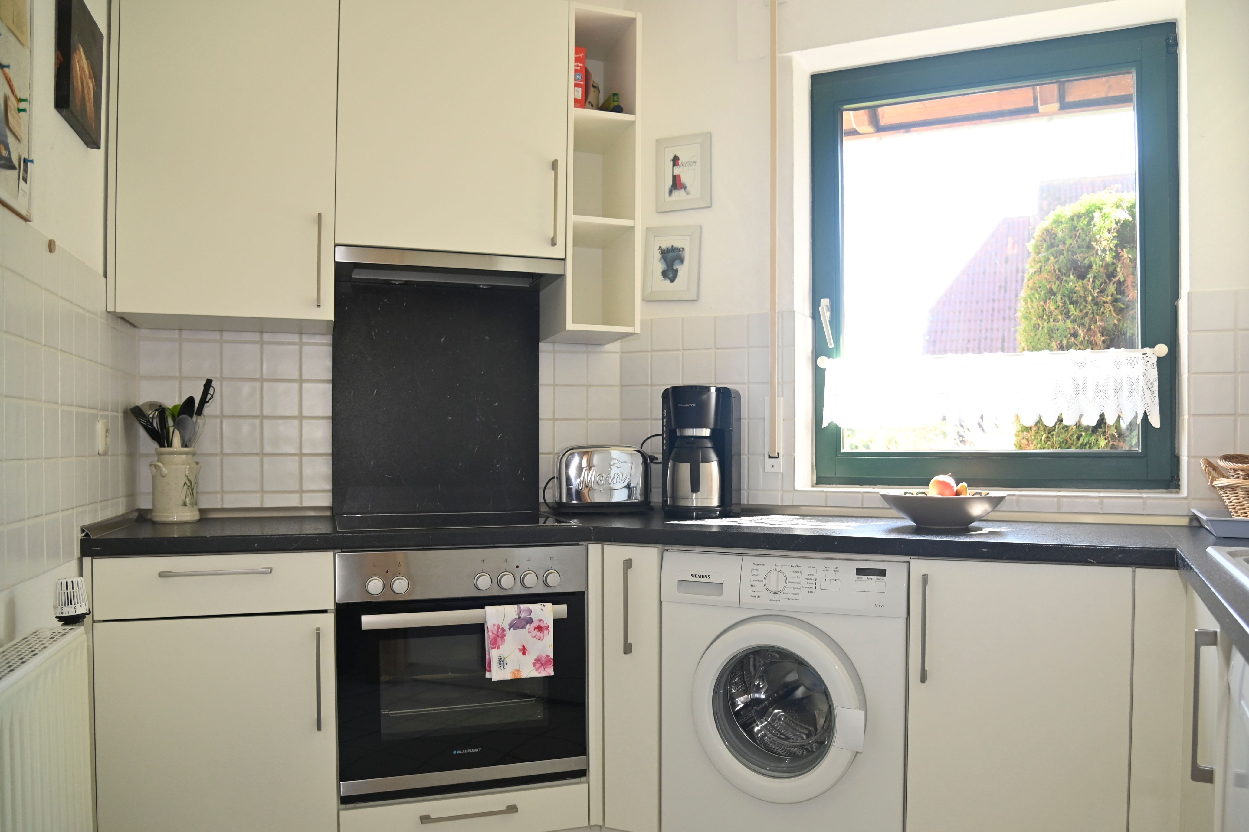 komplett eingerichtet, Spülmaschine, Waschmaschine, E-Herd mit Ceranfeld und Backofen, Kühlschrank mit Gefrierfach, Kaffeemaschine usw.