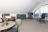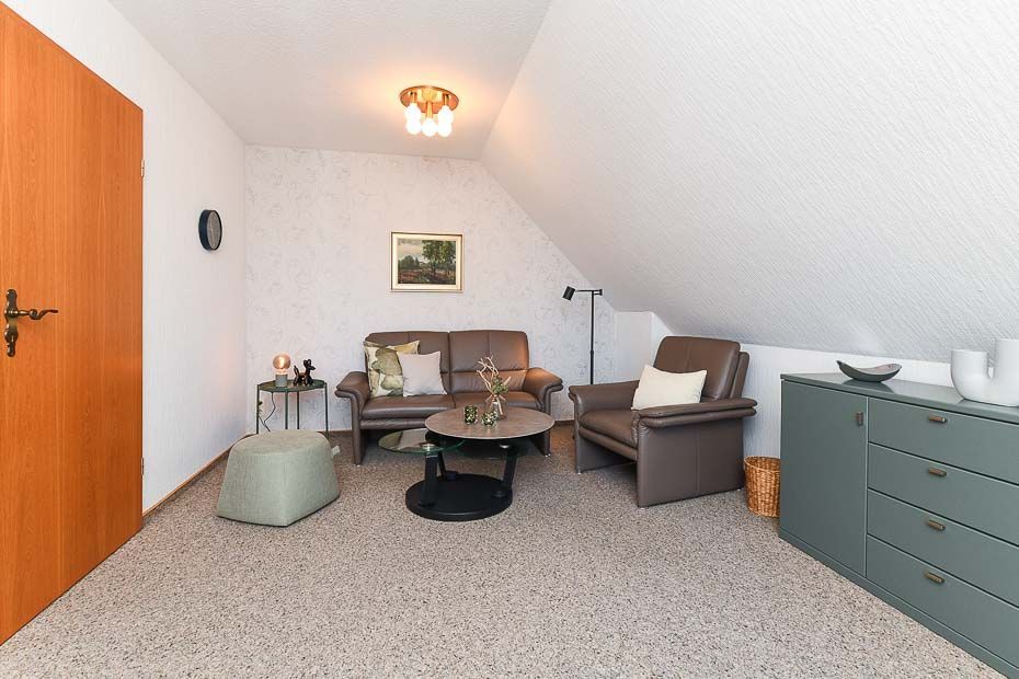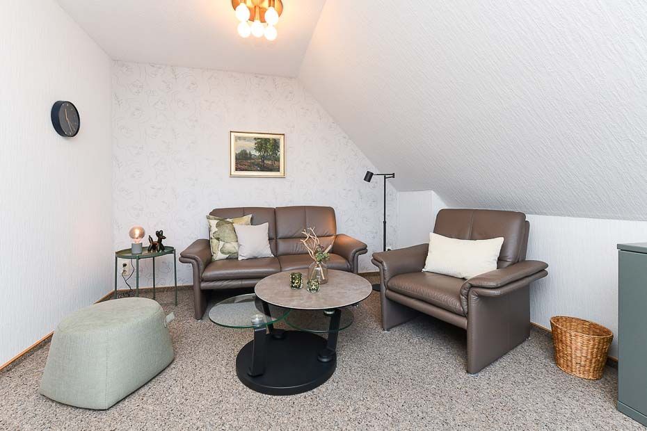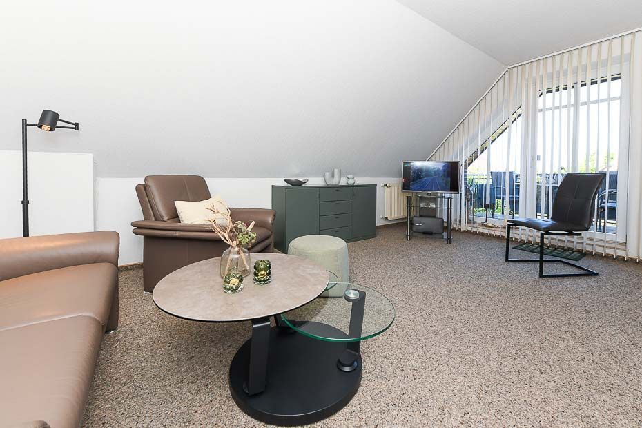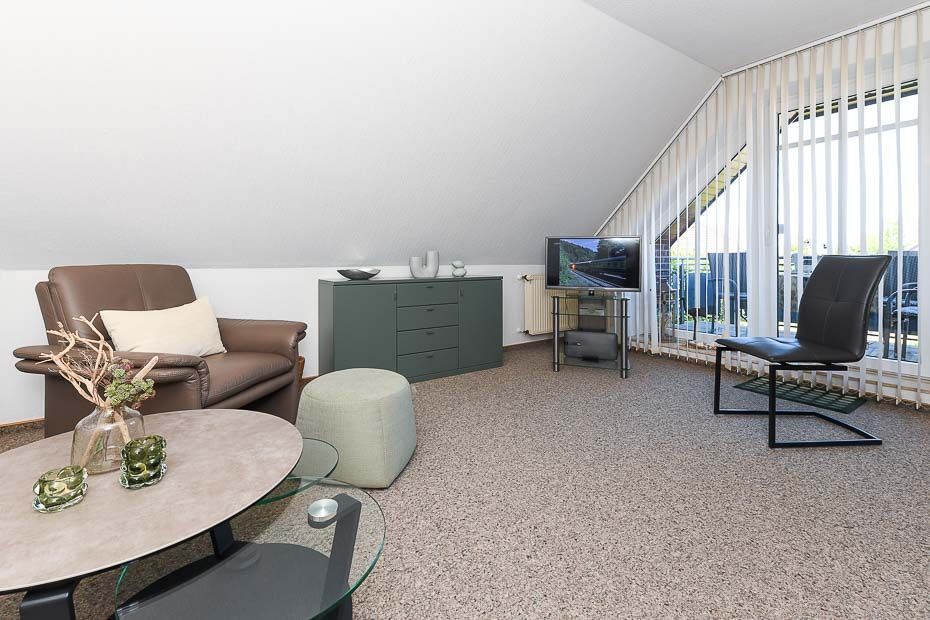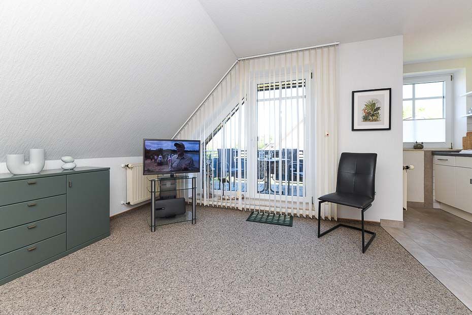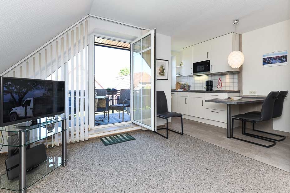 Größe ca. 65 Quadratmeter, Wohnraum mit integrierter Küche, Schlafzimmer, zweites separates Schlafzimmer, Badezimmer mit Dusche, Waschtisch und WC, Obergeschoss, Balkon, optimal für 2 bis 3 Personen.
