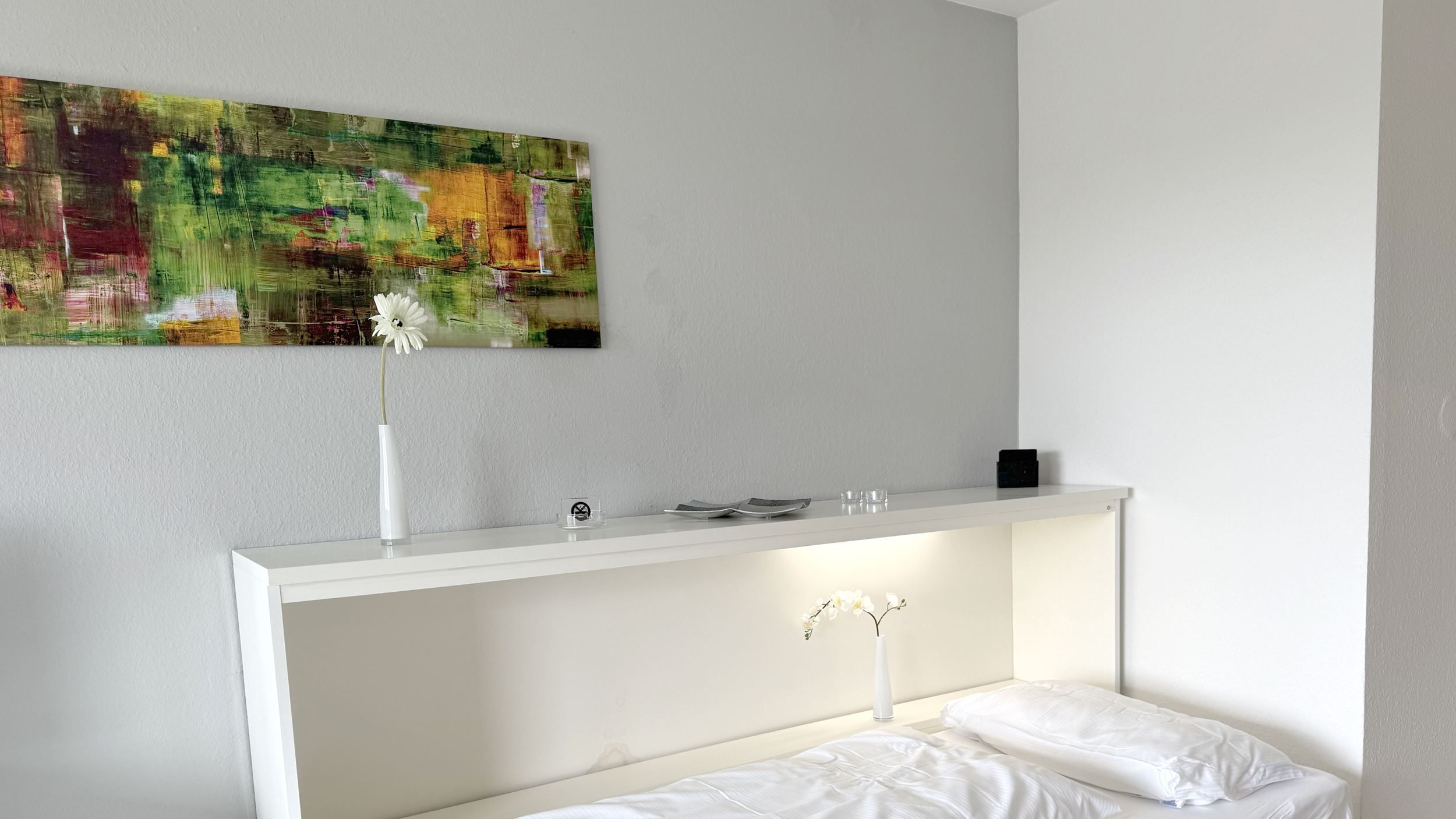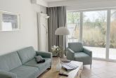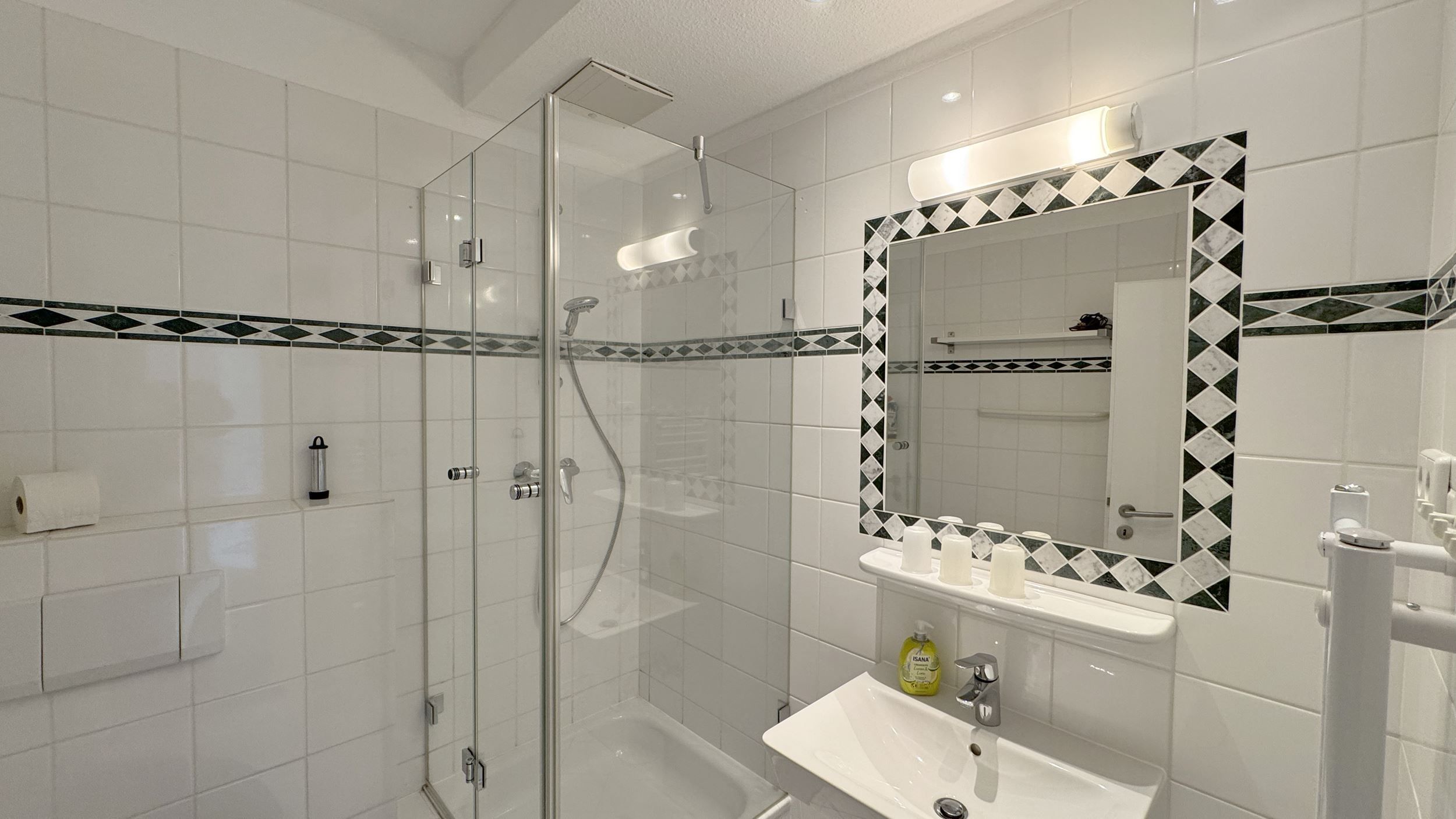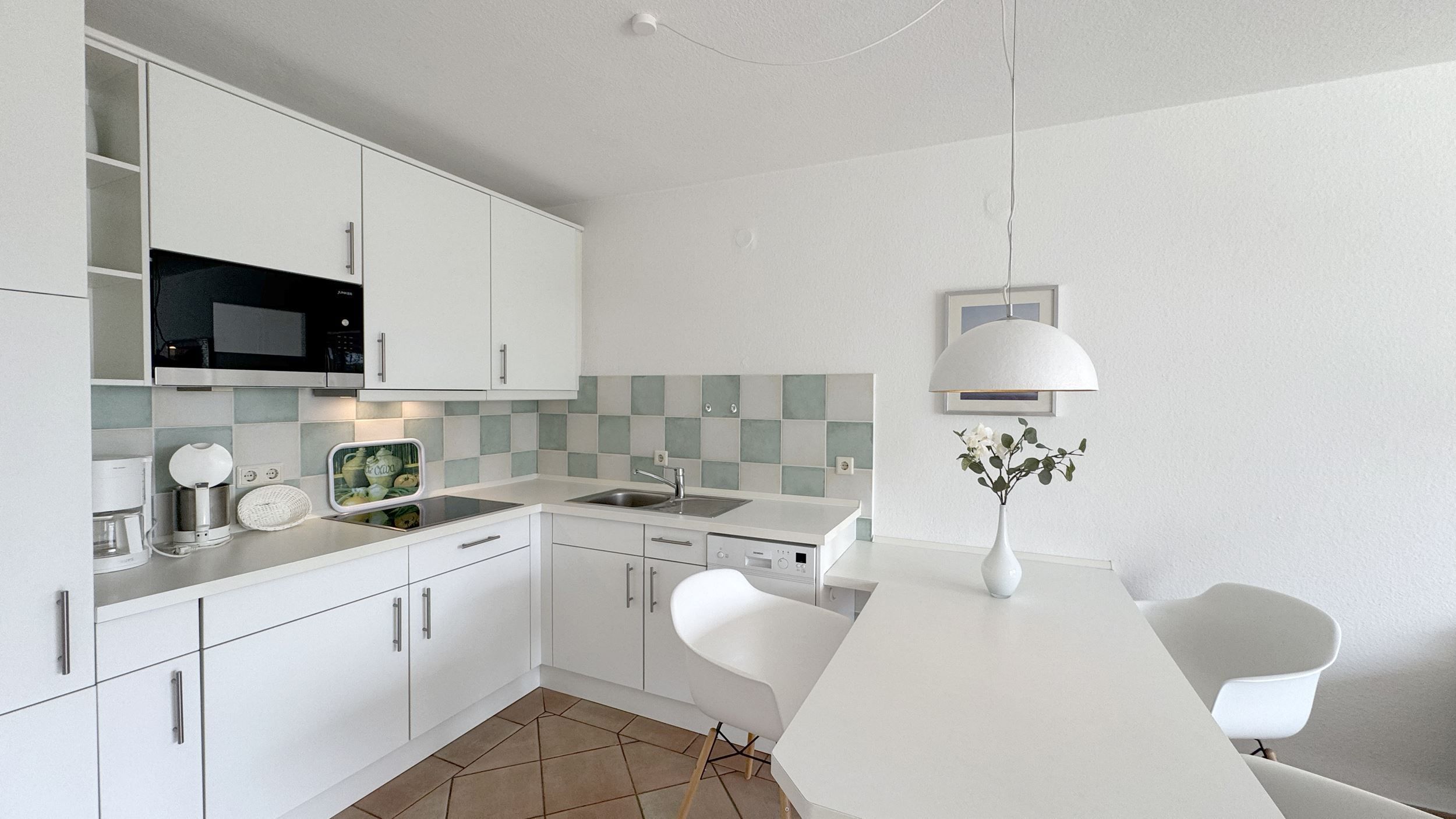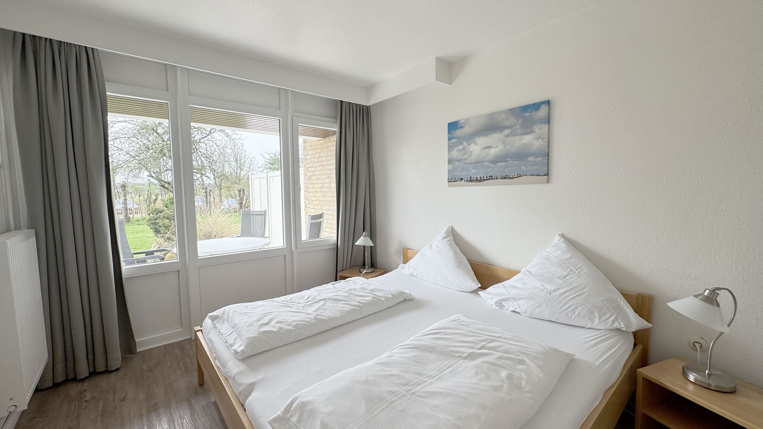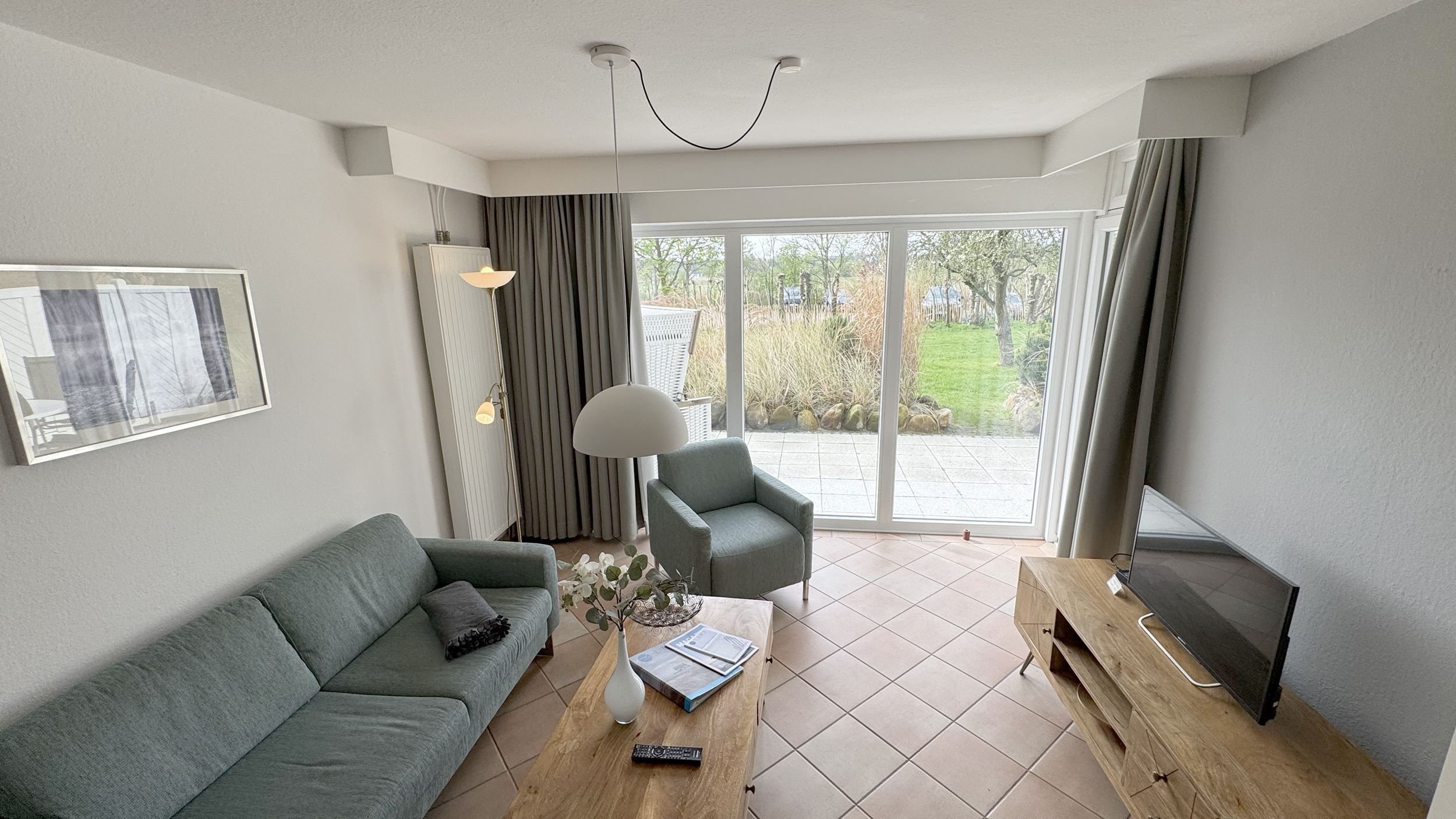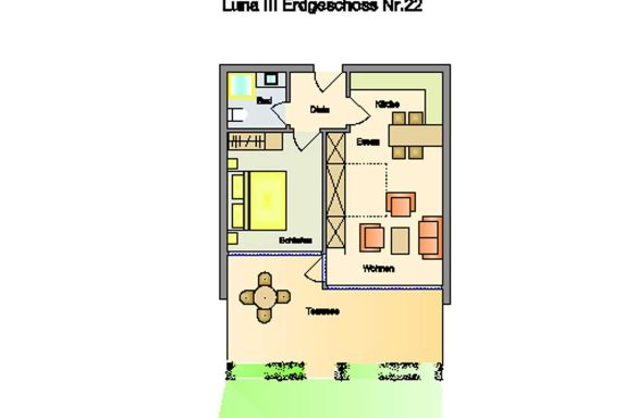 Die ca. 55 qm teilen sich folgendermaßen auf:Eingangsbereich mit Garderobe, offener Wohnraum mit Essbereich und integrierter Einbauküche,Einzelschrankbett (90x200cm,Matratze ), direkter Zugang zur Loggia und Garten, Schlafzimmer mit Doppelbett (180x200cm,getrennte Matratzen), 1 Duschbad mit WC und Waschbecken.