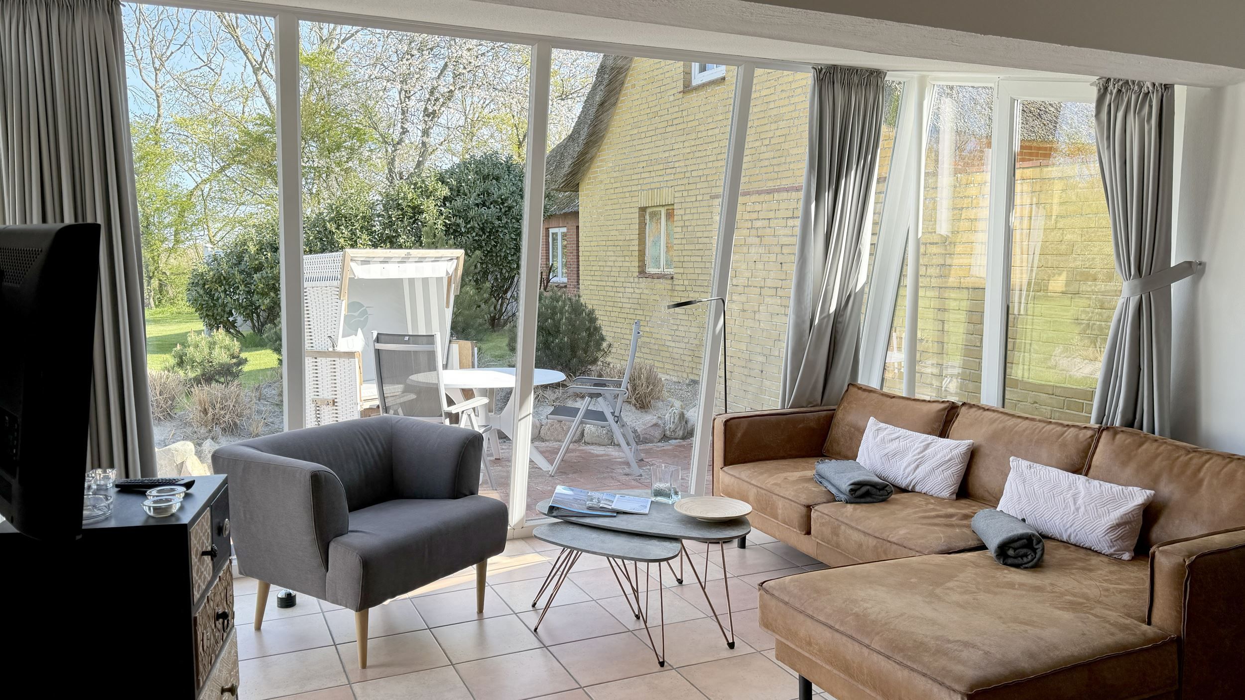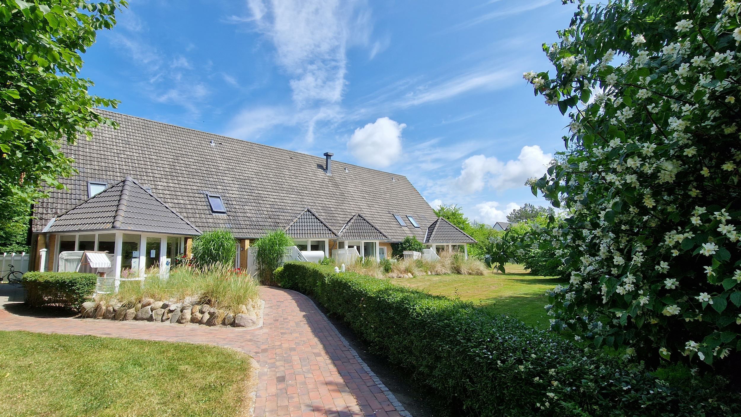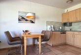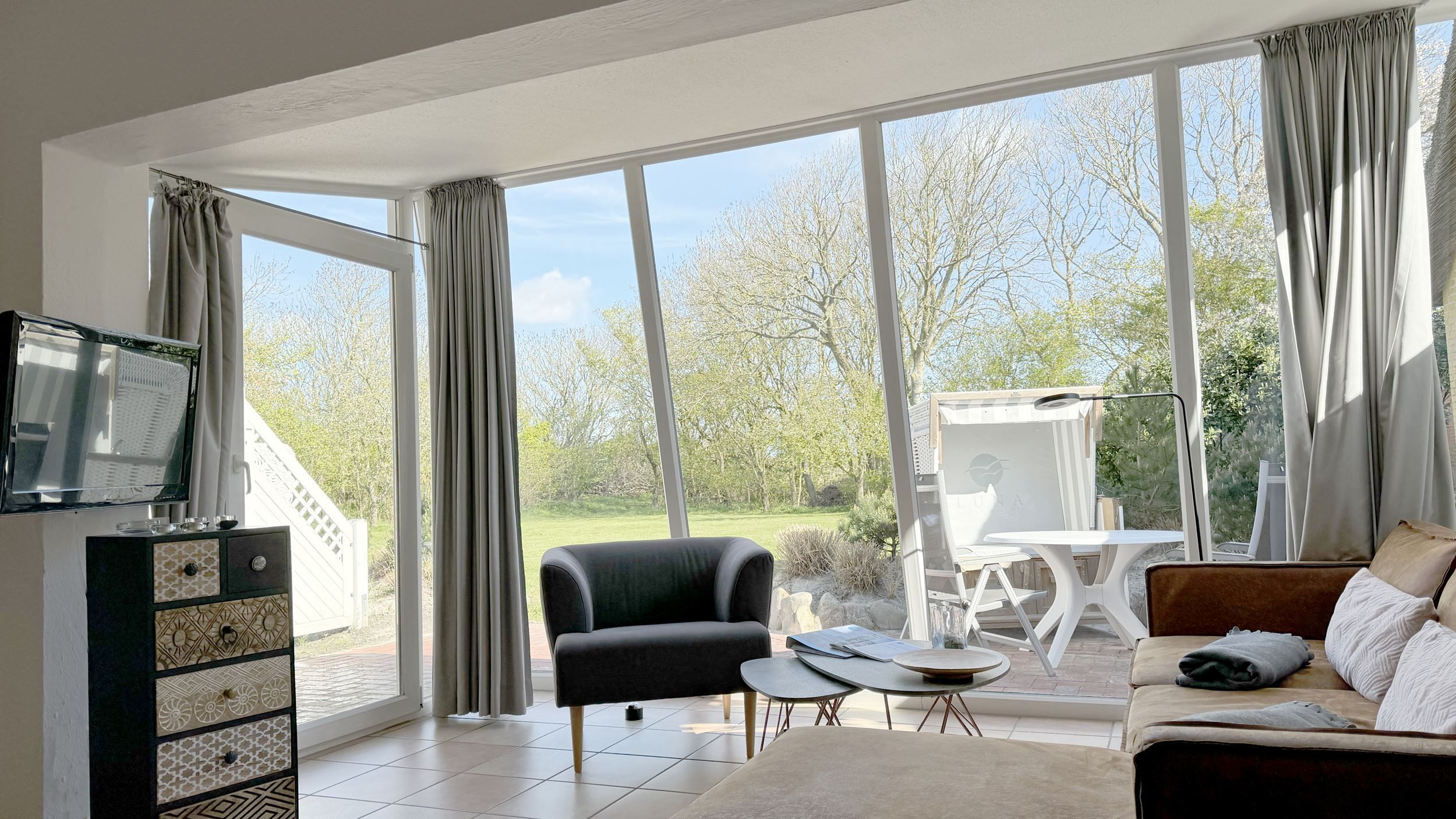 Die Wohnung 4 in der Anlage Luna I liegt im Erdgeschoss des Hauses. Sie ist 55qm groß und geeignet für bis zu 4 Personen. Der Eingangsbereich ist mit einer Garderobe ausgestattet. Das Schlafzimmer verfügt über ein Doppelbett (180x200cm, getrennte Matratzen). Weitere Personen können ein Schrankbett (180x200cm, Matratze nicht durchgehend) im Wohnbereich nutzen. Im Weiteren ist ein Duschbad mit Waschbecken und WC vorhanden. Der Wohn-und Essraum verfügt über eine offene integrierte Einbauküche, einen Esstisch und Sitzbereich mit Fernseher. W-Lan steht kostenlos zur Verfügung. Die Einrichtung ist modern und hochwertig. Der vorgelagerte Wintergarten sorgt für eine angenehme Helligkeit und ermöglicht einen Blick in die wunderschöne Grünanlage. Vom Wohnbereich aus gelangen Sie ebenerdig auf die südlich ausgerichtete Terrasse, die mit Gartenmöbeln und einem Strandkorb ausgestattet ist. Von hier aus blicken Sie in den Garten und auf die alten Obstbäume.