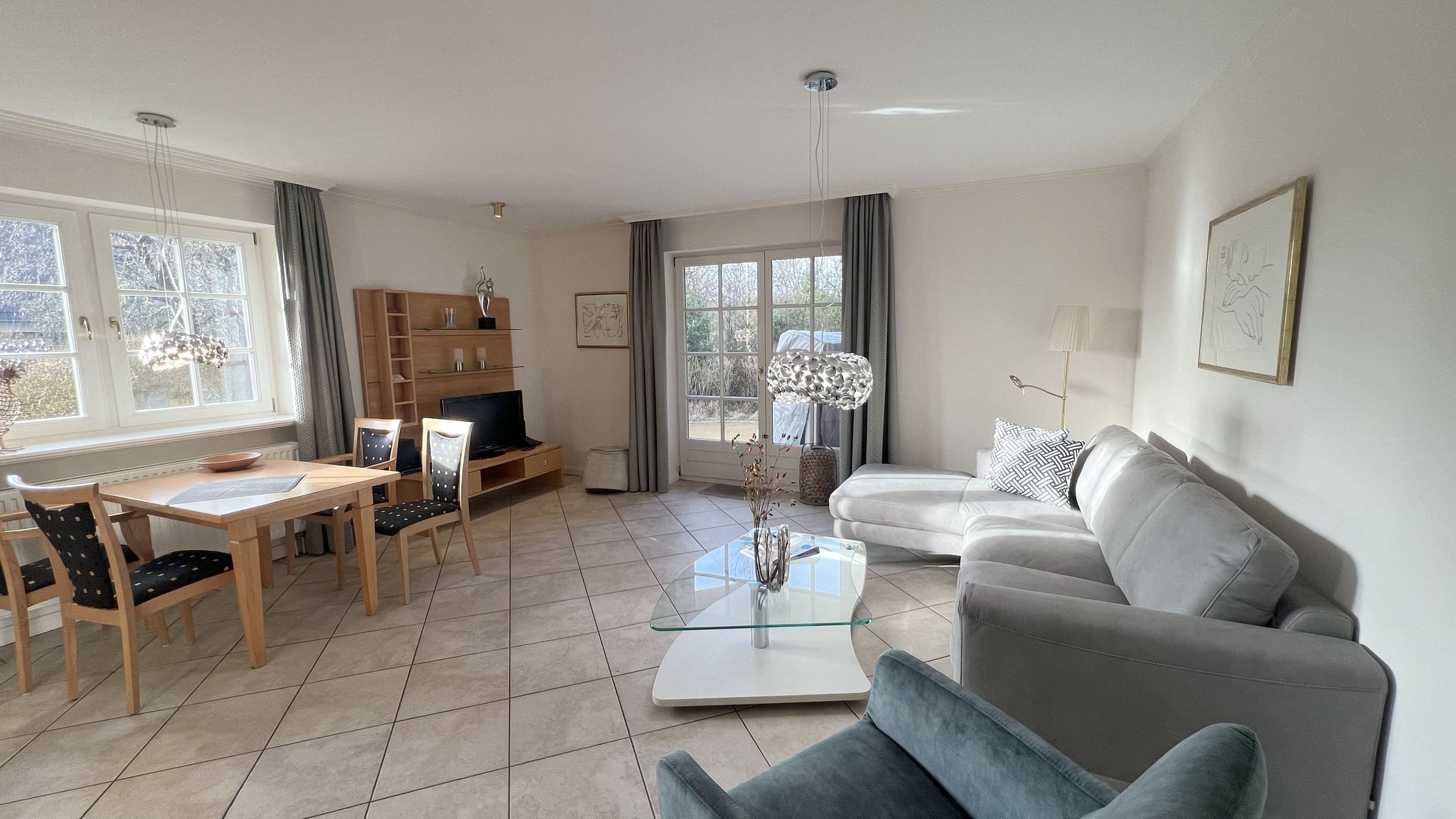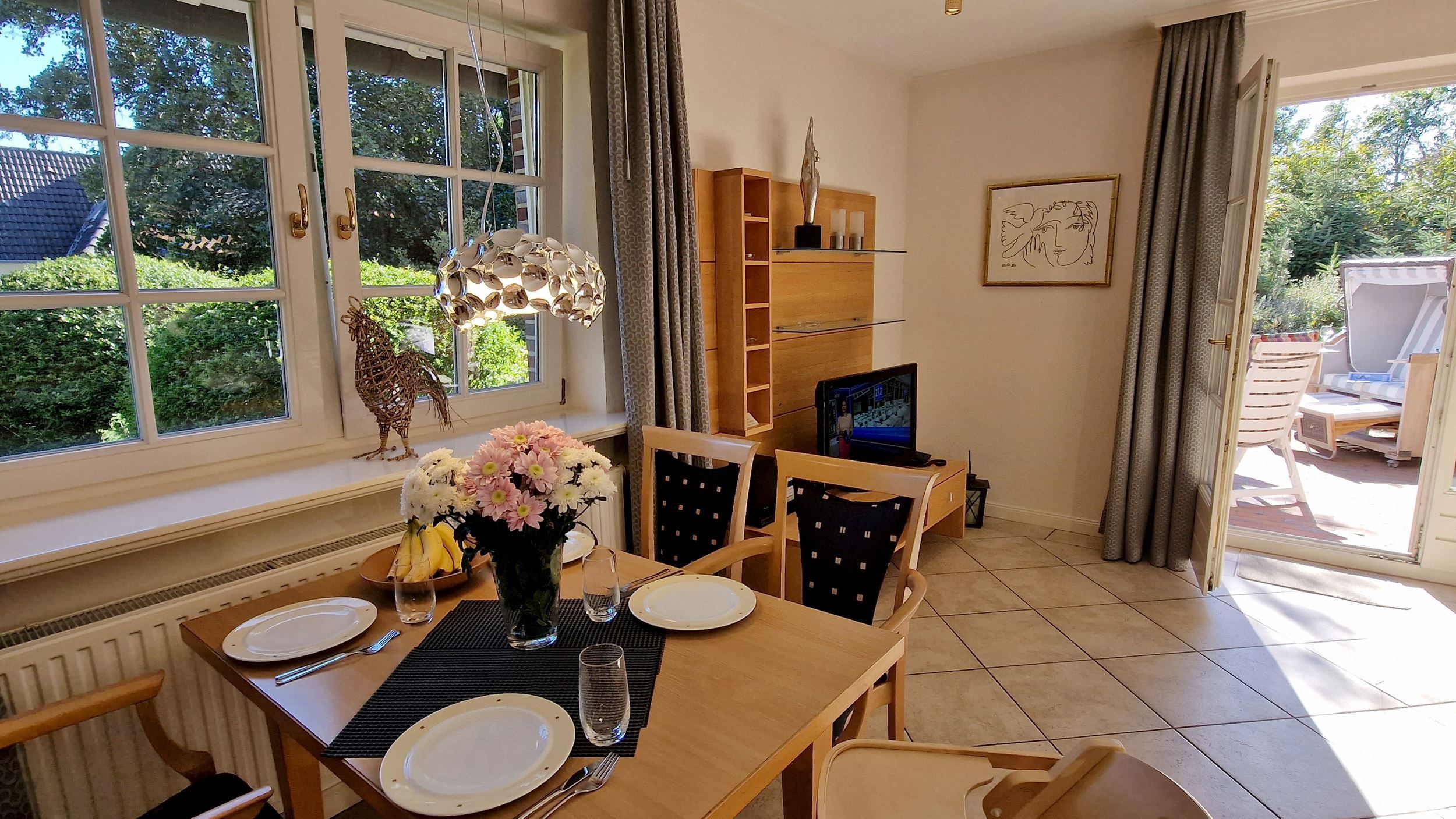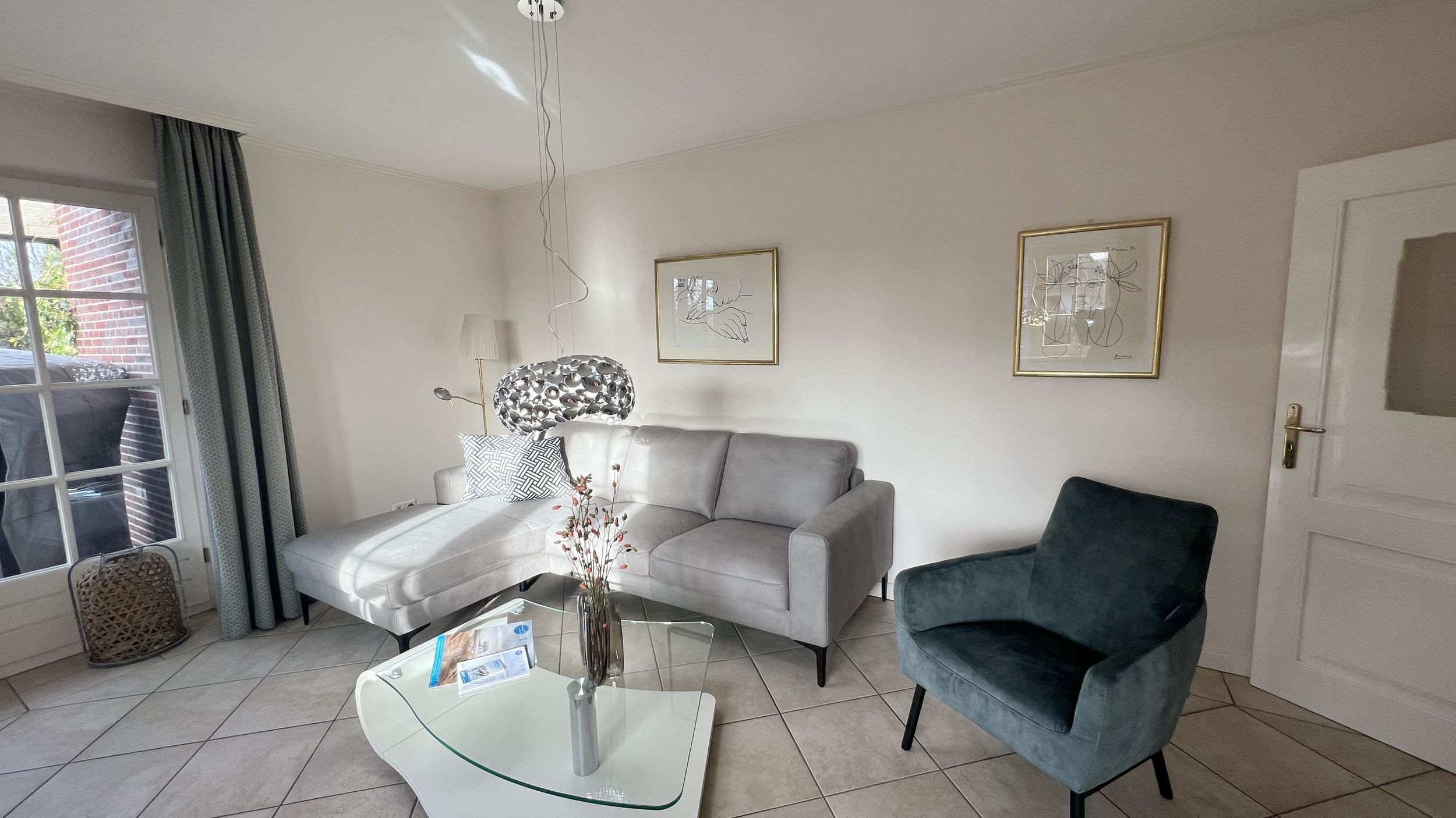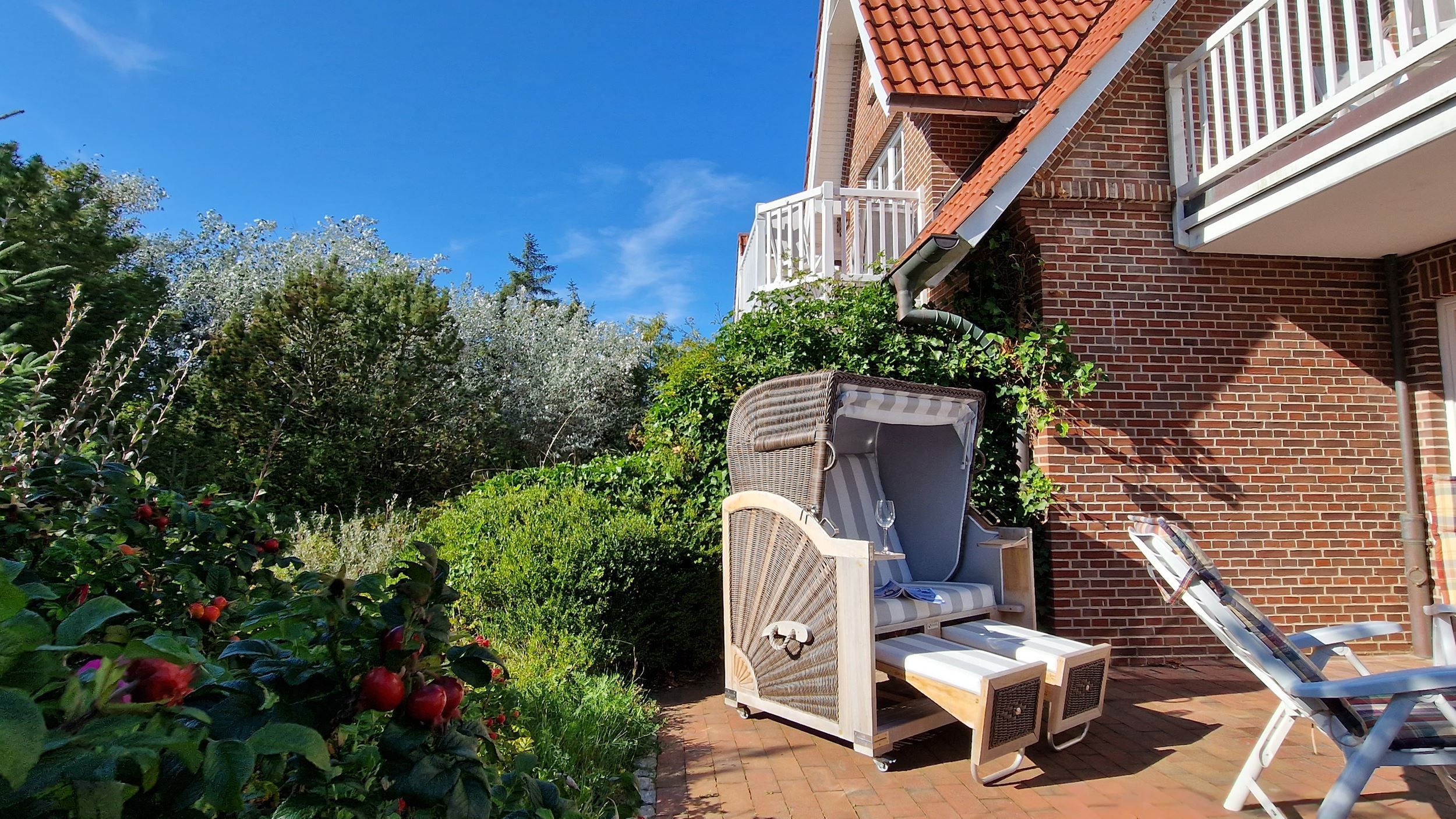 Die 85 qm große Ferienwohnung ist für 4 Pers. geplant und teilt sich wie folgt auf: Eingangsbereich; Eingangsdiele mit Garderobe; großzügiger Wohn-Essbereich mit direktem Zugang auf eine große, durch Friesenwälle und Gehölze abgeschirmte Terrasse mit Gartenmöbeln und einem Strandkorb. Zwei Schlafzimmer mit Doppelbetten, zwei Duschbäder/WC. Separate Küche. Im Untergeschoss des mittleren Einganges befindet sich eine Gemeinschaftssauna (Ruheraum, verschiede Duschen, Fußbäder) ,Fitnessraum, Tischtennis. Im Außenbereich: ein Spielplatz für die Kleinsten, Stellplatz, Fahrradständer.