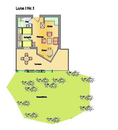 Die Wohnung 1, im Haus Luna I, liegt im Erdgeschoß und ist für 1 - 2 Personen ein herrliches Urlaubsquartier. Im Eingangsbereich finden Sie eine Garderobe und 1 Duschbad mit WC und Waschbecken. Der gemütliche Wohn-Essbereich verfügt über eine offene, umfangreich ausgestattete Küche, in der auch das Kochen im Urlaub Spaß macht. Der Essbereich befindet sich im hellen, vorgelagerten Wintergarten, wo Sie einen direkter Zugang zur Terrasse mit Strandkorb und Gartenmöbeln haben. Hier lässt es sich wunderbar in guter Nordseeluft entspannen. Erholsamen Schlaf bekommen Sie im Schlafzimmer mit 2 Einzelbetten (90x200cm).