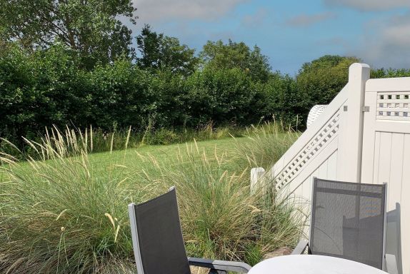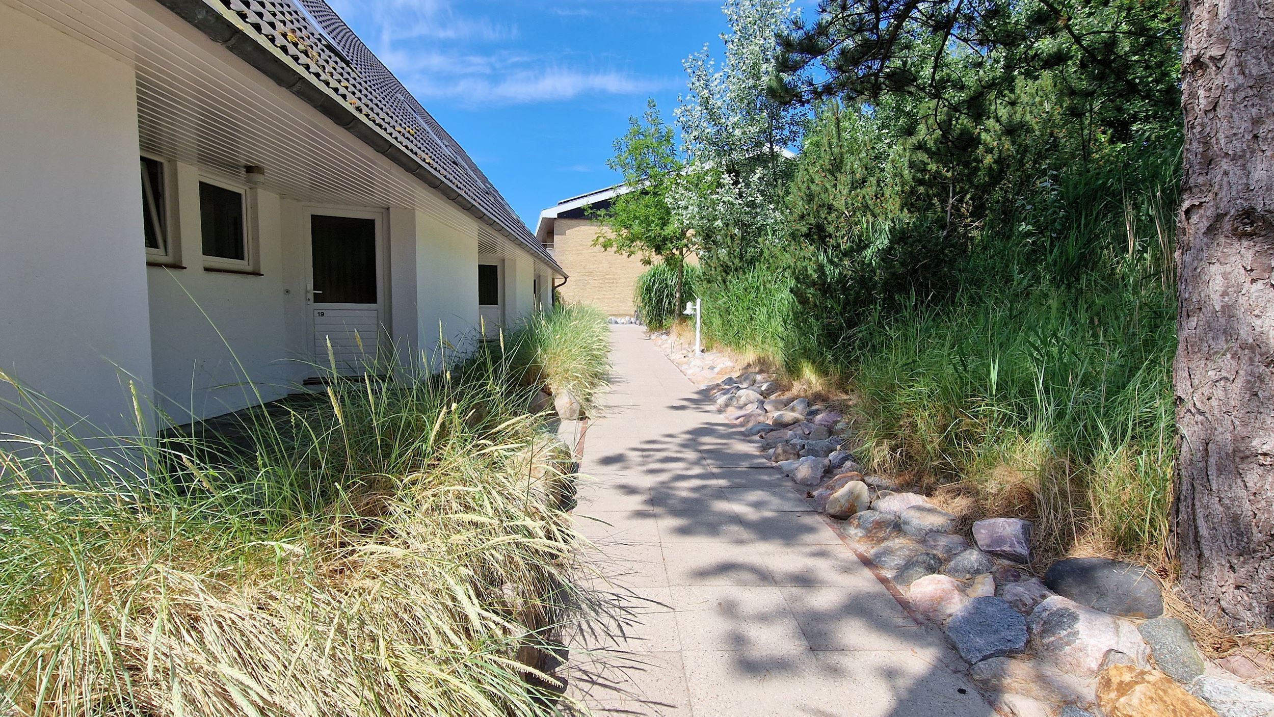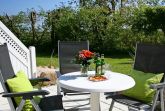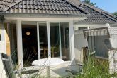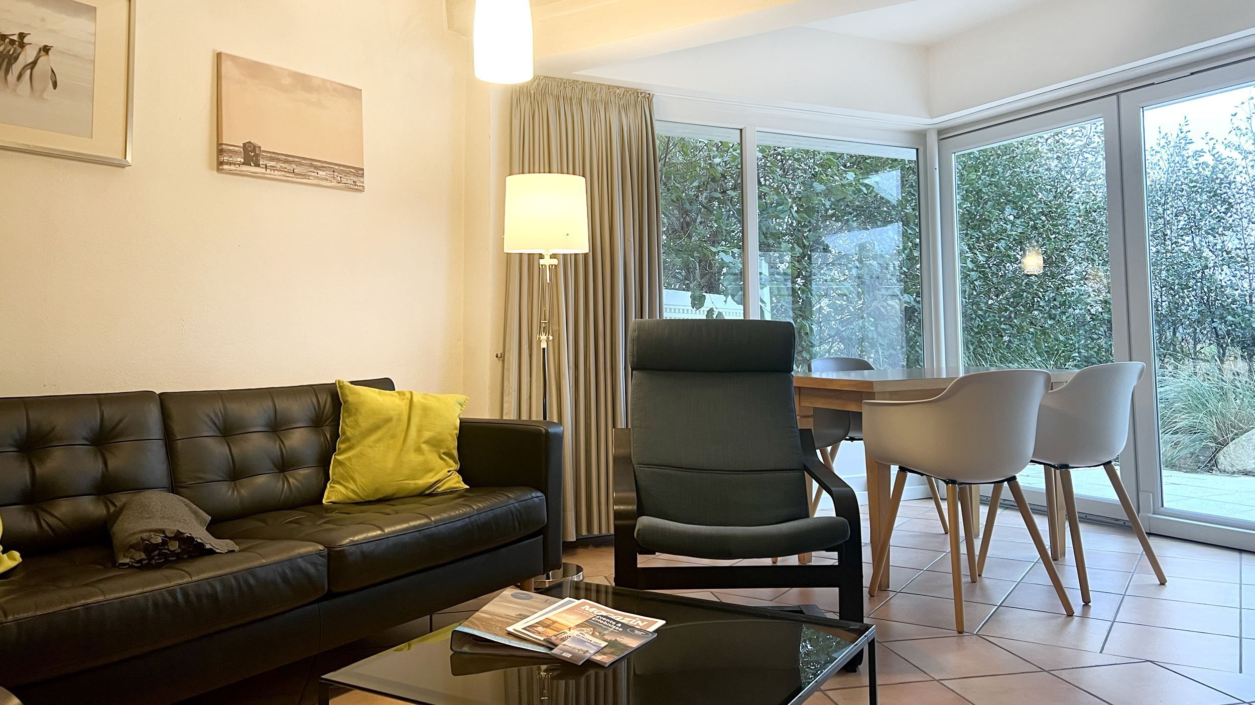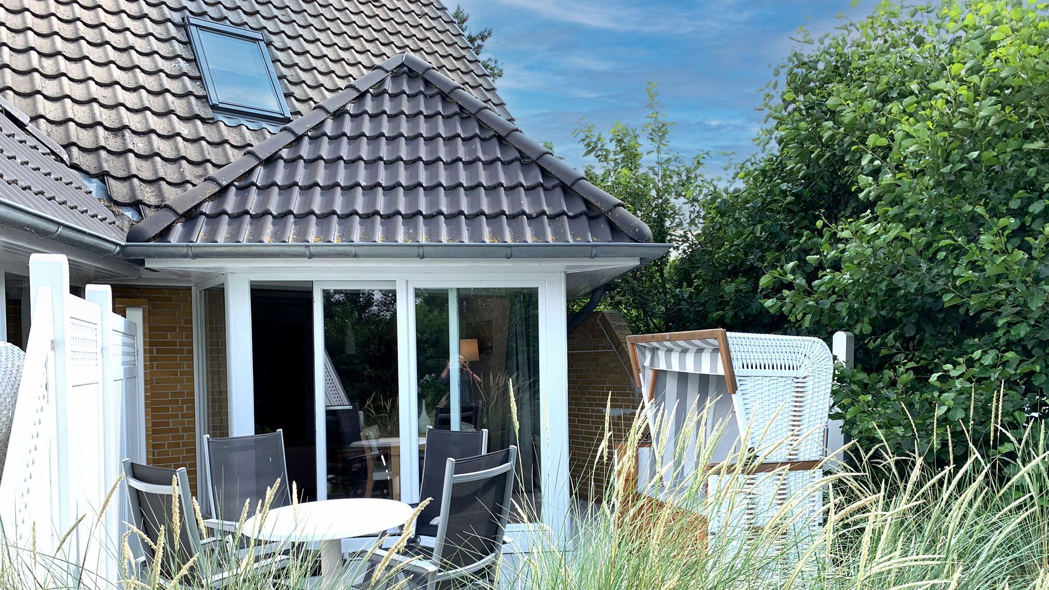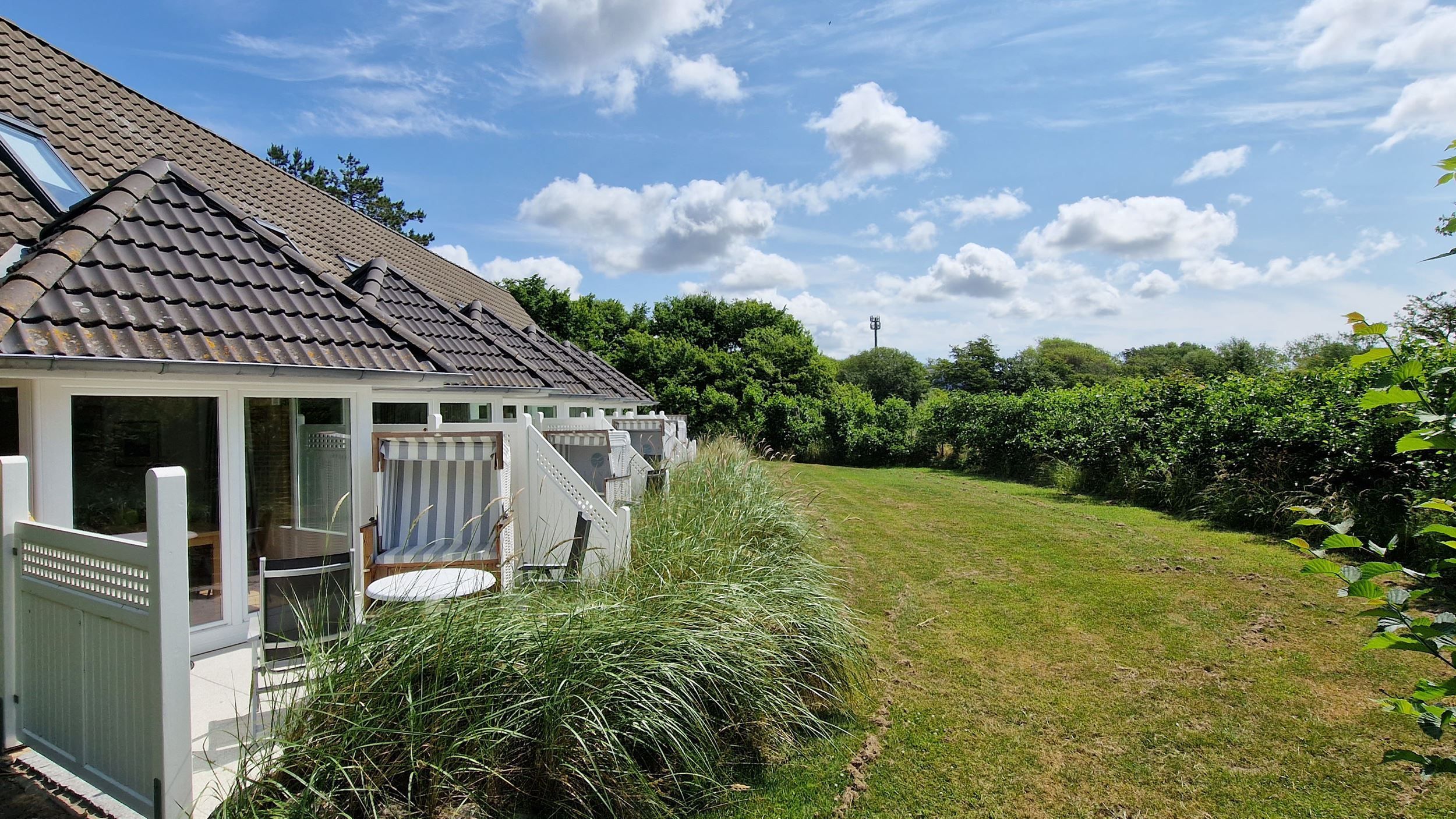 Die ca. 70 qm teilen sich folgendermaßen auf: Im Erdgeschoss befindet sich die Eingangsdiele mit einer gradläufigen Treppe nach oben zu den beiden Schlafzimmern. 1 Schlafraum mit Doppelbett (180x200cm mit getrennten Matratzen), ein Schlafraum mit 2 Einzelbetten (90x200cm). Das Zustellen eines Kinderreisebettes oder Hochstuhles ist kein Problem. Abgehend von der Eingangsdiele der Wohn-Essraum mit voll ausgestatteter Küchenzeile, gemütlicher Sitzecke und Essecke im raumhoch verglasten Wintergarten, direkter Zugang zur mit einer kleinen Sanddüne eingefassten Terrasse und Garten. Das Duschbad ist ausgestattet mit Dusche, WC, Waschtisch und Außenfenster.