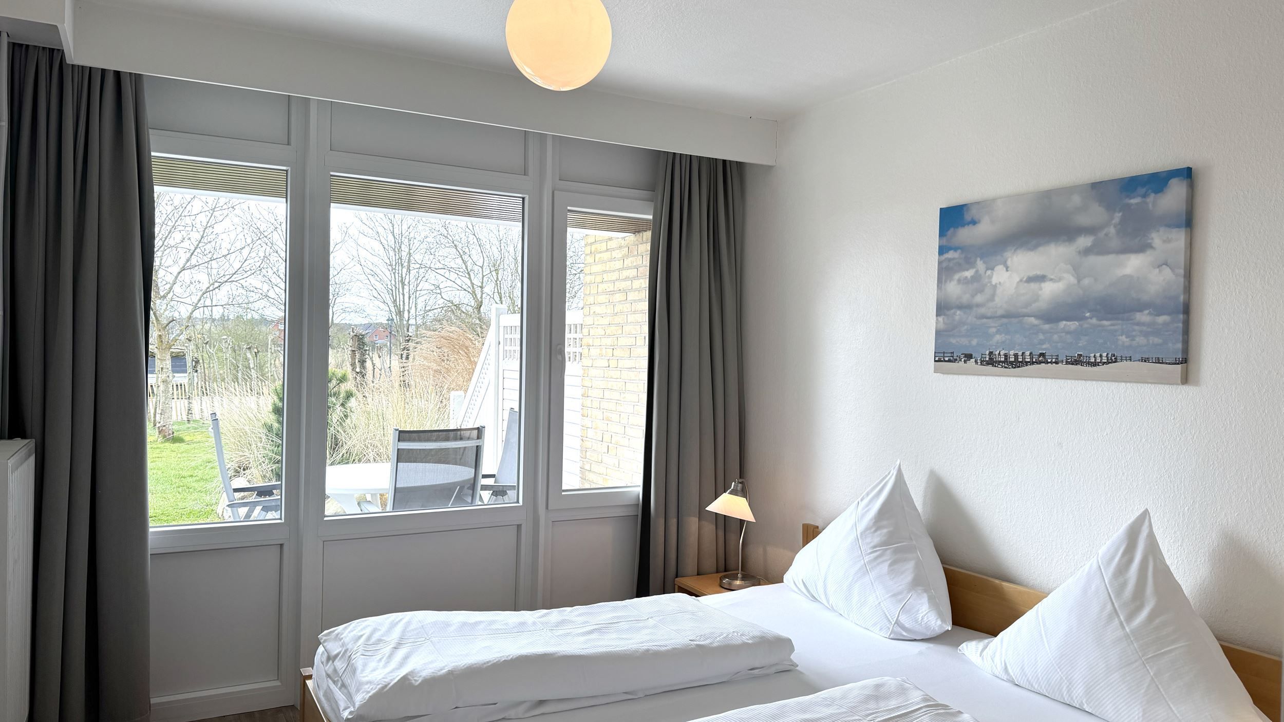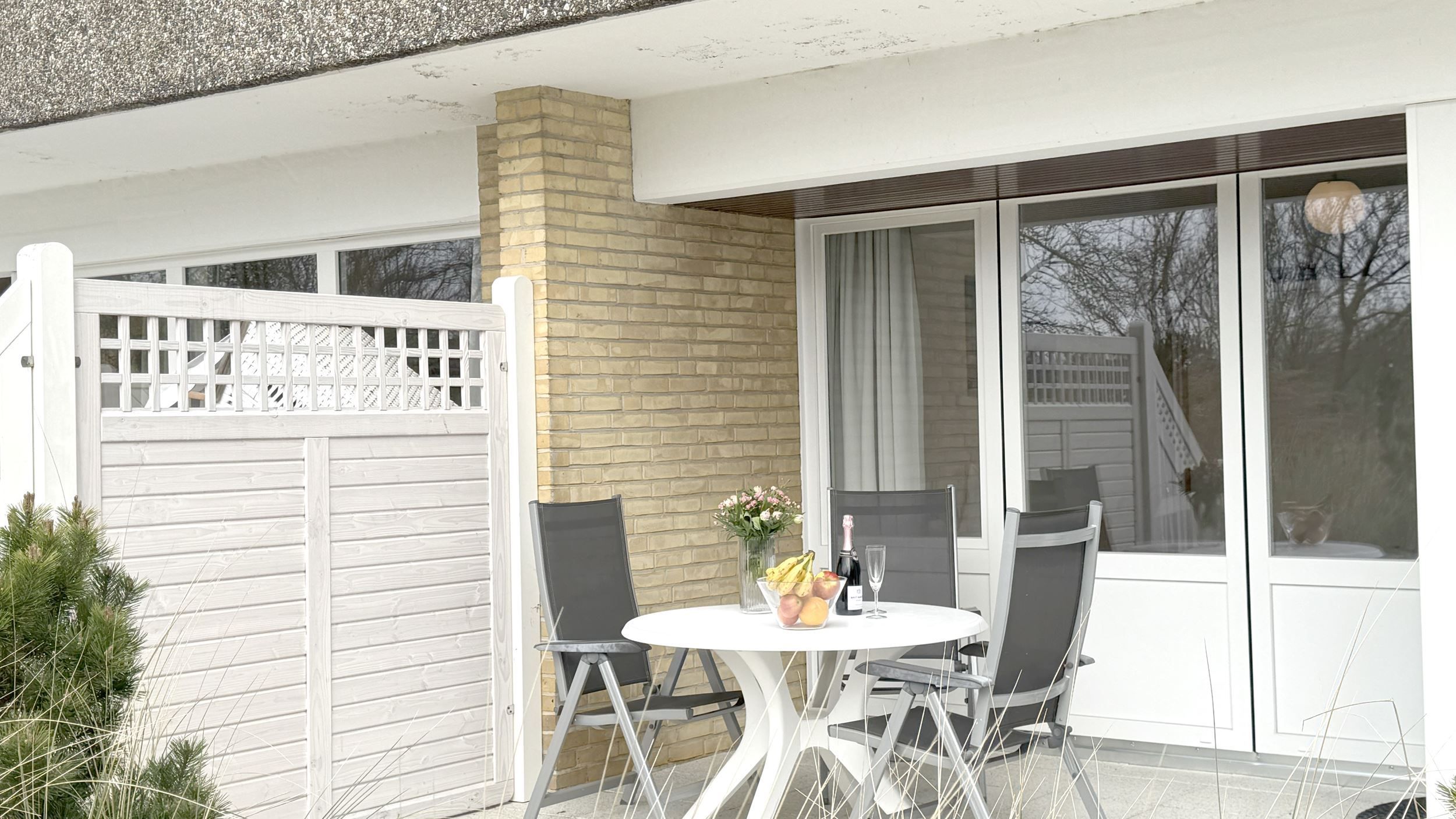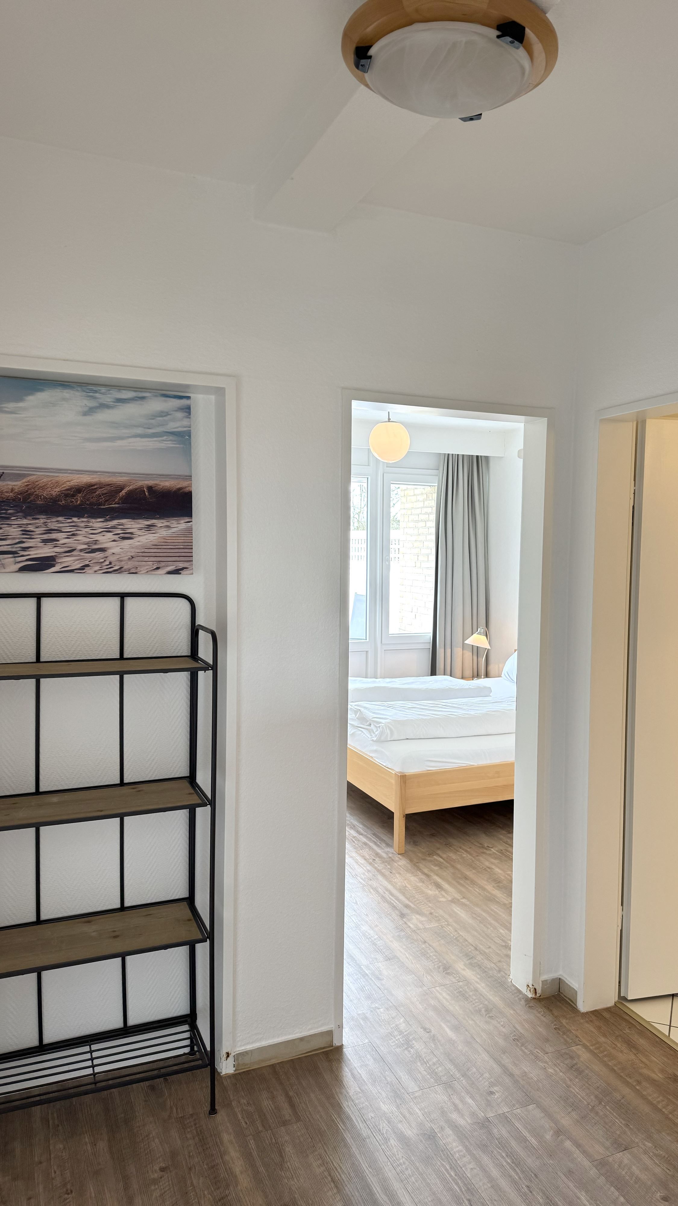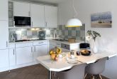 Die ca. 55 qm teilen sich folgendermaßen auf: Eingangsbereich mit Garderobe, offener Wohnraum mit Essbereich und integrierter Einbauküche,Einzelschrankbett (90x200cm,Matratze ), direkter Zugang zur Terrasse und Garten, Schlafzimmer mit Doppelbett (180x200cm,getrennte Matratzen), 1 Duschbad mit WC und Waschbecken.