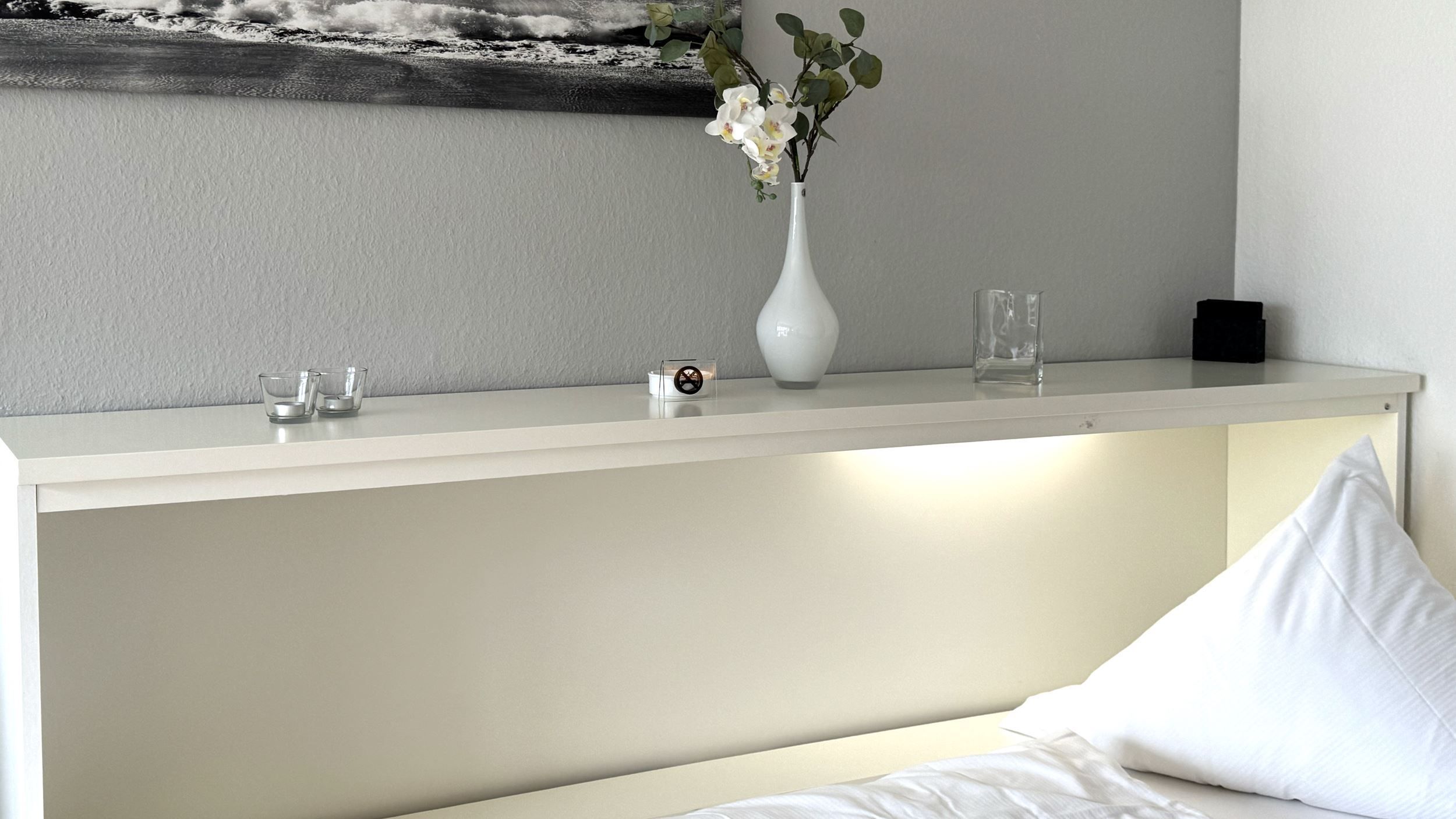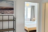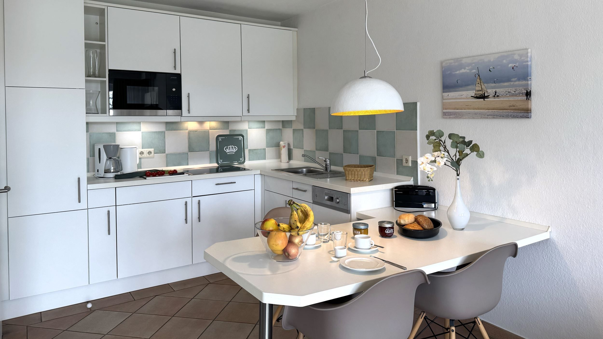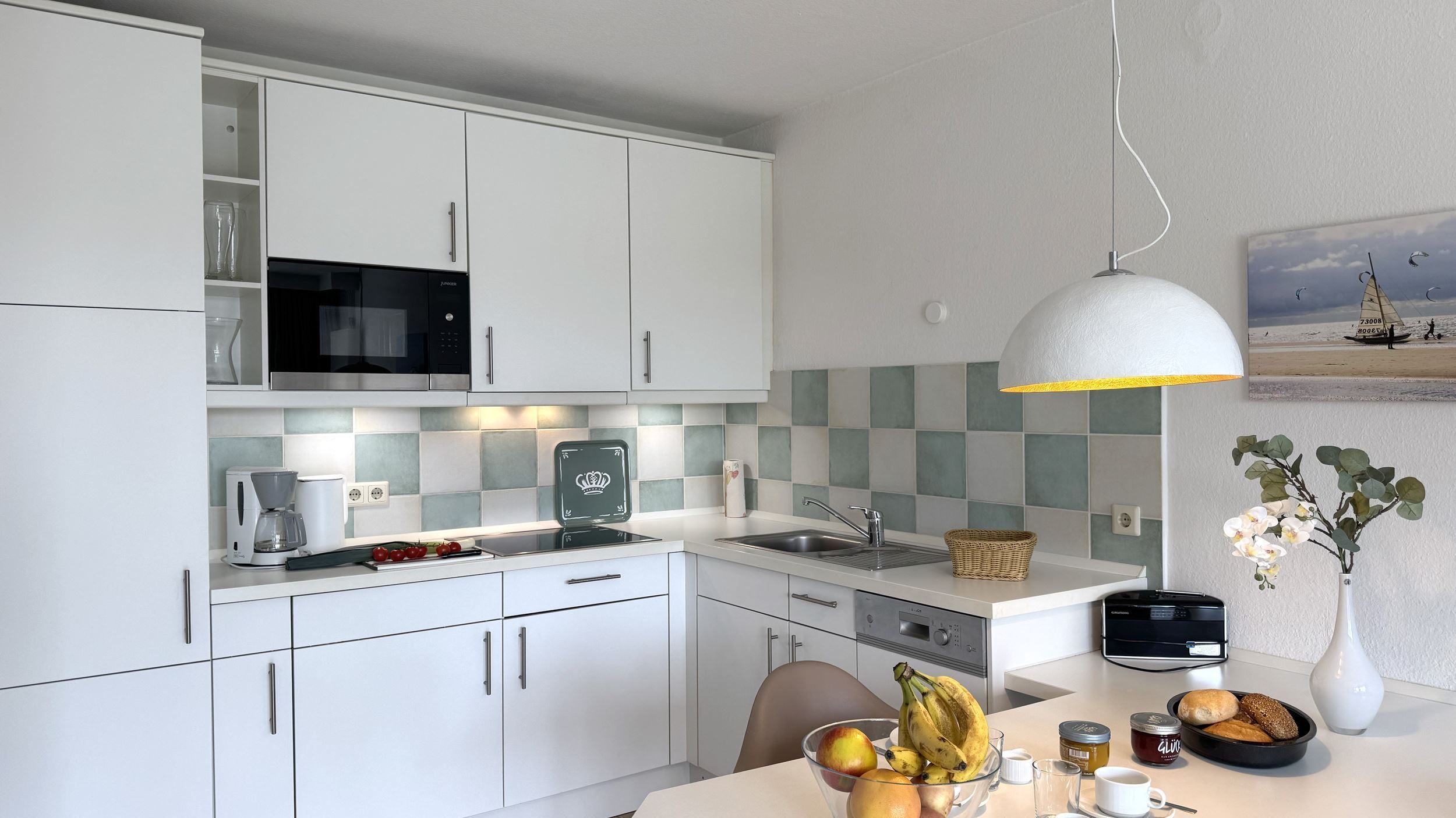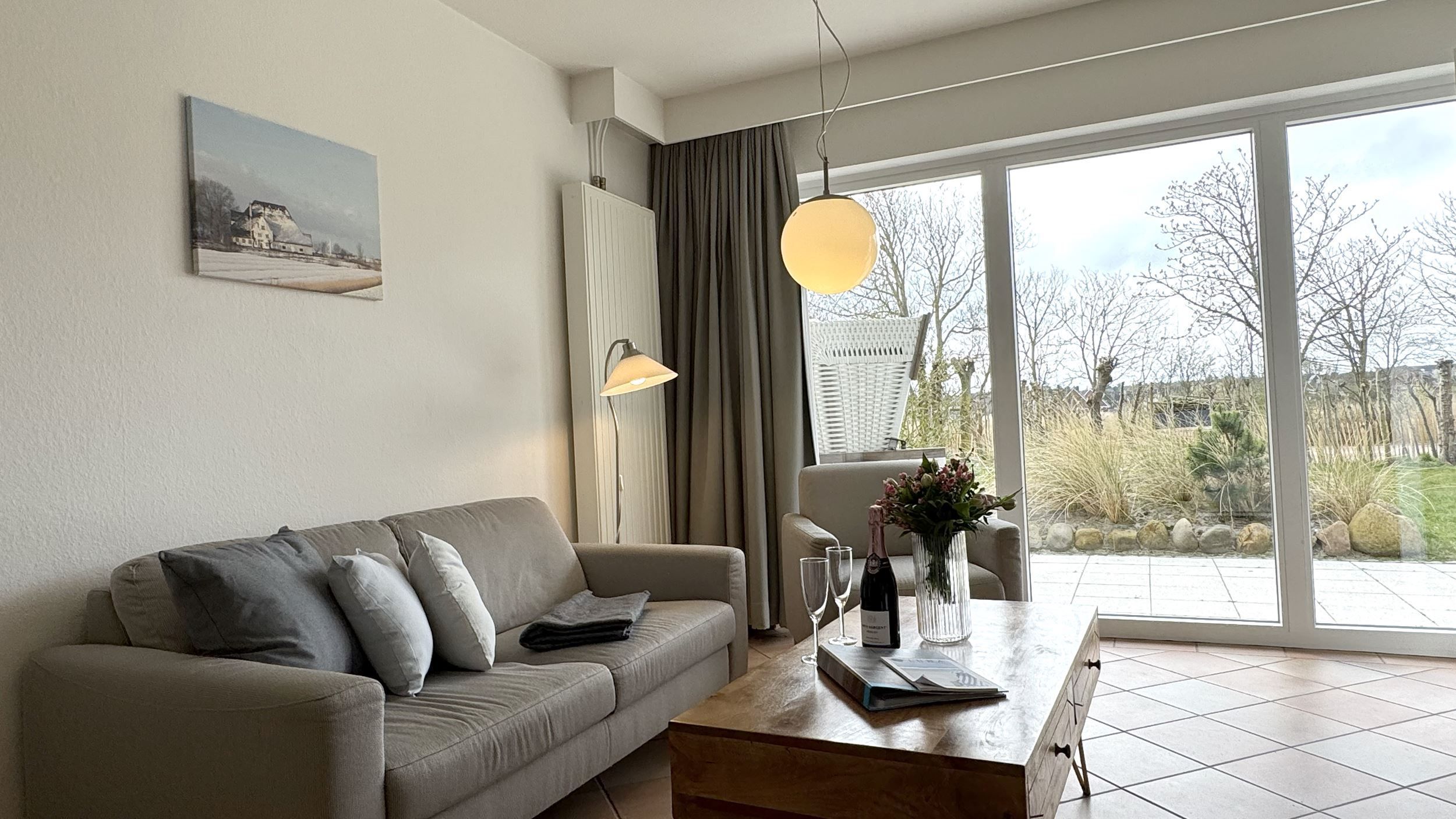 Die ca. 55 qm teilen sich folgendermaßen auf: Eingangsbereich mit Garderobe, offener Wohnraum mit Essbereich und integrierter Einbauküche,Einzelschrankbett (90x200cm,Matratze ), direkter Zugang zur Terrasse und Garten, Schlafzimmer mit Doppelbett (180x200cm,getrennte Matratzen), 1 Duschbad mit WC und Waschbecken.
