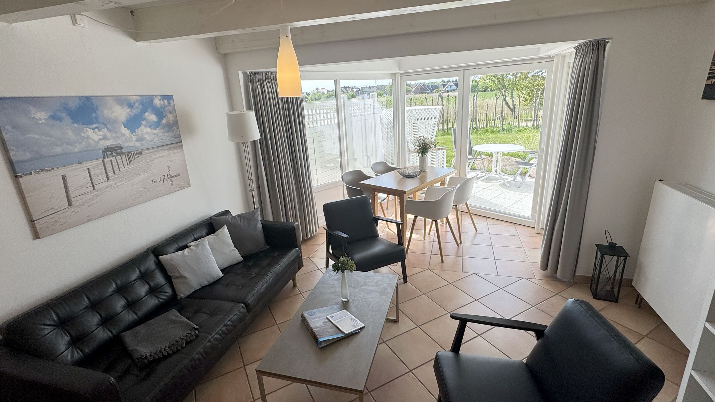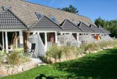 Die ca. 70 qm teilen sich folgendermaßen auf: Im Erdgeschoss befindet sich die Eingangsdiele mit einer gradläufigen Treppe nach oben zu den beiden Schlafzimmern. 1 Schlafraum mit Doppelbett (180x200cm mit getrennten Matratzen), ein Schlafraum mit 2 Einzelbetten (90x200cm). Das Zustellen eines Kinderreisebettes oder Hochstuhles ist kein Problem. Abgehend von der Eingangsdiele der Wohn-Essraum mit voll ausgestatteter Küchenzeile, gemütlicher Sitzecke und Essecke im raumhoch verglasten Wintergarten, direkter Zugang zur mit einer kleinen Sanddüne eingefassten Terrasse und Garten. Das Duschbad ist ausgestattet mit Dusche, WC, Waschtisch und Außenfenster.