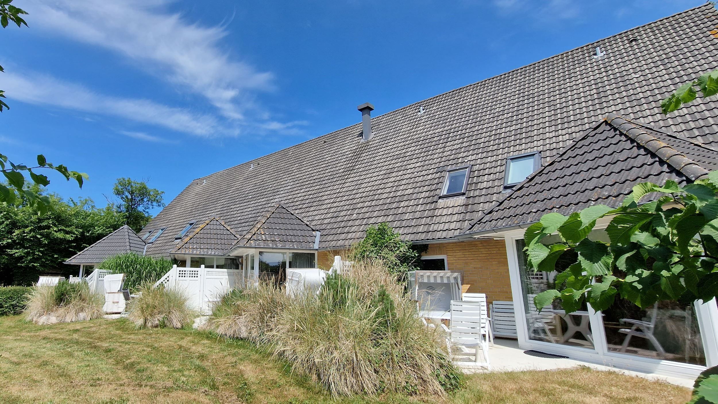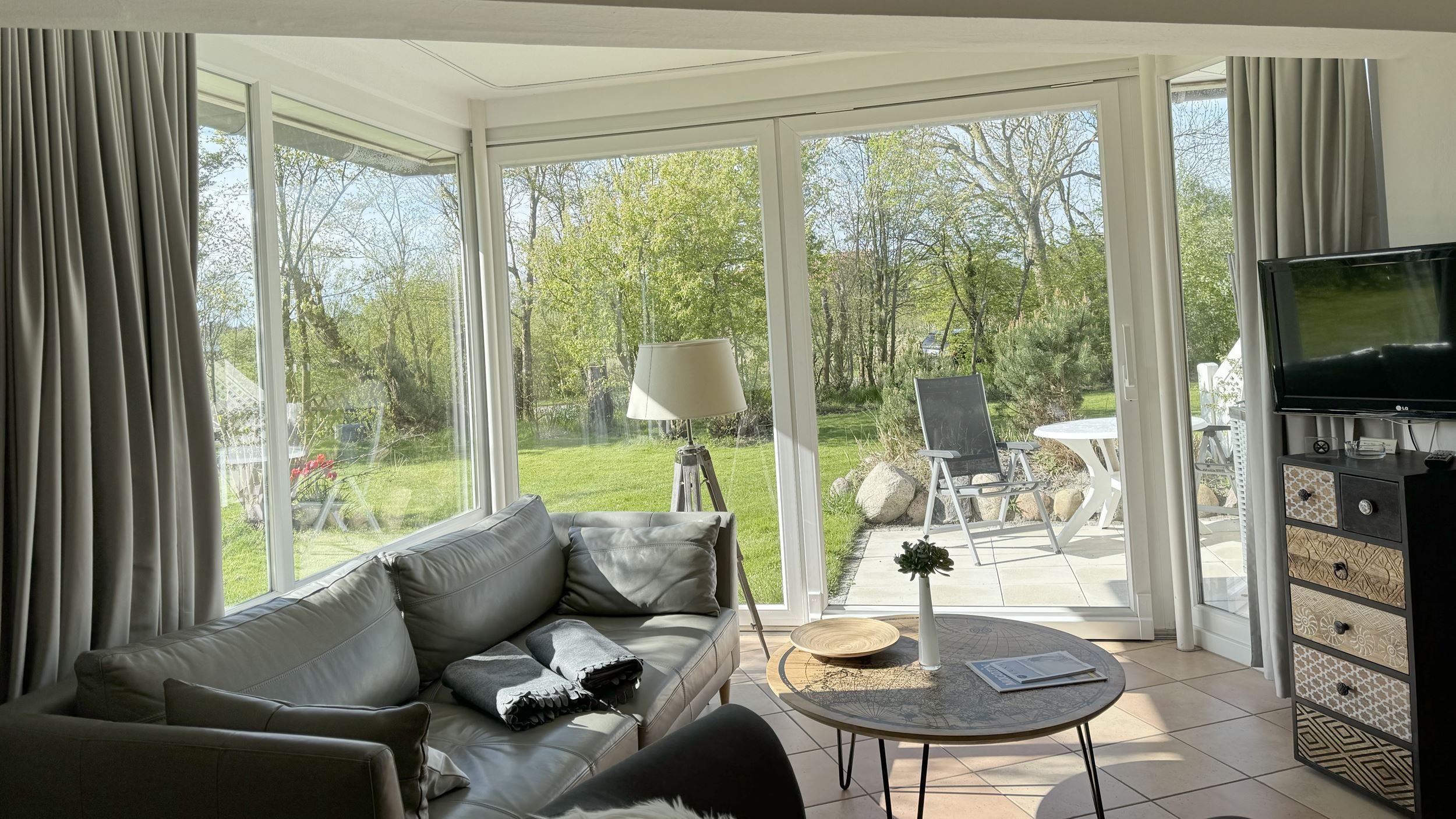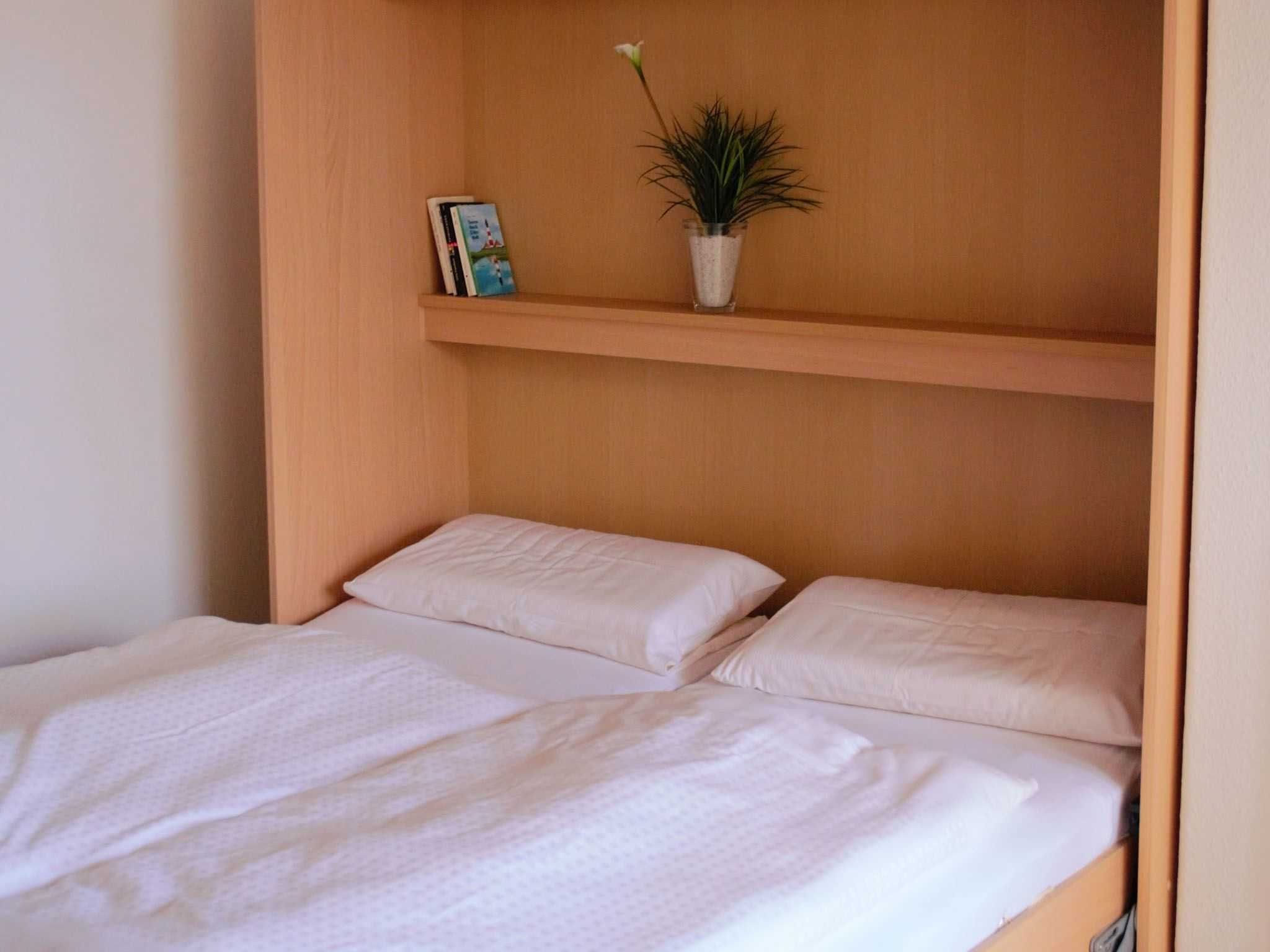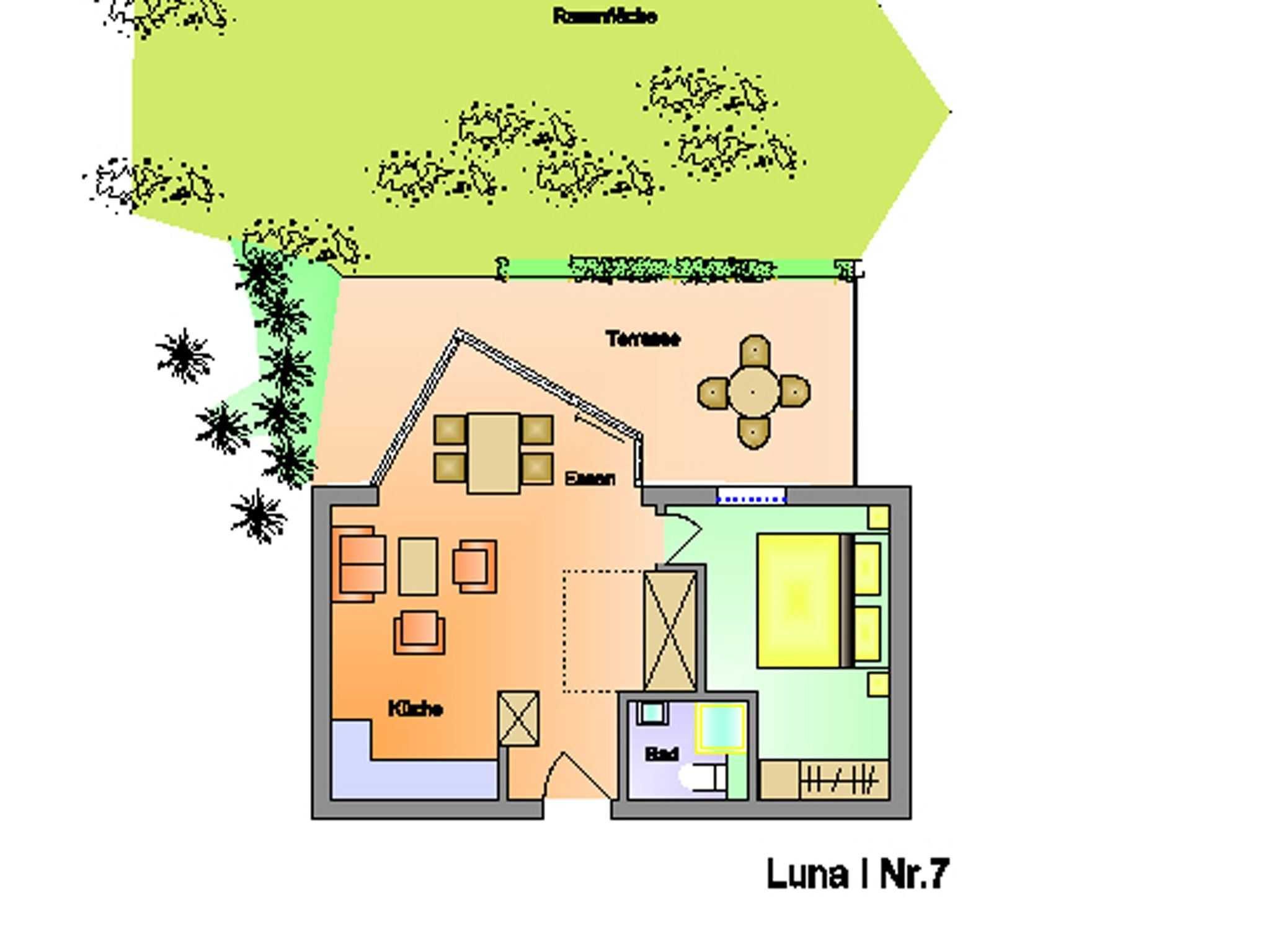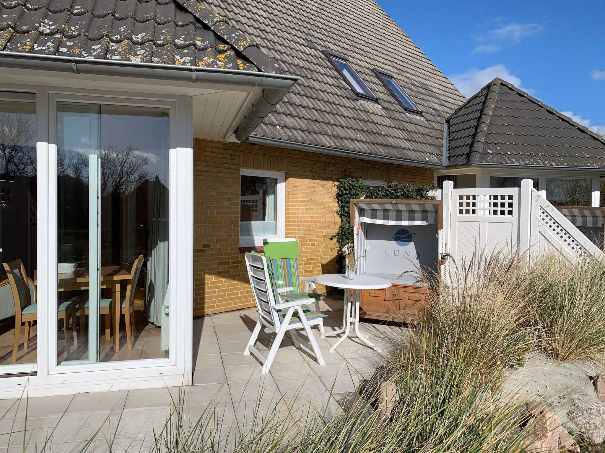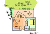 Die Wohnung 3 in der Anlage Luna I liegt im Erdgeschoss des Hauses. Sie ist 55qm groß und geeignet für bis zu 4 Personen. Der Eingangsbereich ist mit einer Garderobe ausgestattet. Das Schlafzimmer verfügt über ein Doppelbett (180x200cm, getrennte Matratzen). Weitere Personen können ein Schrankbett (180x200cm, Matratze nicht durchgehend) im Wohnbereich nutzen. Im Weiteren ist ein Duschbad mit Waschbecken und WC vorhanden. Der Wohn-Essbereich verfügt über eine offene, umfangreich ausgestattete Küche. Im Wohn-Esszimmer befinden sich ein Esstisch und ein Sitzbereich mit Fernseher. WLAN steht kostenlos zur Verfügung. Die Einrichtung ist modern und hochwertig. Der vorgelagerte Wintergarten sorgt für eine angenehme Helligkeit und ermöglicht einen Blick in die wunderschöne Grünanlage. Vom Wohnbereich aus gelangen Sie ebenerdig auf die Südterrasse, die mit Gartenmöbeln und einem Strandkorb ausgestattet ist.