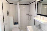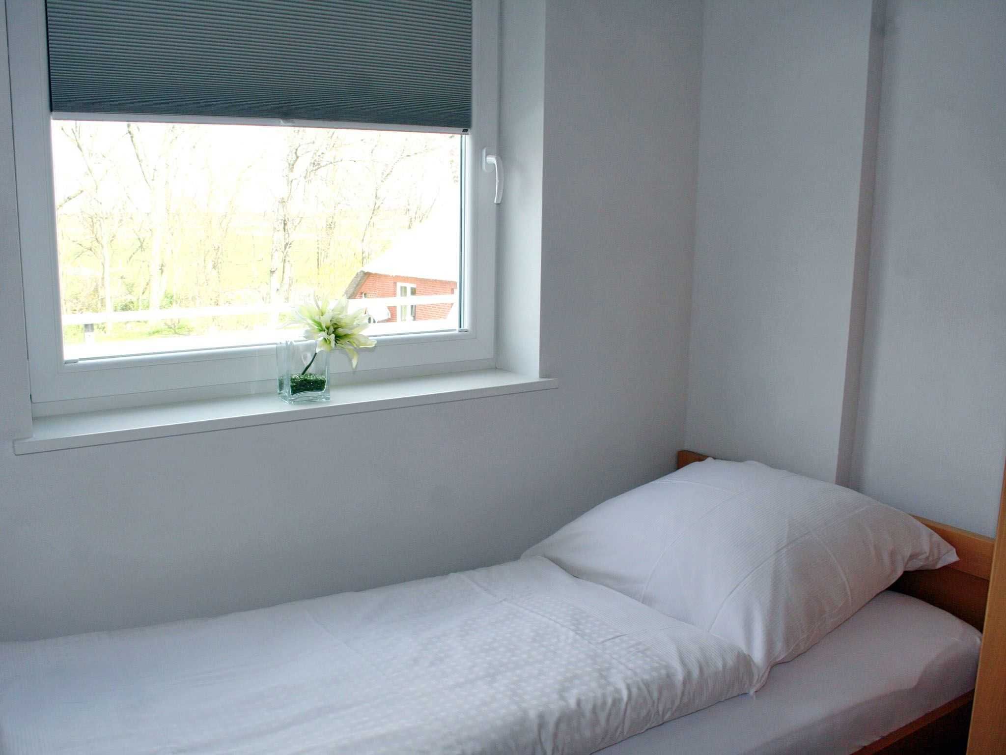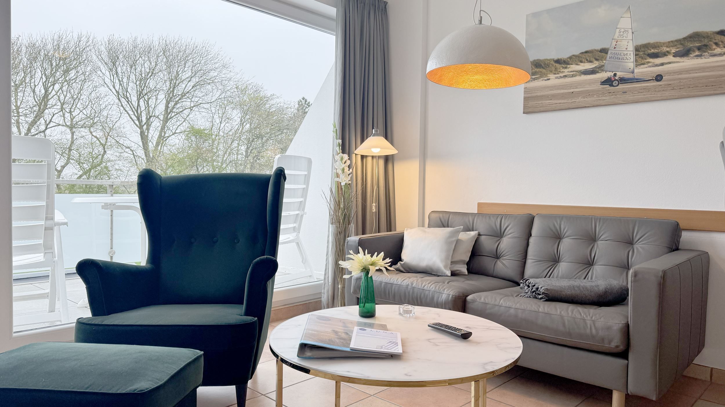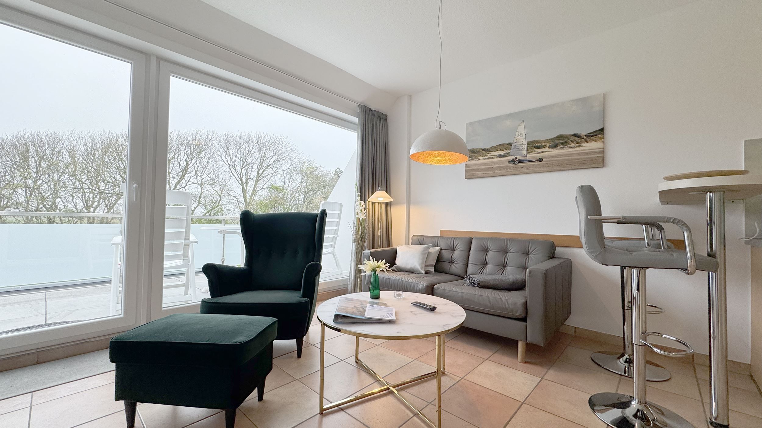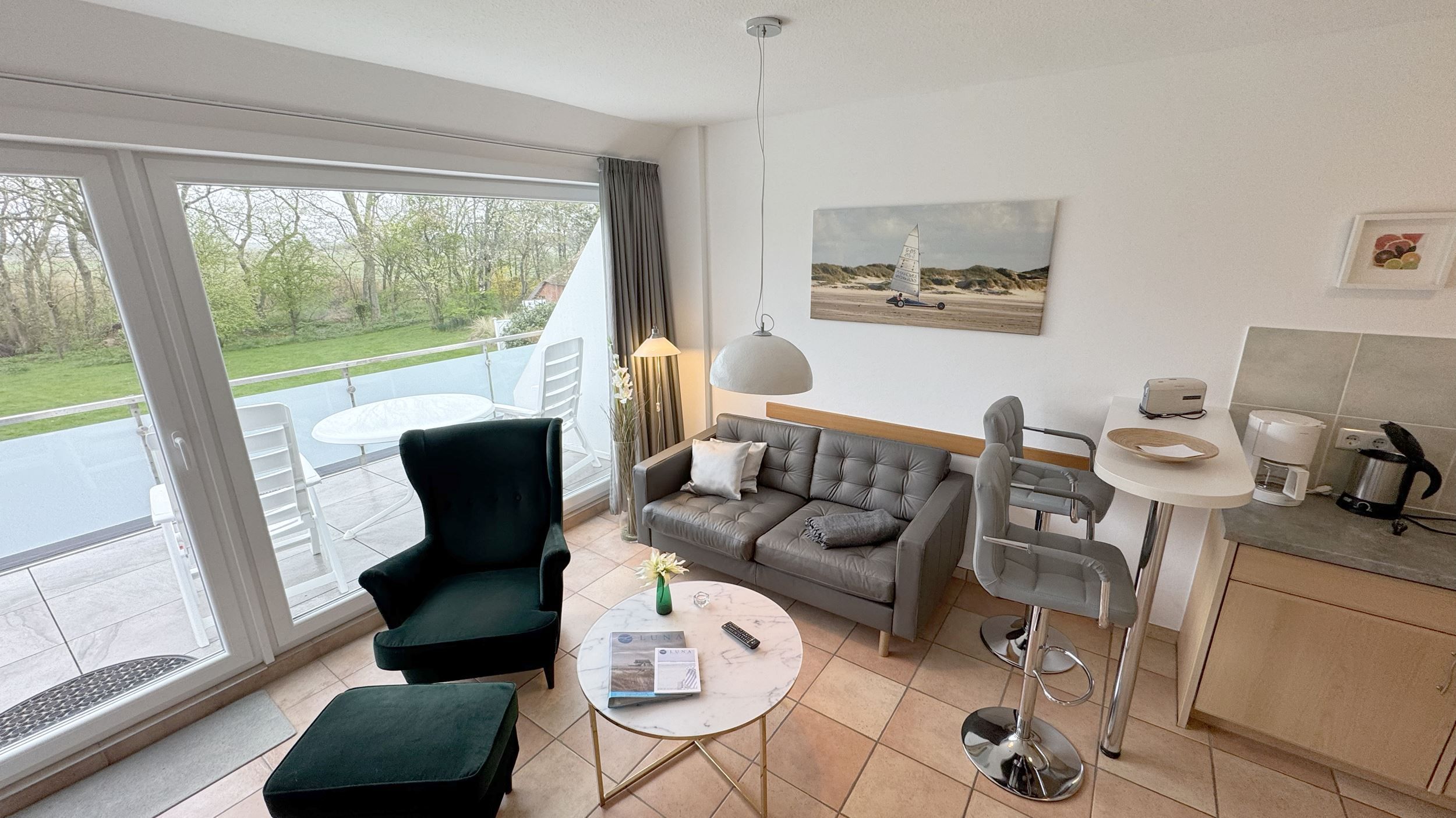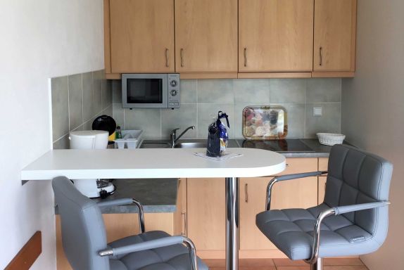 Die Wohnung 11 in der Anlage Luna I liegt im Obergeschoss des Hauses. Sie ist 40qm groß und geeignet für bis zu 2 Personen. Der Eingangsbereich ist mit einer Garderobe ausgestattet. Es gibt ein Schlafzimmer mit zwei Einzelbetten und Kleiderschrank. Des weiteren ist ein Duschbad mit Waschbecken und WC vorhanden. Der Wohn-Essbereich verfügt über eine offene umfangreich ausgestattete Küche. Hieran schließt sich ein Stehtisch mit zwei Barhockern als Essbereich an. Im Wohnraum befindet sich eine gemütliche Sitzecke mit Fernseher. WLAN steht kostenlos zur Verfügung. Die Einrichtung ist modern und geschmackvoll gewählt. Die gesamte Wohnung ist durch ihren Bodenbelag mit Designerparkett und Fliesen geeignet für Allergiker. Vom Wohnbereich aus gelangen Sie auf den Balkon der Wohnung, der mit Gartenmöbeln ausgestattet ist und einen Blick in die wunderschöne Grünanlage mit Obstwiese bietet.