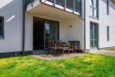 Zu der ruhig gelegenen Ferienwohnung gehört eine Terrasse mit angrenzender Rasenfläche.