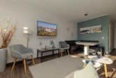 Das lichtdurchflutete Wohnzimmer mit dem angrenzendem Südbalkon ist mit einer gemütlichen Schlafcouch (140 cm breit) und einem großen Fernseher, der an der Wand befestigt ist, ausgestattet.