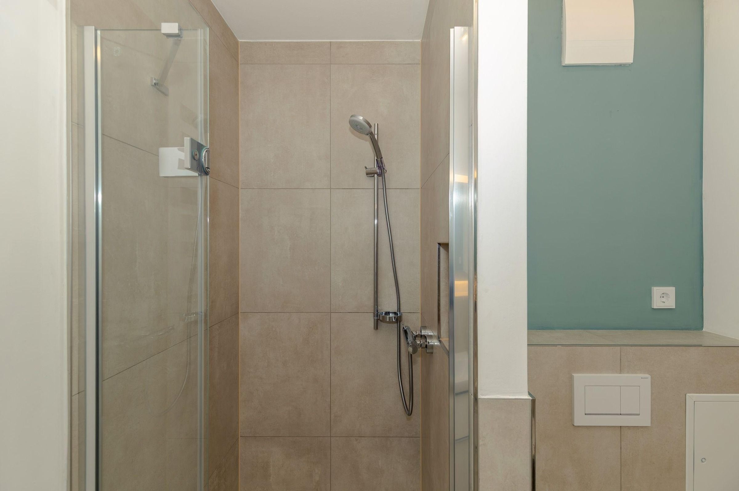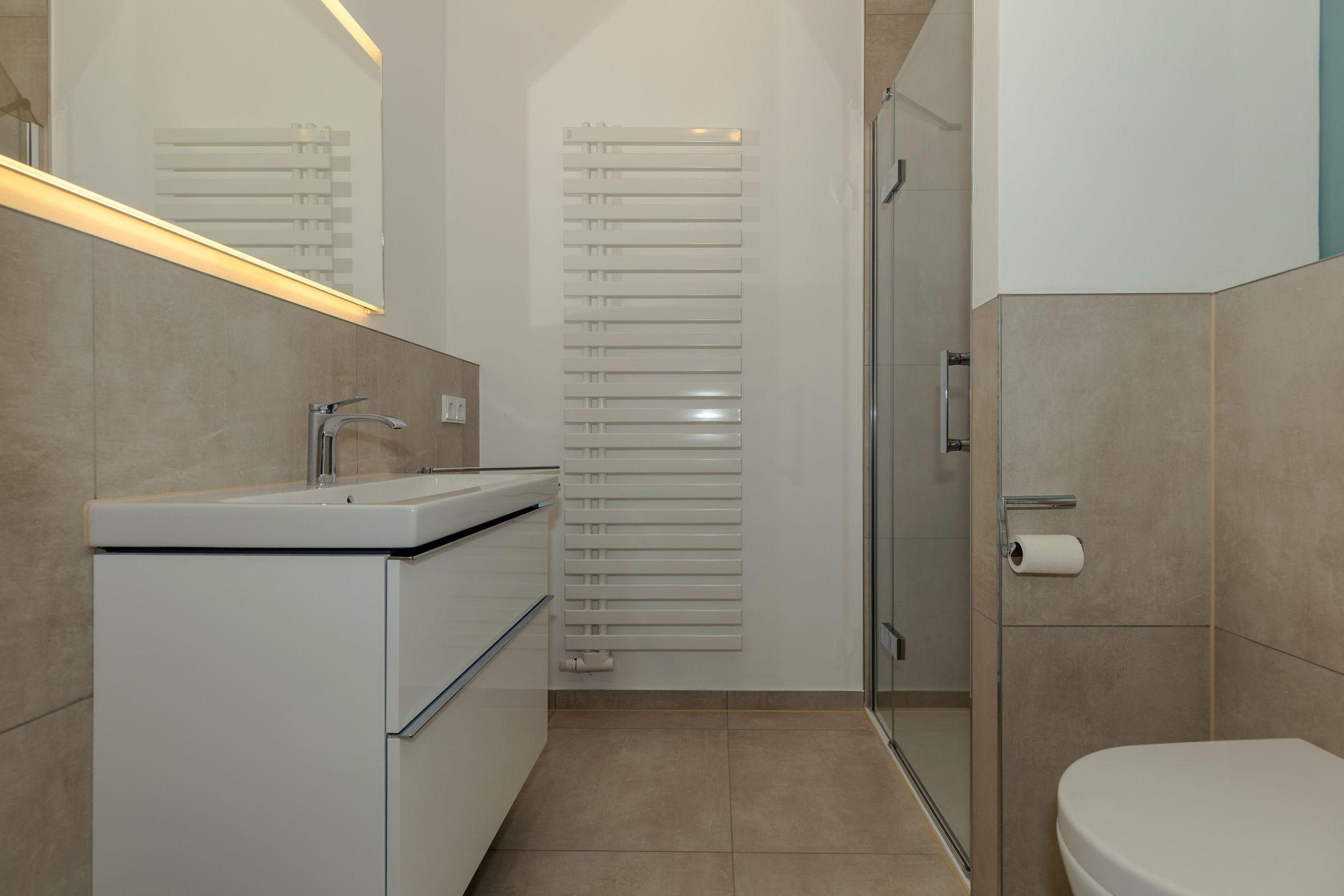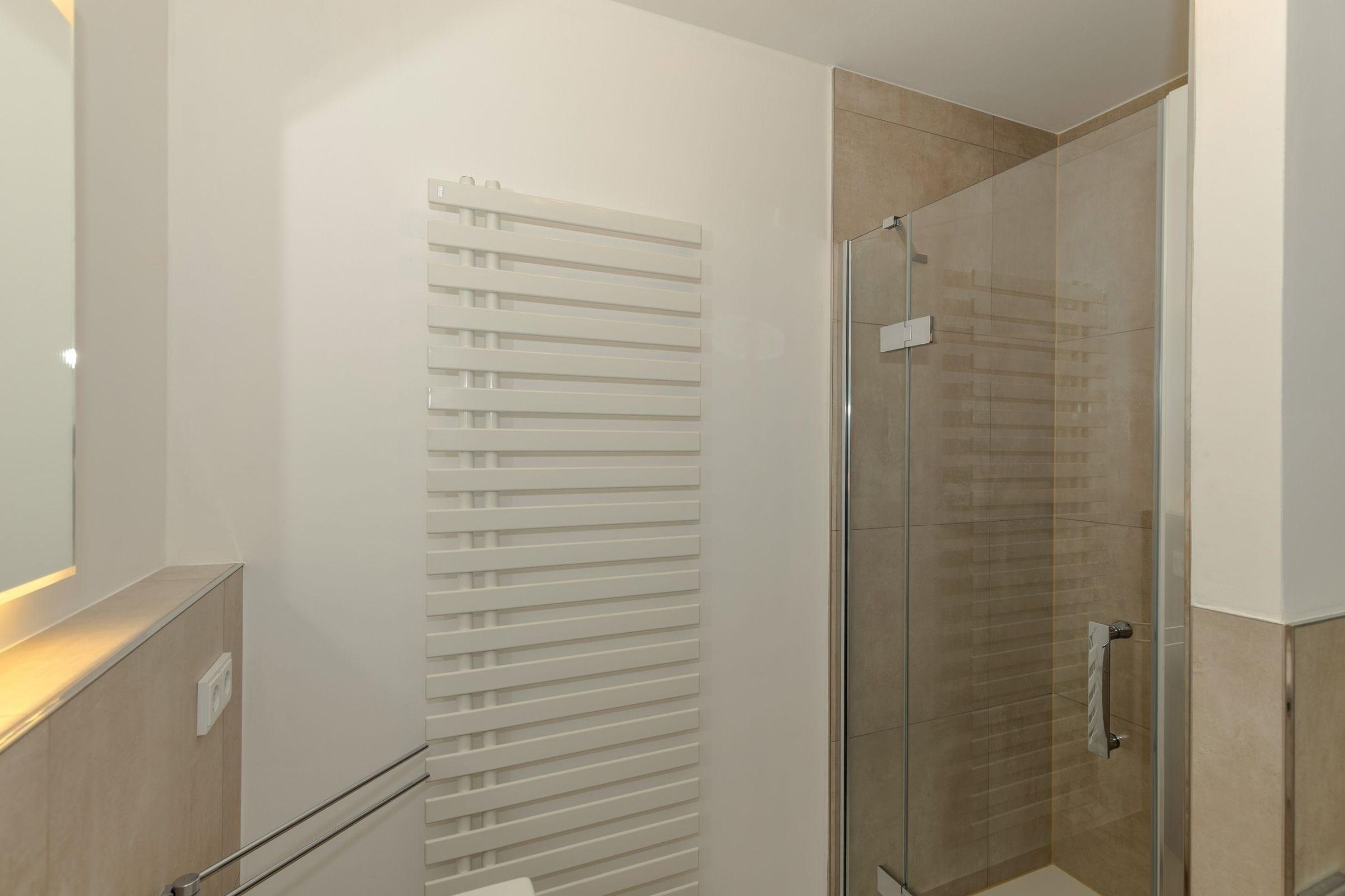 In dem mit Granit ausgestatteten Bad befindet sich neben Dusche und WC ein großer Waschtisch mit großem Spiegel. Ihre kleine Wohlfühloase mit ausreichend Platz für Kosmetika und Handtuchhalter!
