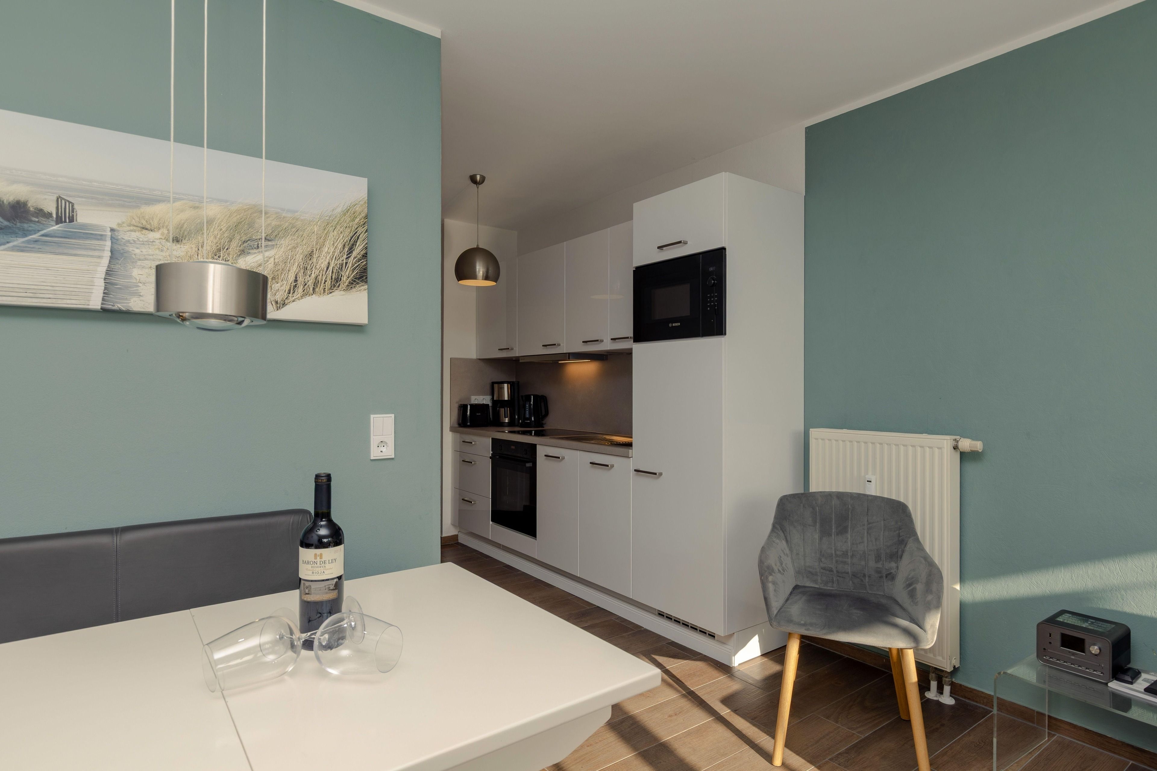 In der komplett ausgestatteten Küche können Sie morgens bei einer leckeren Tasse Kaffee richtig wach werden oder zusammen mit Ihrem Liebsten ein tolles Abendessen zaubern und genießen. Hierfür steht ein Cerankochfeldherd mit Backofen, ein Kühlschrank, eine Spülmaschine, Wasserkocher, Kaffeemaschine und Toaster zur Verfügung.