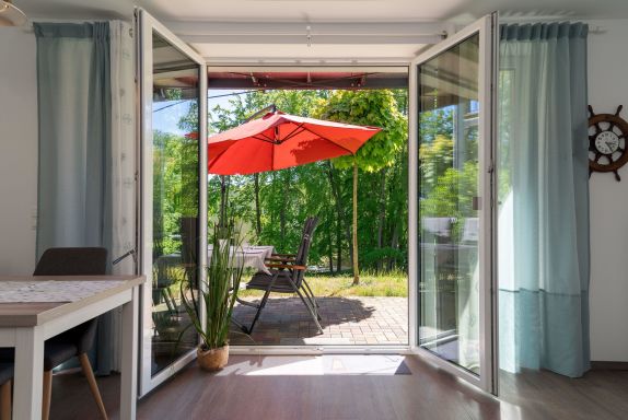 Die Terrasse ist mit einem Esstisch und vier verstellbaren Hochlehner-Stühlen und Sonnenschirm möbliert.