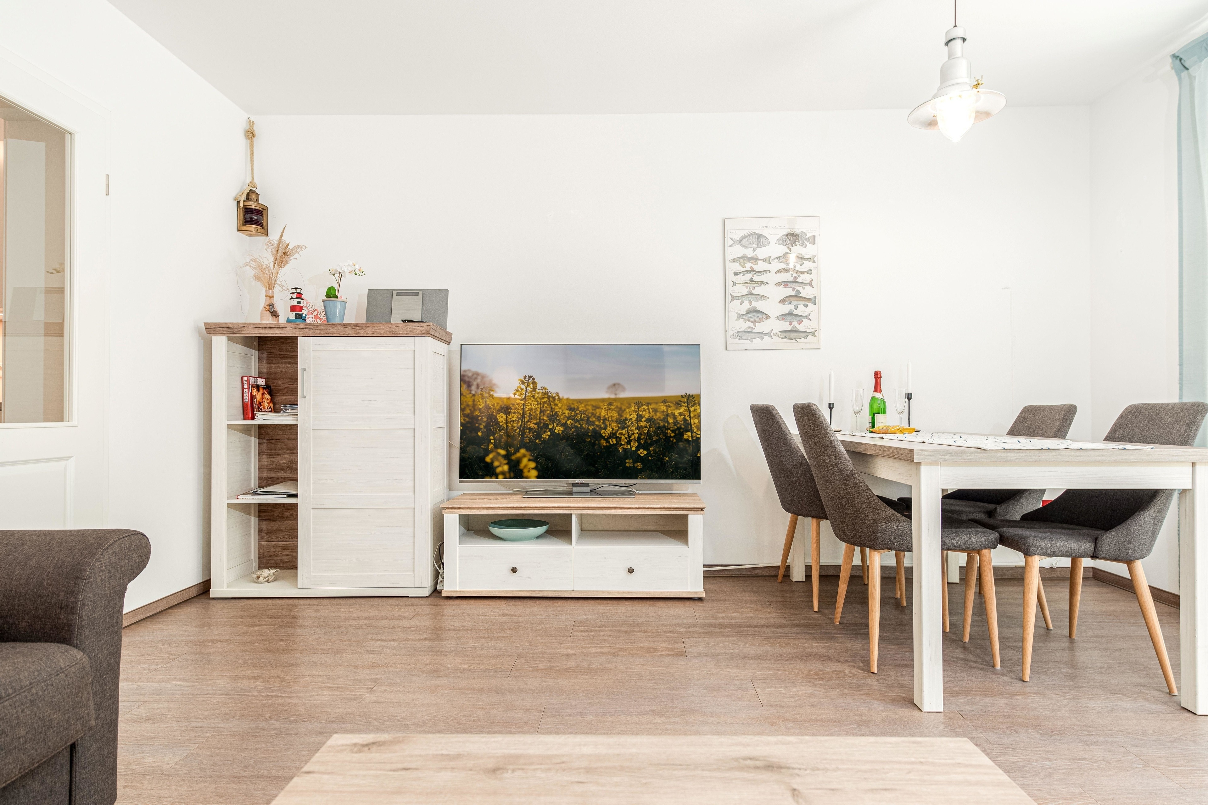 Der mehr als 20 qm große Wohnraum ist mit einer Essecke, zwei Sofas und TV mit Schank geschmackvoll ausgestattet. Die raffinierten, bequemen Schlafsofas sind ausrollbar und beherbergen je eine durchgängige komfortable Matratze mit Lattenrost, die eine Größe vom 140 x 200 cm haben. Vier Personen können hier zusätzlich übernachten.