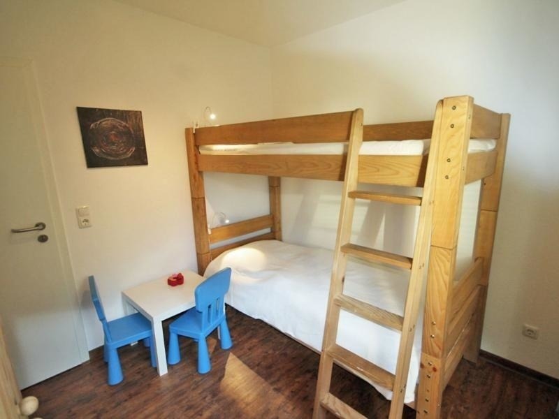 Das Kinderzimmer ist ausgestattet mit einem Etagenbett und einem Kleiderschrank, das Kinderreisebett ist zusammengefaltet.