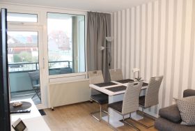 Direkt an den Wohnraum angebunden befindet sich der gemütliche Balkon der Unterkunft. Komfortable Balkonmöbel sorgen gemeinsam mit der beidseitigen Begrenzung dafür, dass das Verweilen hier nicht nur komfortabel, sondern auch bei Wind und Wetter möglich ist.