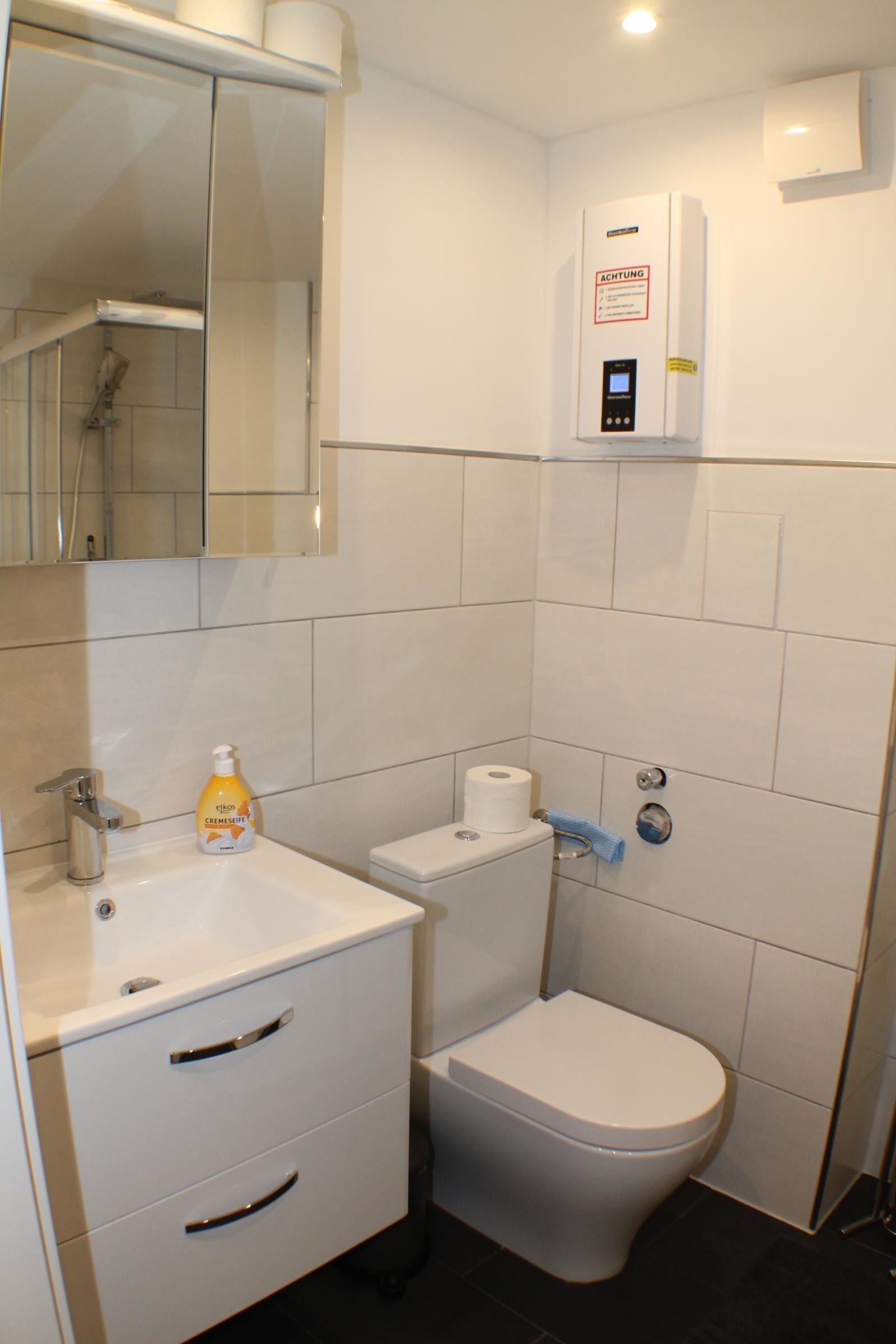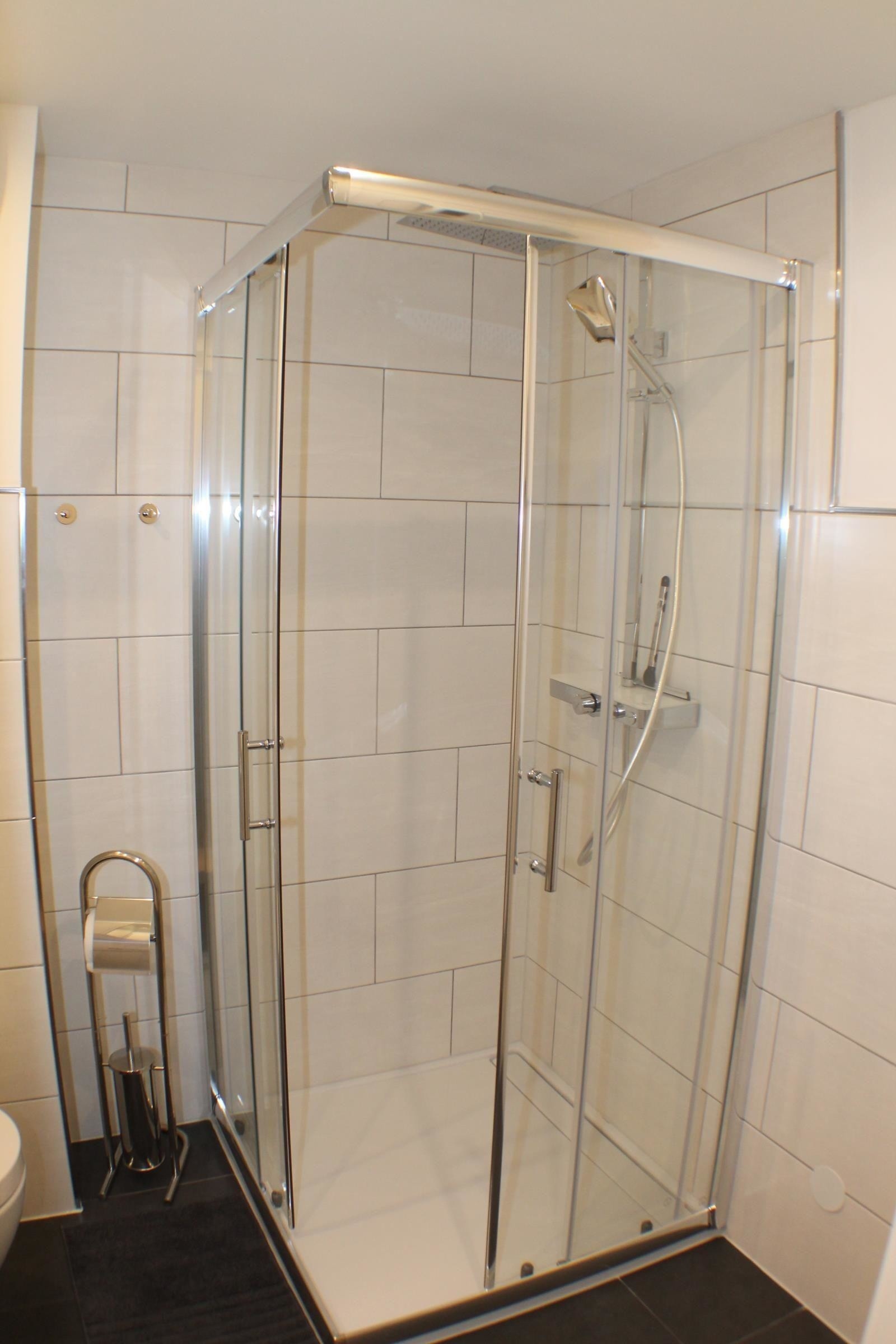 Das hell geflieste, absolut zeitgemäße Duschbad rundet die Wohnung ab. Waschtisch, Spiegelschrank, ein niedriger Duscheinstieg, ein Föhn und die Waschmaschine sorgen für besonderen Komfort.