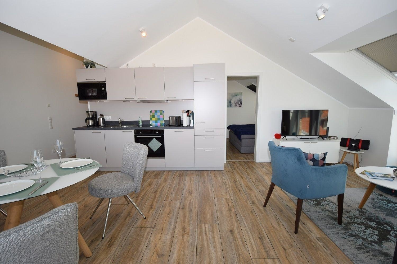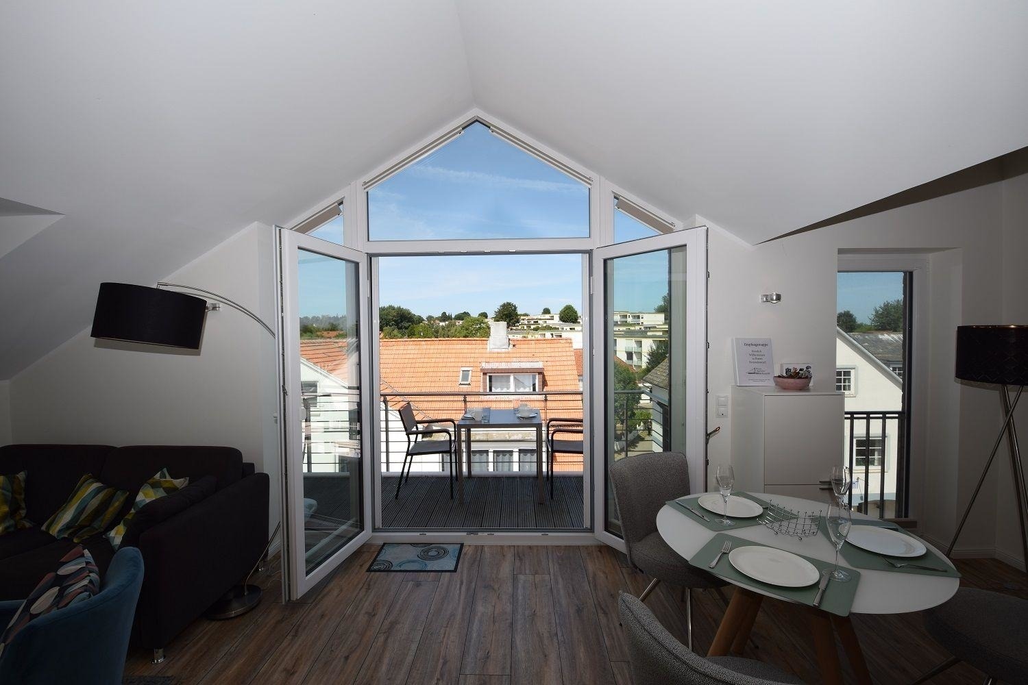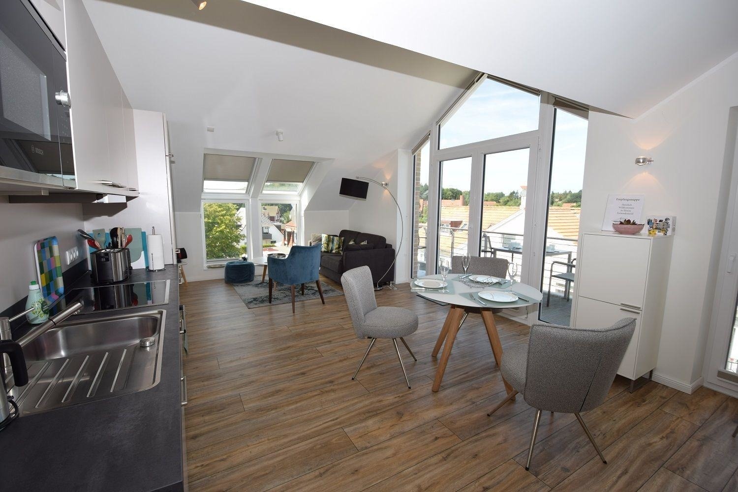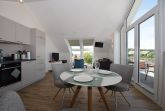 Die Studiowohnung Storchennest im Haus Meeresblick bietet Platz für zwei bis drei Personen und überzeugt durch ihre helle, moderne Ausstattung. Der Wohnraum ist lichtdurchflutet und verfügt über eine große Fensterfront sowie ein gemütliches Sofa, das zum Entspannen einlädt. Eine offene Küche mit angrenzendem Essplatz ist umfangreich ausgestattet, darunter Herd, Backofen, Kühlschrank mit Gefriermöglichkeit, Kaffeemaschinen und eine Spülmaschine. Das komfortable Schlafzimmer ist mit einem großen Doppelbett und einem großzügigen Schrank für ausreichend Stauraum ausgestattet. Das moderne Duschbad bietet eine bodentiefen Dusche, einen Waschtisch mit Spiegel und einen Handtuchwärmer. Ein Balkon mit Möbeln lädt dazu ein, die frische Luft zu genießen. WLAN ist verfügbar und ein Lift sorgt für barrierefreien Zugang. Haustiere sind erlaubt, maximal zwei mittelgroße Hunde.