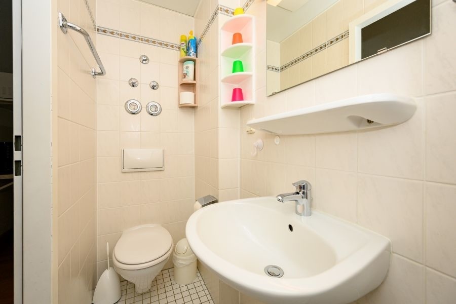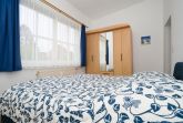 Appartement Sanddorn (2-4 Pers.), Villa Christiana, Graal-Müritz: 1. Stock (Haupthaus). 45+ qm. Flur mit Küchenzeile, kleines Badezimmer (DU/WC), Wohnzimmer mit großem Essbereich und Schlafsofa, Schlafzimmer (Doppelbett)