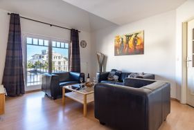 Der modern und gemütlich eingerichtete Wohnbereich lädt zum entspannen ein. Von hier kommen Sie zum Balkon, zu den Schlafzimmern und zur Küche. Der Balkon ist mit Blickrichtung zur Ostsee ausgerichtet.