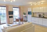 Die offene Küche grenzt direkt an den Wohnbereich. Die Küche ist voll ausgestattet, vom Besteck über Geschirr bis hin zu diversen Küchenutensilien. Natürlich ist auch eine Kaffeemaschine, ein Toaster, Wasserkocher, Cerankochfeld, Backofen, Kühlschrank und Geschirrspüler vorhanden.