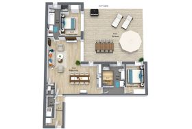 - vollwertige Küche mit Filterkaffeemaschine 4x4, Backofen, Mikrowelle, Kochfeld, Gefrierkombination, Geschirrspüler sowie Esstisch