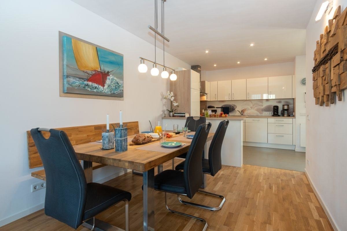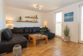 Ihr Urlaubsdomizil befindet sich in der ersten Etage der Anlage am Wilhelmsplatz und verfügt auf 2 Etagen über einen lichtdurchfluteten Wohn- & Essbereich, großzügigen Küchenbereich mit vielen Extras (z.B. Thermomix, Geschirrspülmaschine, Backofen und Mikrowelle) und Gäste WC. Im Obergeschoss finden Sie 2 Schlafzimmern mit jeweils Terrassenzugang und einem Badezimmer mit Badewanne. Beide Schlafzimmer verfügen über ein gemütliches Doppelbett. Zwei weitere Schlafplätze sind auf dem bequemen Schlafsofa im Wohnzimmer.