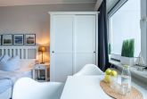 Urlauben Sie auf großzügigen 20 m² (2. Etage) im Strandhotel auf dem Steinwarder - nur wenige Meter vom Badestrand entfernt. Die zuletzt 2021 modernisierte Ferienwohnung verfügt über einen großen Wohnschlafbereich mit einem gemütlichen Doppelbett und Flatscreen-TV. Im angrenzenden Essbereich finden bequem zwei Personen Platz zum Schlemmen. Der offene Küchenbereich ist, für den Urlaubsbedarf, voll ausgestattet. Eine Kaffeemaschine gehört ebenso dazu, wie ein Wasserkocher und ein Toaster. Geschirr und Besteck sind ausreichend vorhanden. Das Badezimmer wurde ebenfalls modernisiert und verfügt über eine Dusche mit Glastrennwand.
