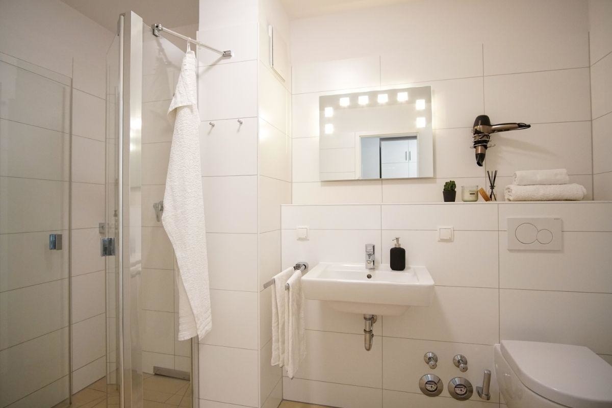Das große Schlafzimmer verfügt über ein gemütliches Doppelbett (160*200cm). Das zweite Schlafzimmer ist mit zwei Einzelbetten und einem geräumigen Schrank eingerichtet. Das Badezimmer ist mit einer ebenerdigen Dusche mit Glastrennwand, Waschmaschine und einem Handtuchheizkörper ausgestattet.