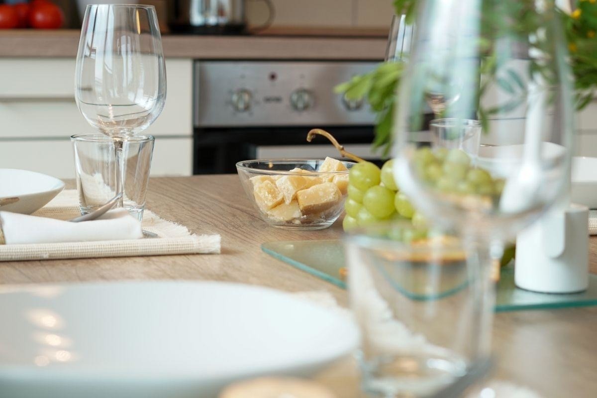 Urlauben Sie auf großzügigen 63 m² (2. Etage) mit Südost-Balkon. Das lichtdurchflutete Wohnzimmer ist mit einer gemütlichen Sofaecke, Flatscreen-TV und DVD-Player ausgestattet. Im Essbereich finden bequem vier Personen Platz zum Schlemmen. Die angrenzende Küchenzeile ist, für den Urlaubsbedarf, voll ausgestattet. Ein Backofen und ein Geschirrspüler gehören ebenso dazu, wie die Kaffeemaschine, der Wasserkocher und ein Toaster. Geschirr und Besteck sind ausreichend vorhanden.