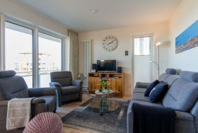 Urlauben Sie auf großzügigen 68 m² (1. Etage) mit großem Balkon. Das lichtdurchflutete Wohnzimmer ist mit einer gemütlichen Sofaecke und einem Smart-TV (50 Zoll) ausgestattet. Im Essbereich finden bequem vier Personen Platz zum Schlemmen platz. Die angrenzende offene Küche ist, für den Urlaubsbedarf, voll ausgestattet. Ein Backofen und ein Geschirrspüler gehören ebenso dazu, wie die Kaffeemaschine, der Wasserkocher und ein Toaster. Geschirr und Besteck sind ausreichend vorhanden. Vom Wohnzimmer aus gelangen Sie auf den Balkon mit Blick zur Ostsee (Nordbalkon). Das große Schlafzimmer verfügt über ein gemütliches Doppelbett (ca. 160*200 cm) und einen eigenen Smart-TV (38 Zoll). Das zweite Schlafzimmer ist mit zwei Einzelbetten (zusammen gestellt) und einem geräumigen Schrank eingerichtet. Auch hier steht Ihnen ein 30-Zoll Smart-TV zur Verfügung. Das Badezimmer ist mit einer ebenerdigen Dusche mit Glastrennwand und einer Waschmaschine ausgestattet. Außerdem stehen Ihnen ein Kinderreisebett (inkl. Matratze), ein Kinderhochstuhl (Holz) kostenfrei zur Verfügung. 2 Fahrräder für Ihre Ausflüge und ein Saisonstrandkorb (von ca. Mitte Mai bis Mitte September) sind bei der Wohnung ebenfalls inklusive