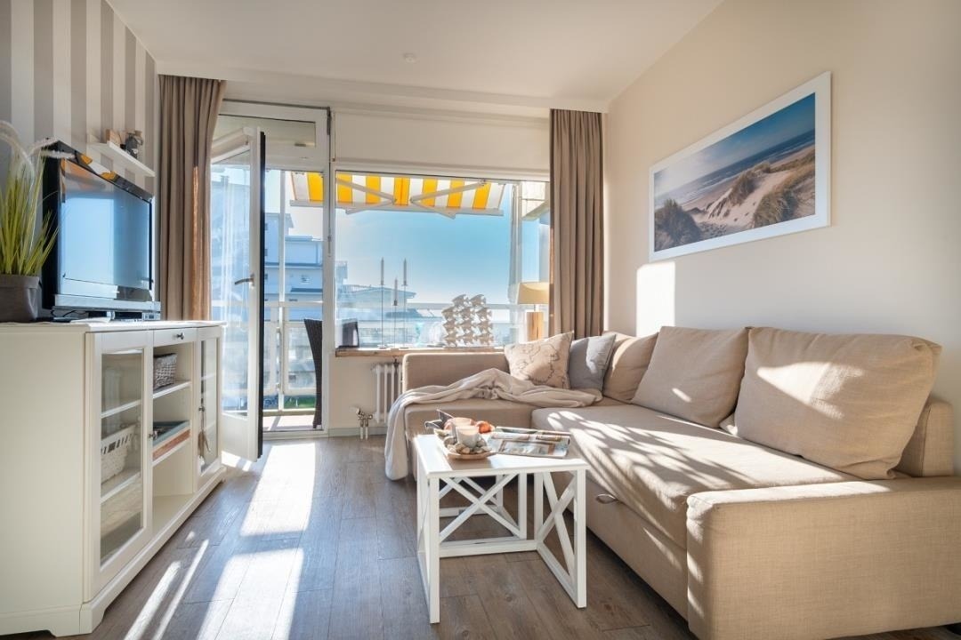 Die 35m²-Wohnung befindet sich in der 2. Etage im Haus Belvedere am Südstrand und wurde zuletzt 2020 modernisiert.