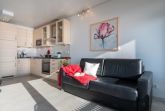 Die modernisierte 2-Zimmer-Wohnung verfügt über einen großzügigen Wohn-Schlafbereich mit einer gemütlichen Sofaecke (Schlafsofa) mit Flatscreen-TV und der Essecke für vier Personen. Der offene Küchenbereich ist, für den Urlaubsbedarf, voll ausgestattet. Außerdem stehen Ihnen noch eine Mikrowelle und ein Backofen zur Verfügung. Das angrenzende Schlafzimmer verfügt über ein komfortables Doppelbett. Das ebenfalls modernisierte Badezimmer verfügt über eine Dusche mit Glastrennwand und einem leicht erhöhten Einstieg.