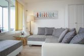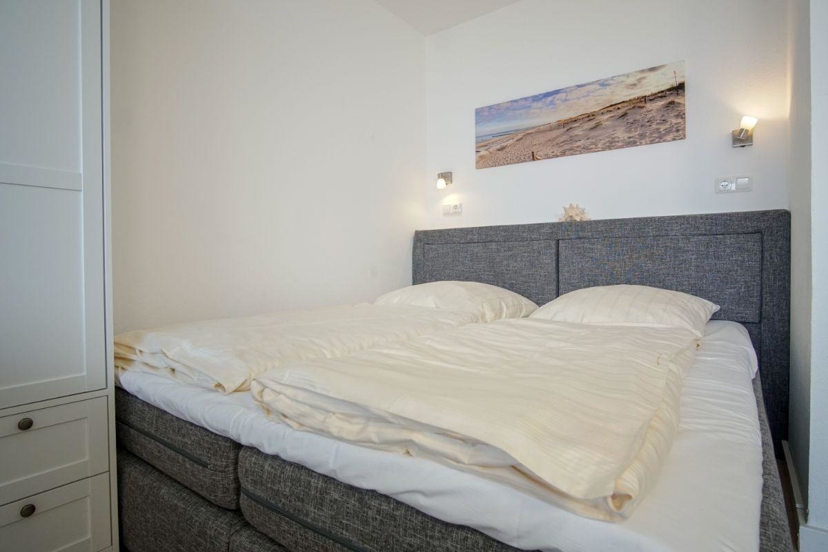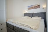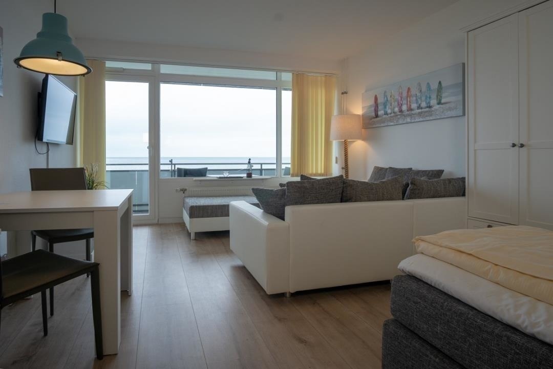 Die zuletzt 2021 modernisierte 35m²-Wohnung im Haus Sanddorn am Südstrand verfügt über einen großzügigen Wohn-Schlafbereich mit einem komfortablen Doppelbett im hinteren Bereich, einer gemütlichen Sofaecke mit Flatscreen-TV und der Essecke für drei Personen.