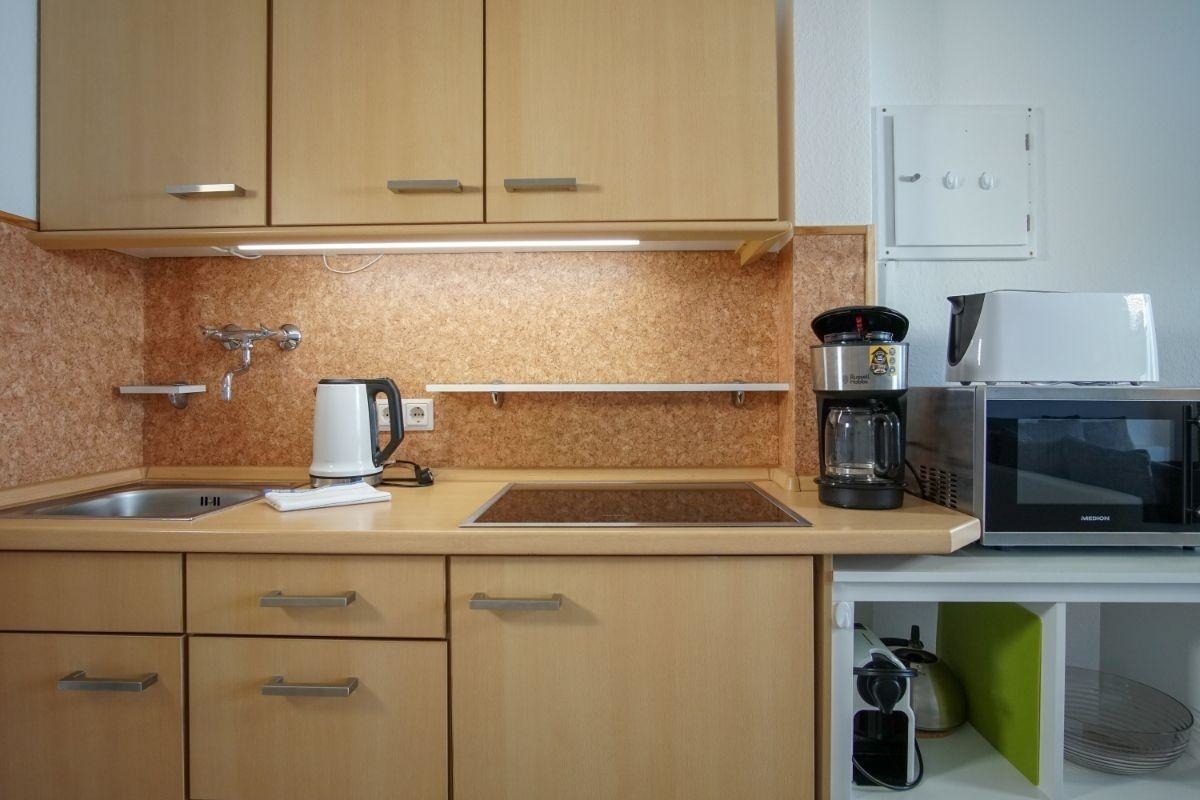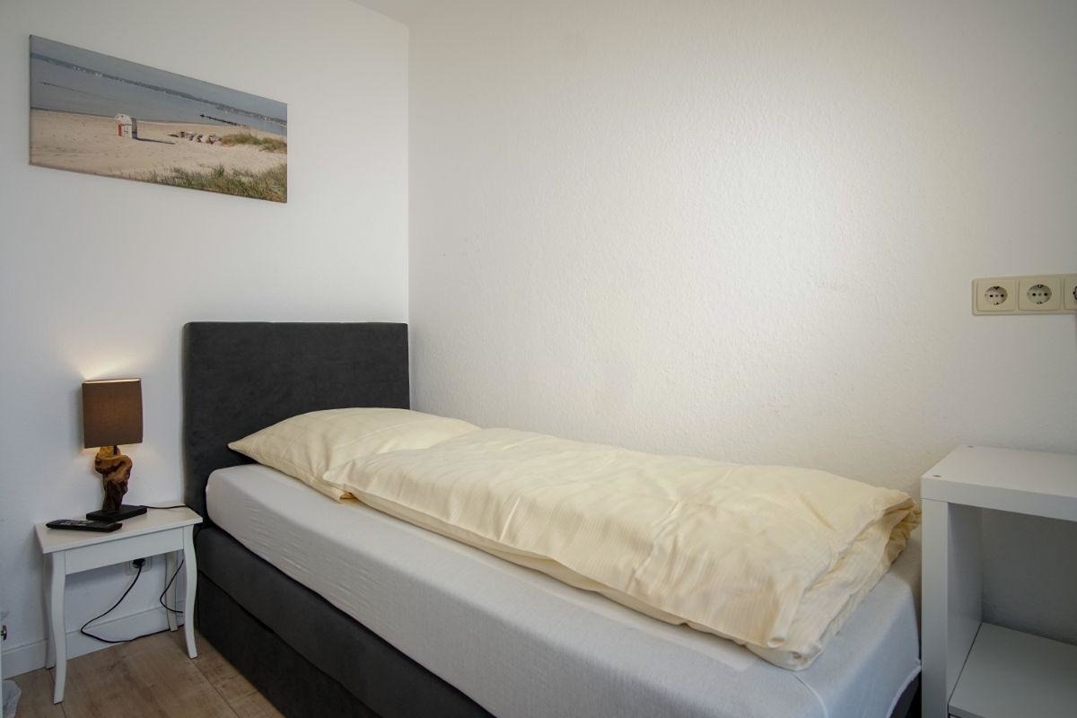 Der offene Küchenbereich ist, für den Urlaubsbedarf, voll ausgestattet. Eine Kaffeemaschine gehört ebenso dazu, wie der Wasserkocher und ein Toaster. Geschirr und Besteck sind ausreichend vorhanden. Das angrenzende Schlafzimmer verfügt über ein Einzelboxspringbett und ist auch für Erwachsene geeignet.