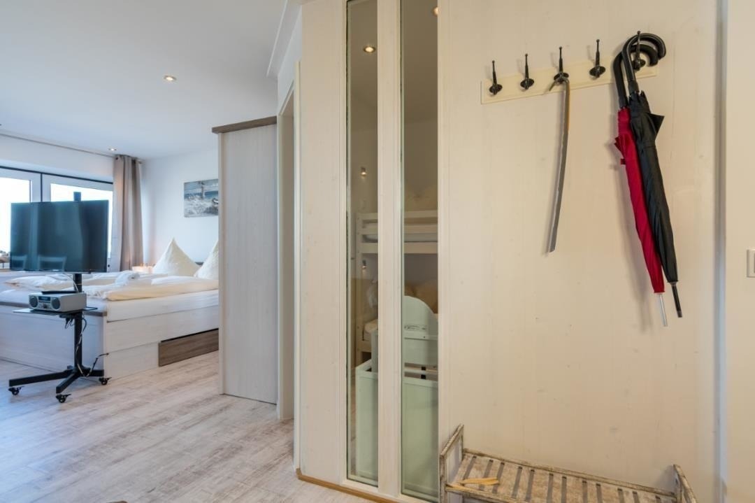 Urlauben Sie auf großzügigen 42 m² (2. Etage) im Strandhotel auf dem Steinwarder - nur wenige Meter vom Badestrand entfernt. Die zuletzt 2021 modernisierte Ferienwohnung verfügt über einen großen Wohnschlafbereich mit einer gemütlichen Sofaecke und Flatscreen-TV. Im angrenzenden Essbereich finden bequem vier Personen Platz zum Schlemmen. Der offene Küchenbereich ist, für den Urlaubsbedarf, voll ausgestattet. Eine Kaffeemaschine gehört ebenso dazu, wie ein Wasserkocher und ein Toaster. Geschirr und Besteck sind ausreichend vorhanden. Der Schlafbereich ist mit einem komfortablen Doppelbett eingerichtet. Das Badezimmer wurde ebenfalls modernisiert und verfügt über eine Dusche mit Glastrennwand.