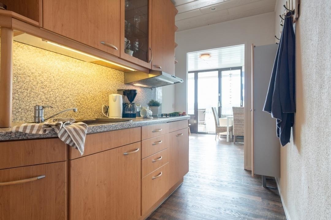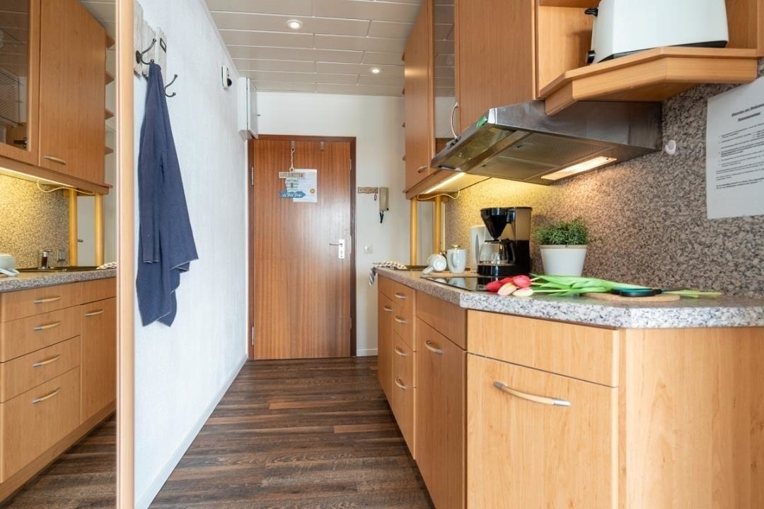 Urlauben Sie auf großzügigen 36 m² (4. Etage) im Haus Schöne Aussicht auf dem Steinwarder - nur wenige Meter vom Badestrand entfernt. Die zuletzt 2020 modernisierte Ferienwohnung verfügt über einen großen Wohnschlafbereich mit einer gemütlichen Sofaecke und Flatscreen-TV. Im angrenzenden Essbereich finden bequem zwei Personen Platz zum Schlemmen. Der offene Küchenbereich ist, für den Urlaubsbedarf, voll ausgestattet. Eine Kaffeemaschine gehört ebenso dazu, wie ein Wasserkocher und ein Toaster. Geschirr und Besteck sind ausreichend vorhanden.