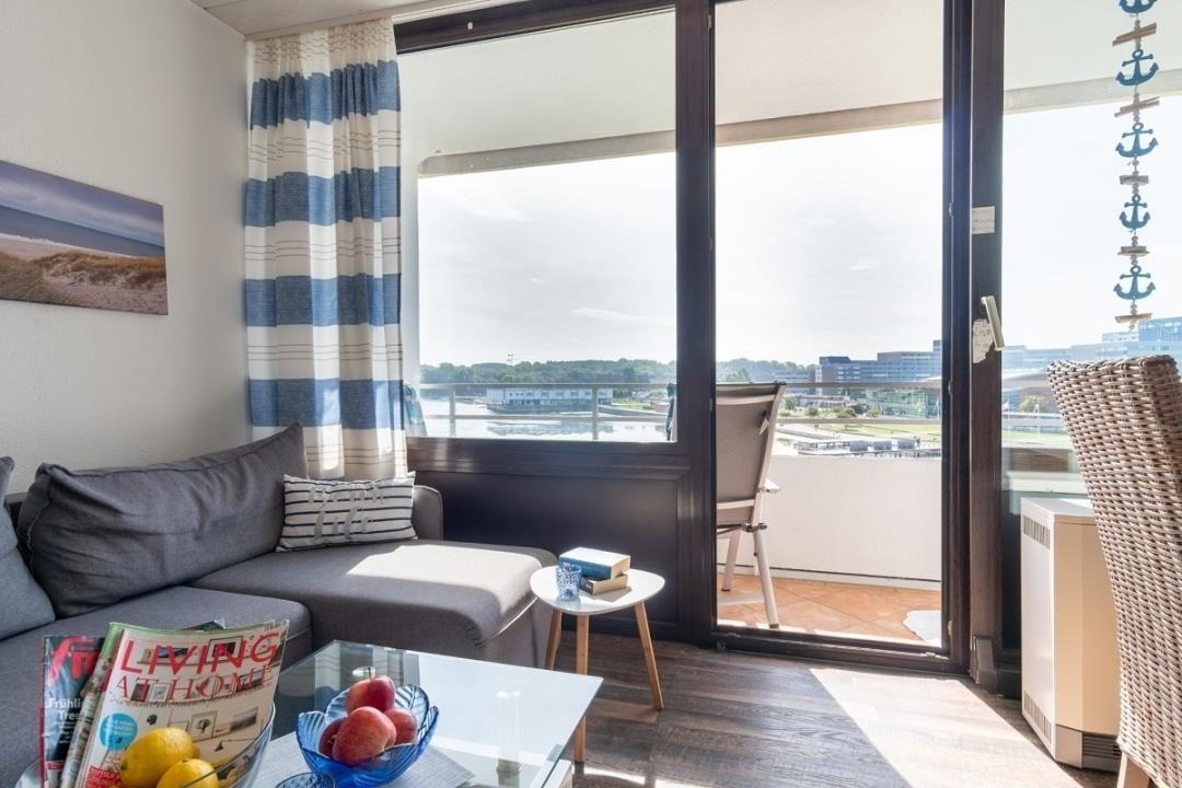 Vom Wohnzimmer aus gelangen Sie auf den Balkon mit Seeblick (Binnensee).