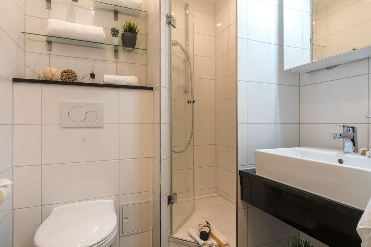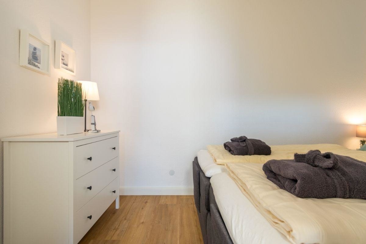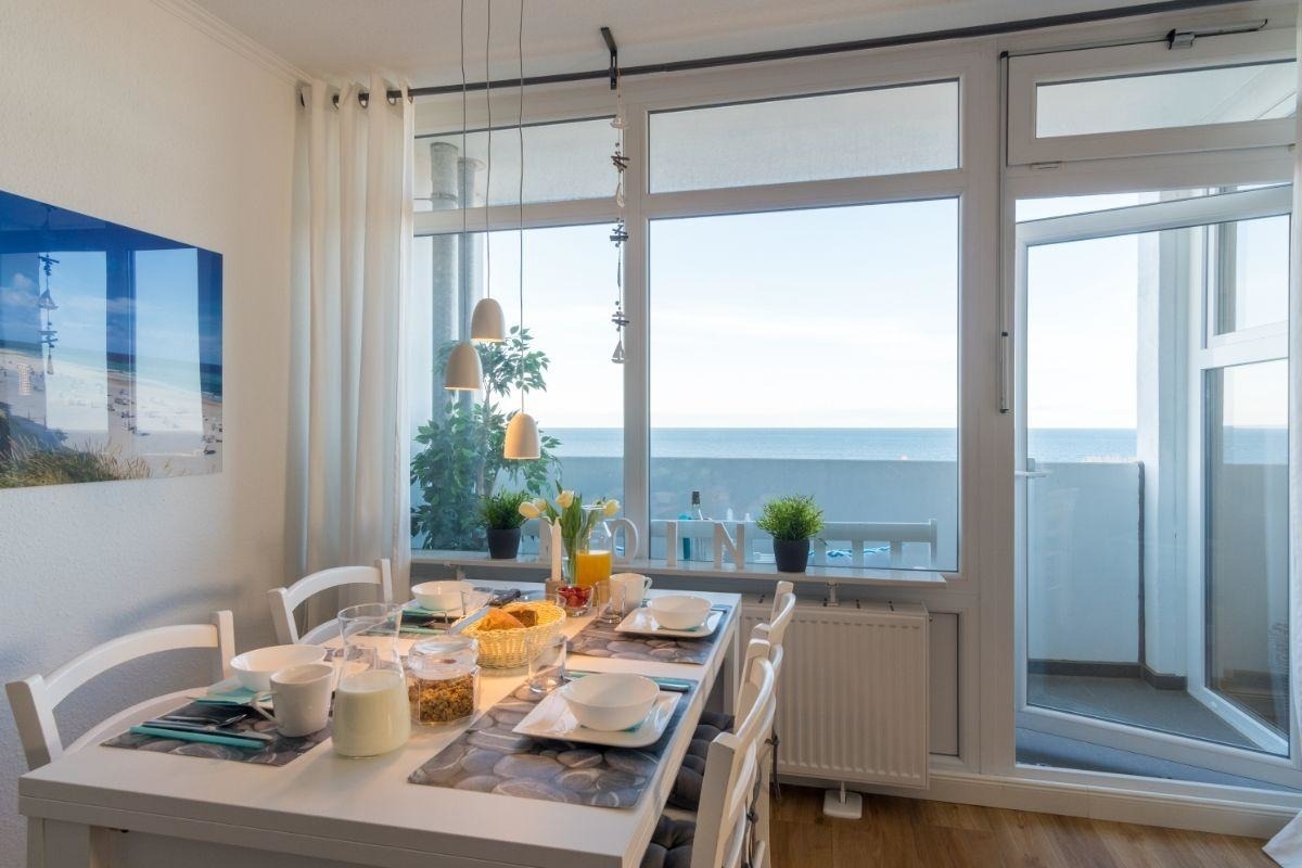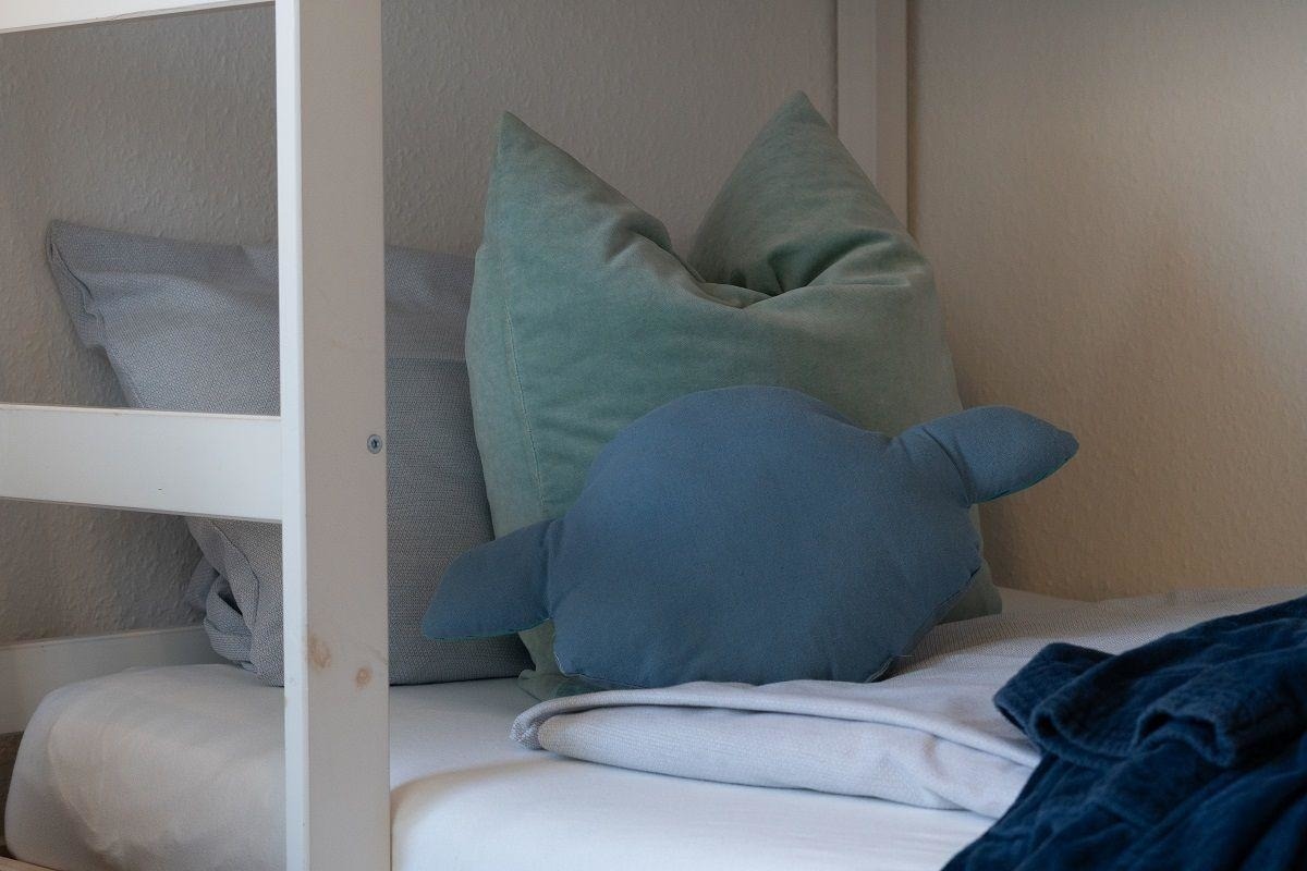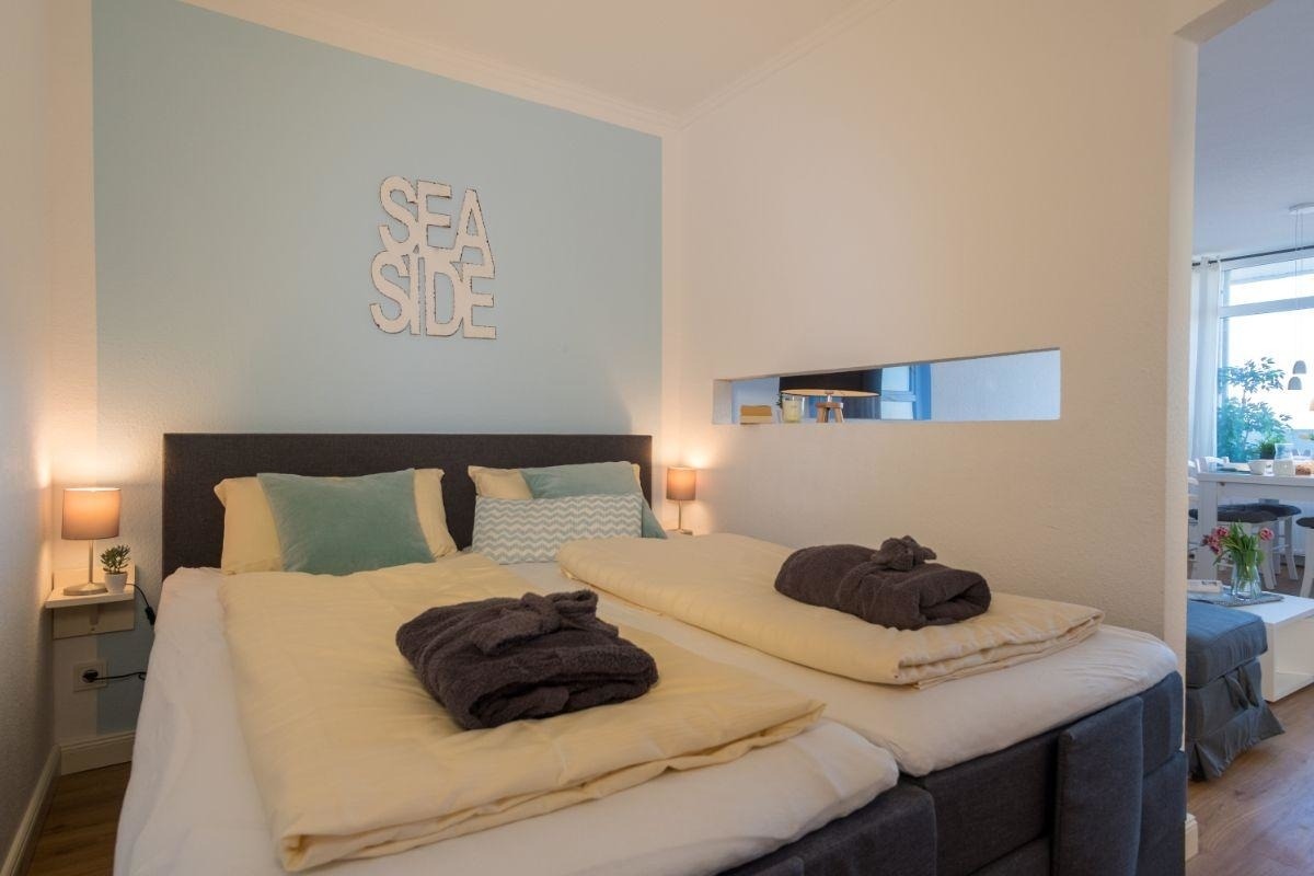 Die 1,5-Zimmerwohnung wurde zuletzt 2020 modernisiert und verfügt über einen hellen Wohn-Schlafbereich mit einem gemütlichen Doppelbett, einer Sofaecke mit Flatscreen-TV und einer Essecke direkt am Fenster - so können Sie schon morgens den herrlichen Ausblick zum Meer genießen. Das Kinderzimmer ist mit zwei weiteren Schlafplätzen (Etagenbett, auch für Teenager geeignet) ausgestattet. Die moderne Küchenzeile ist voll ausgestattet und verfügt zusätzlich über einen Geschirrspüler und eine Mikrowelle.