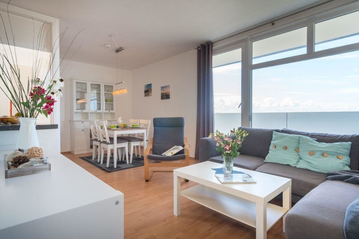 Die zuletzt 2021 modernisierte 55m²-Wohnung verfügt über einen großzügigen Wohnbereich mit einer gemütlichen Sofaecke mit Flatscreen-TV und der Essecke für vier Personen. Der offene Küchenbereich ist, für den Urlaubsbedarf, voll ausgestattet. Außerdem stehen Ihnen noch ein Backofen und ein Geschirrspüler zur Verfügung. Das angrenzende Kinderzimmer verfügt über ein Etagenbett und ist auch für Teenager geeignet. Das Elternschlafzimmer ist mit einem gemütlichen Doppelbett eingerichtet.