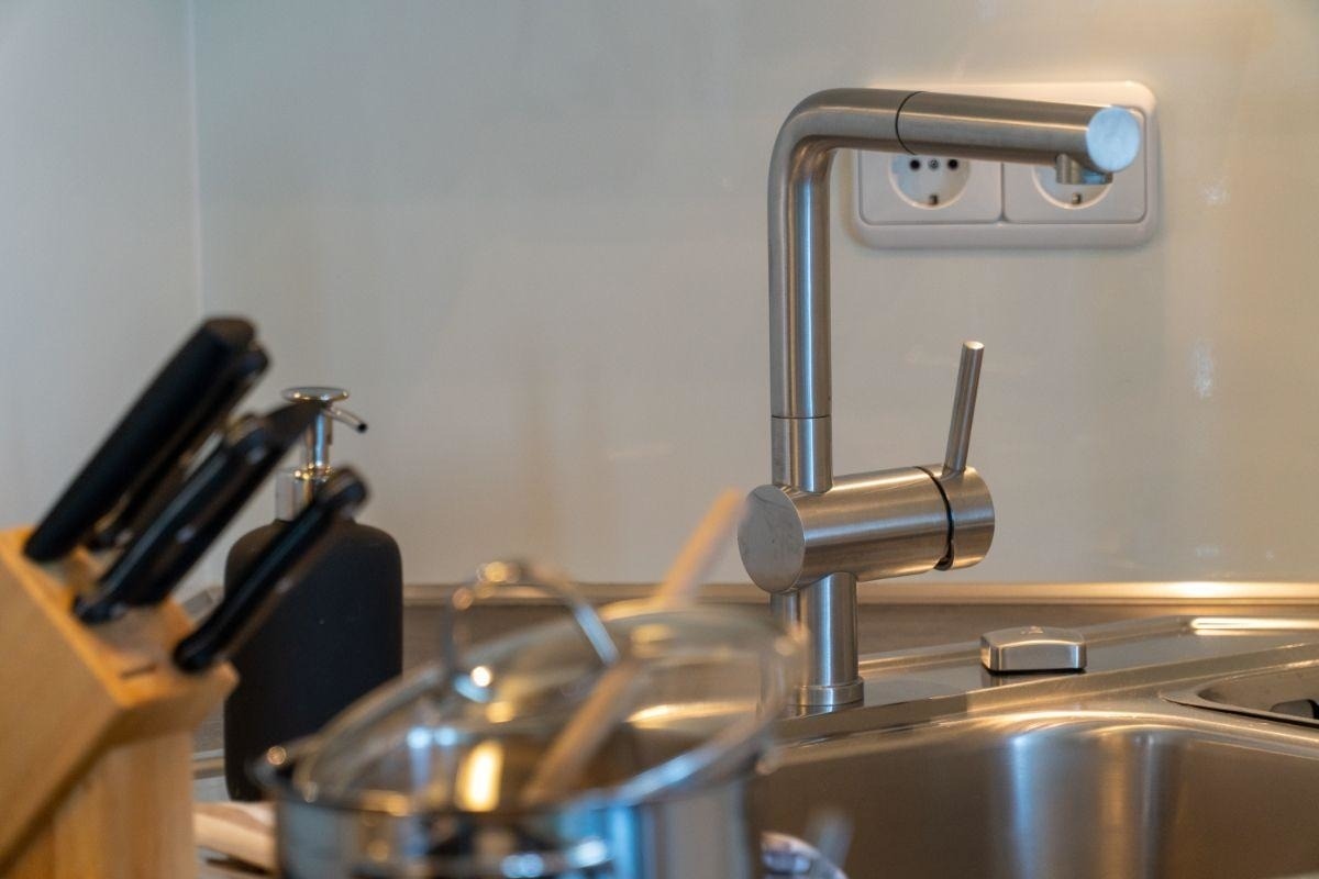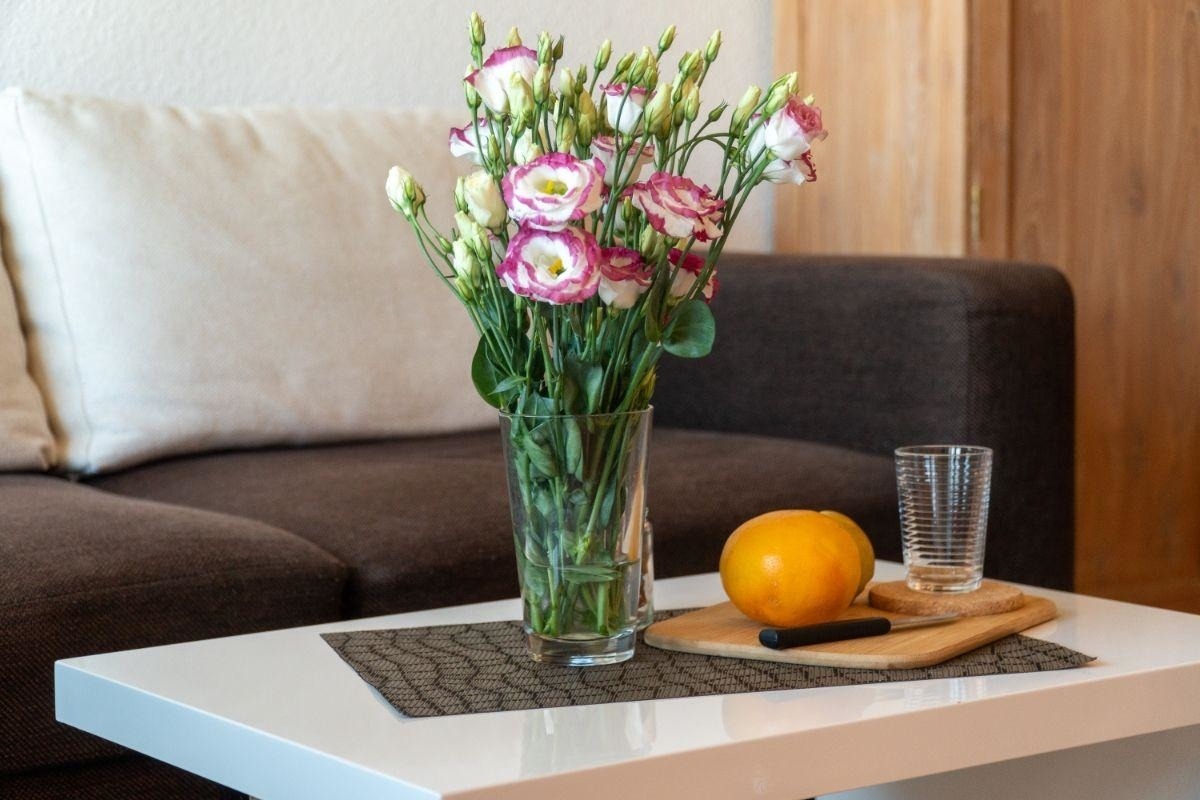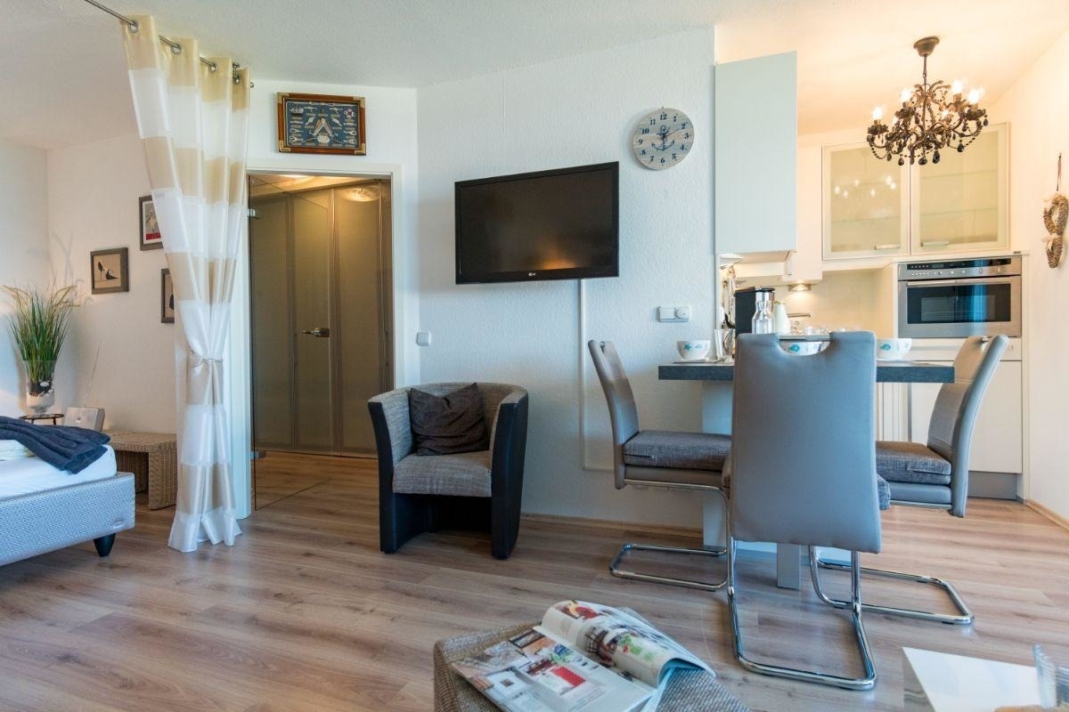 Die zuletzt 2020 modernisierte 45m²-Wohnung verfügt über einen großzügigen Wohn-Schlafbereich mit einem komfortablen Doppelbett im hinteren Bereich, einer gemütlichen Sofaecke mit Flatscreen-TV und der Essecke für drei Personen. Der offene Küchenbereich ist, für den Urlaubsbedarf, voll ausgestattet. Außerdem stehen Ihnen noch eine Mikrowelle und ein Geschirrspüler zur Verfügung. Das angrenzende Kinderzimmer verfügt über ein Einzelbett und ist auch für Erwachsene geeignet.