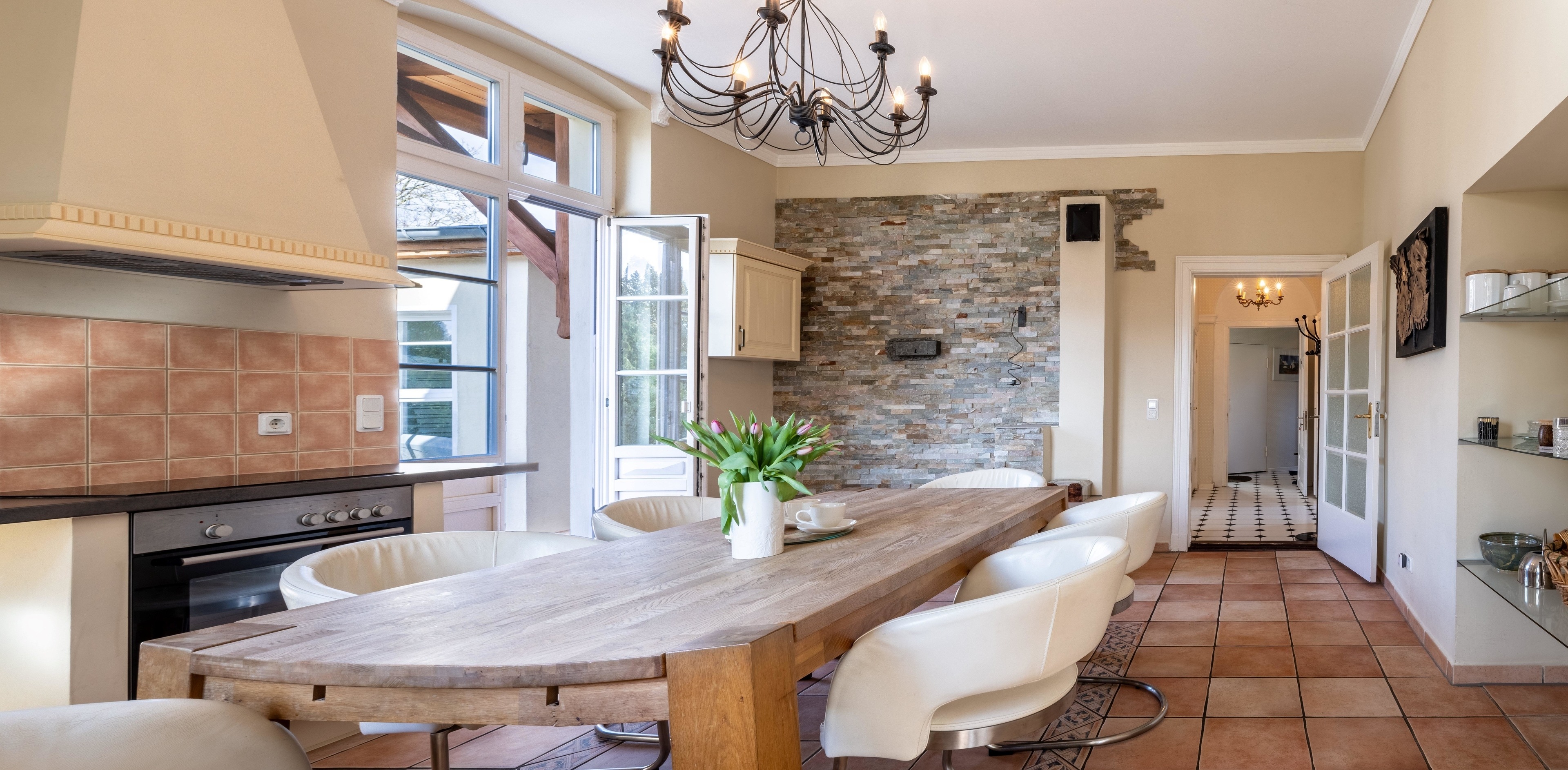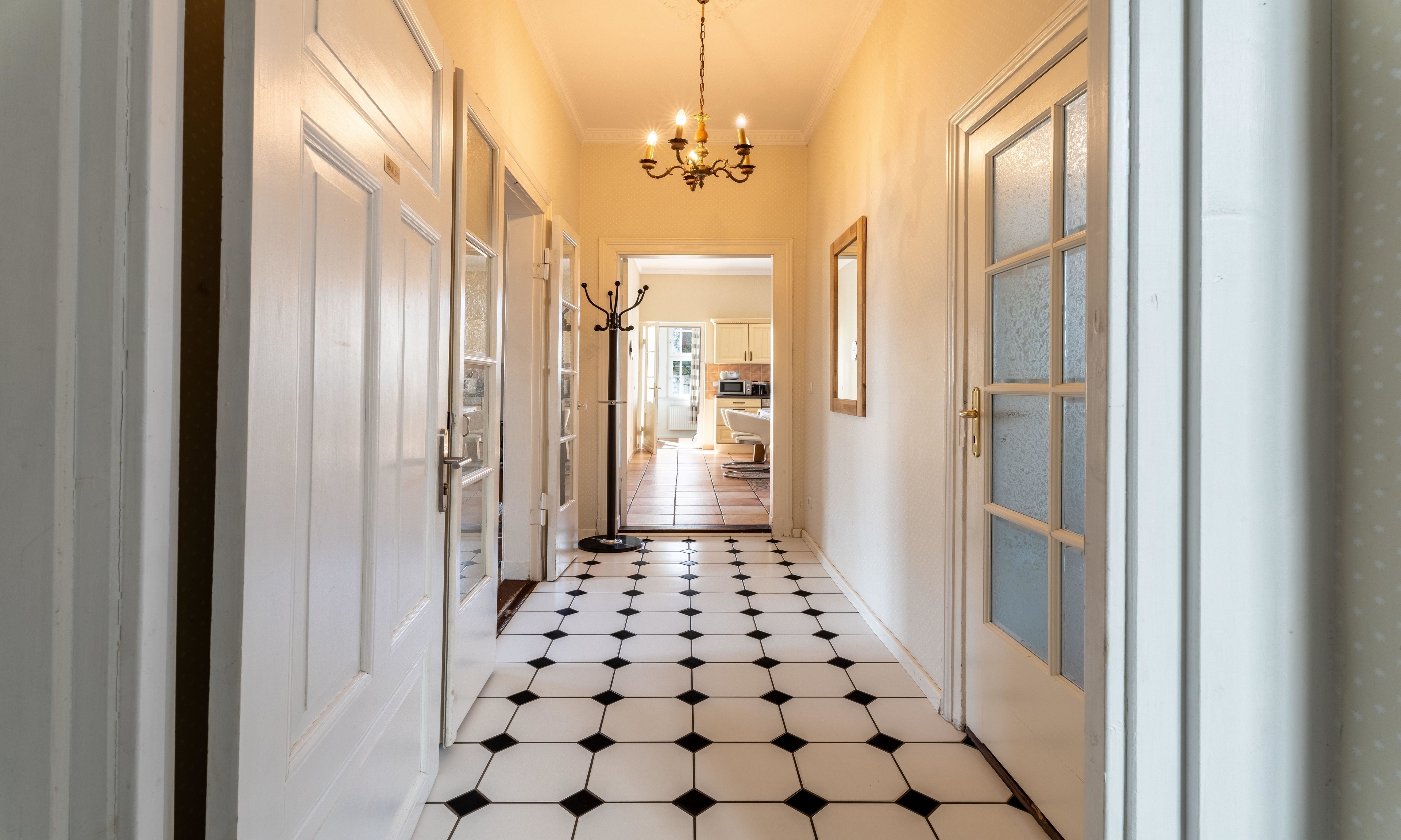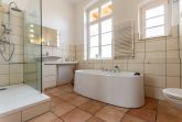 Die im Erdgeschoss liegende Wohnung steht mit ihren 129 qm der äußeren Erscheinung in nichts nach. Große Räume mit stilvollem Stuck dekoriert, laden Sie zum Entspannen und Genießen ein. Starten Sie Ihren Tag in der Morgensonne doch mit einem heißen Kaffee im gemütlichen Wintergarten und einem anschließenden Spaziergang.