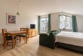 Das ca. 35 qm große 1 – Raum Apartment im Dachgeschoss besteht aus einem geräumigen Wohn- Schlafbereich mit Küchenzeile sowie einem Duschbad und Flur.