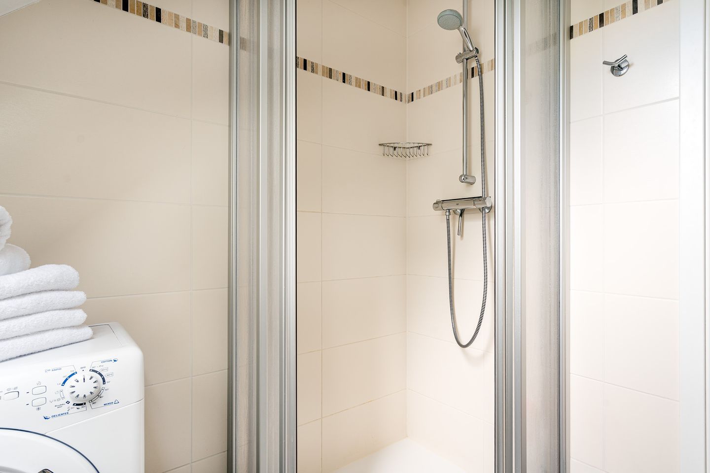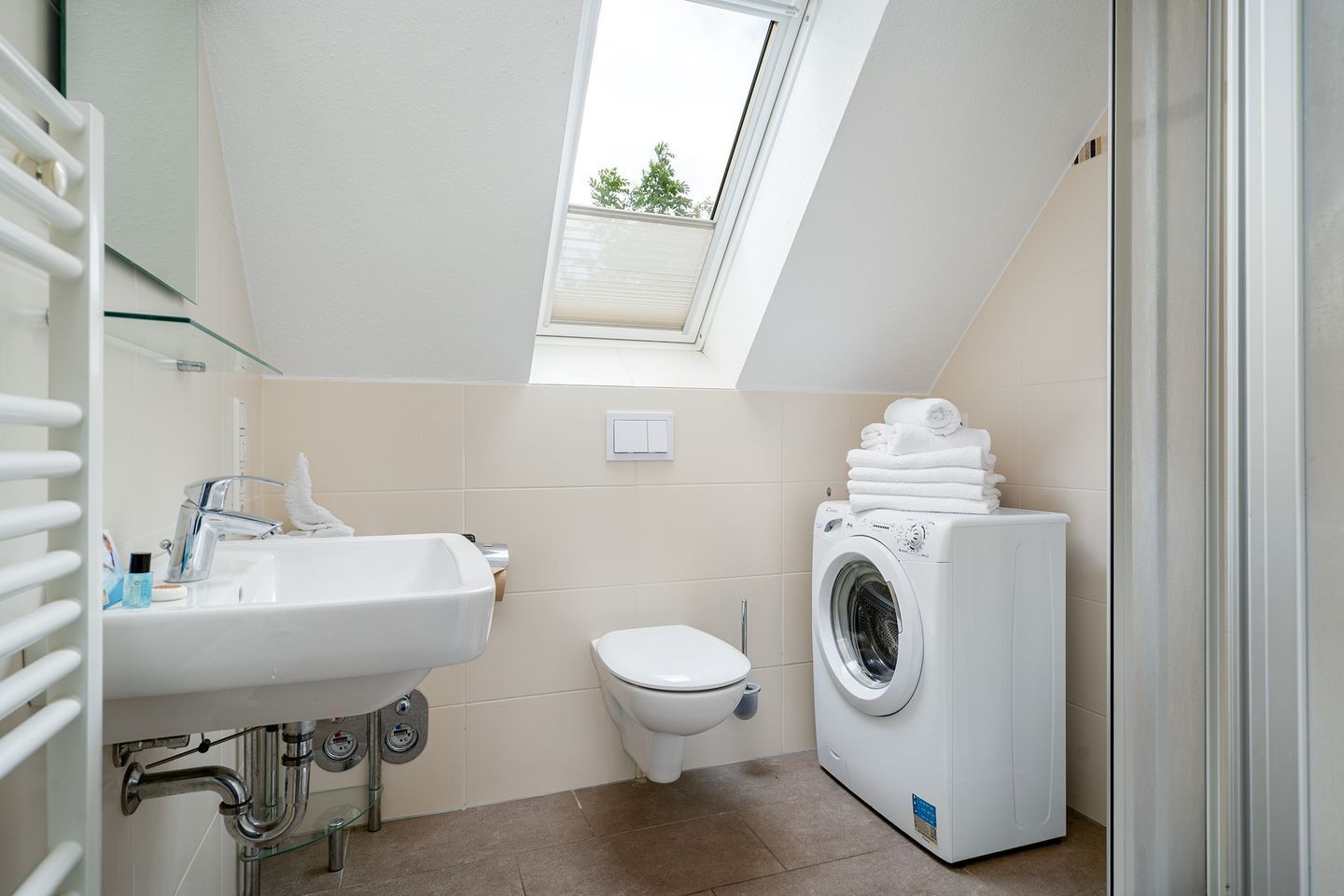Das Badezimmer verfügt über eine Dusche, WC, Waschmaschine und Handtuchtrockner.