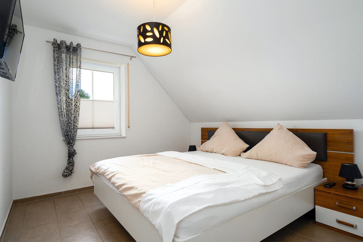 2 Schlafräume (eines mit einem Doppelbett 2 m x 0,90 m - auf der Wohnebene). Ein weiteres Schlafzimmer mit 2 Einzelbetten (2 m x 0,90 m) befindet sich im großzügigem Dachstudio mit zusätzlichen Sitzplätzen und einem weiteren Fernseher.