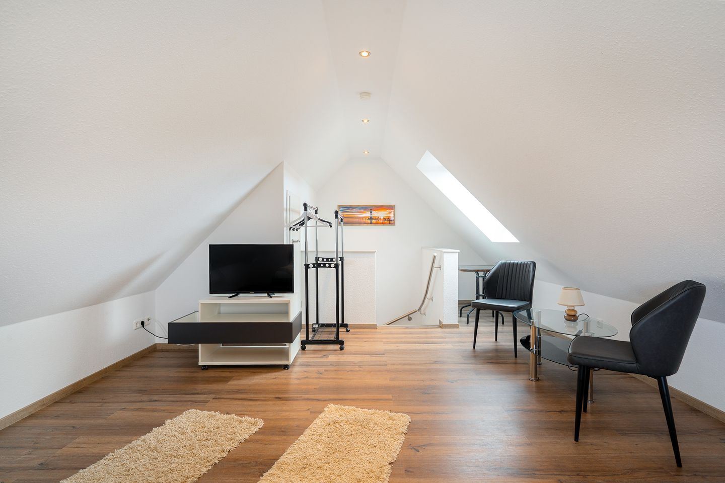 Die Böden sind durchgehend gefliest, das Dachstudio mit Laminat ausgelegt. Die Wohnung verfügt über Fensterplissees und Außenrollos.
