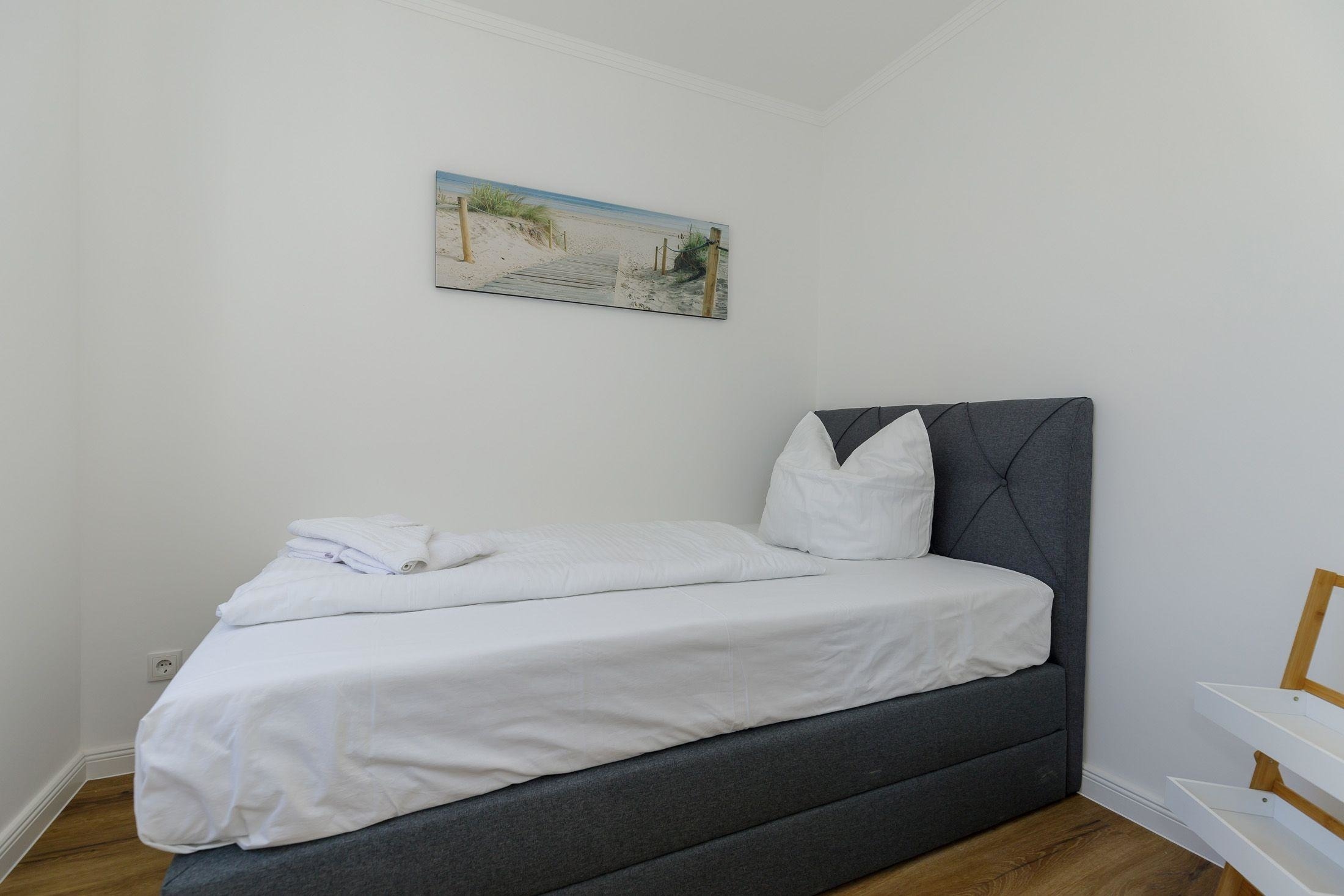 Im 2. Schlafzimmer befindet sich ein Boxspringbett (1,20mx2,00m) und genügend Ablagemöglichkeiten.