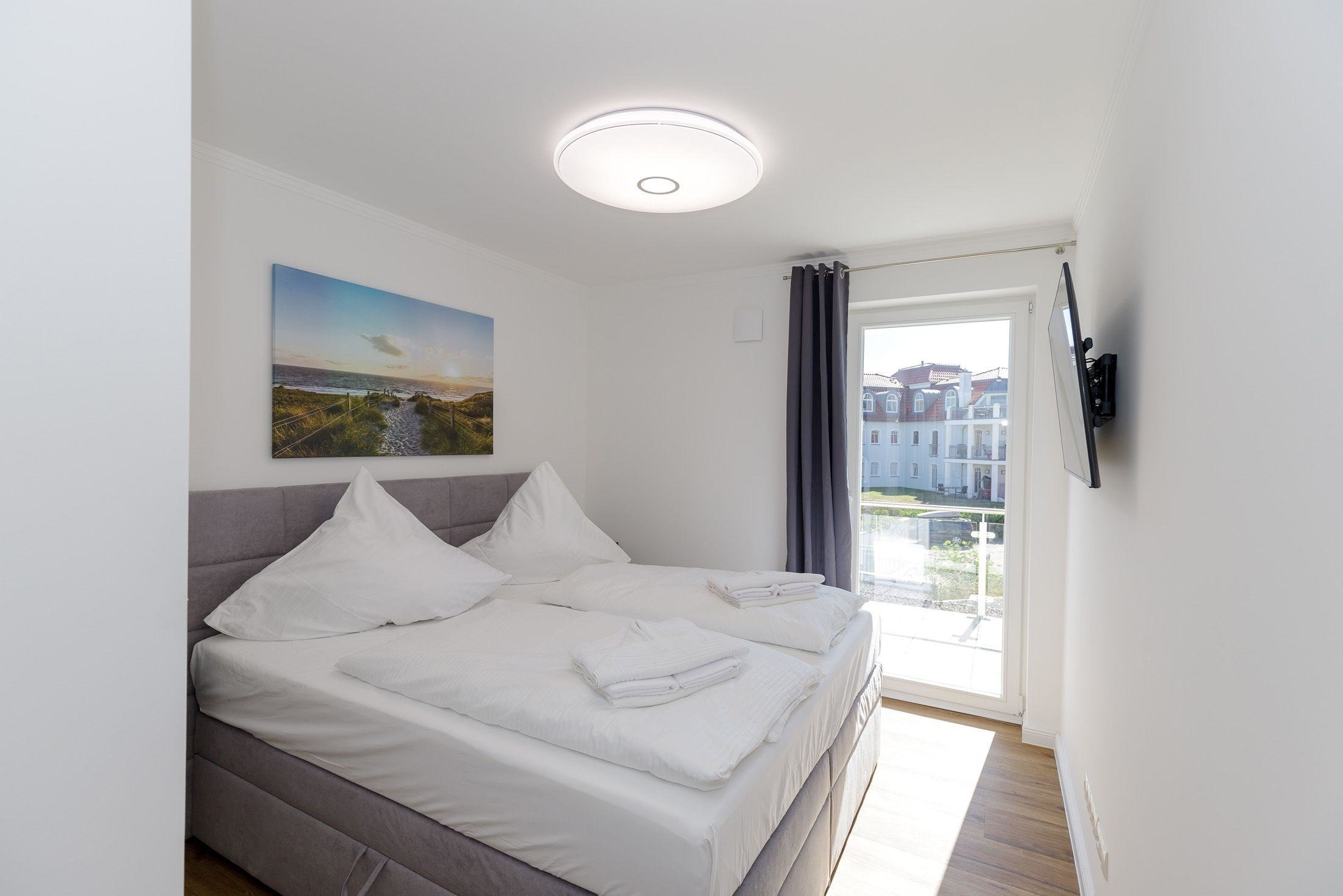Das Schlafzimmer ist mit einem großen, bequemen Boxspringbett (1,80 m Breite) für zwei Personen ausgestattet.
