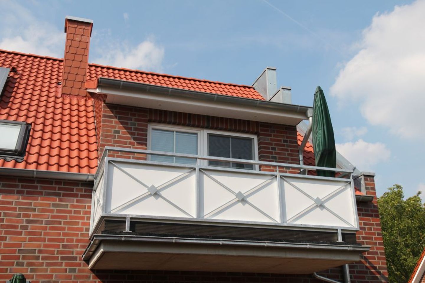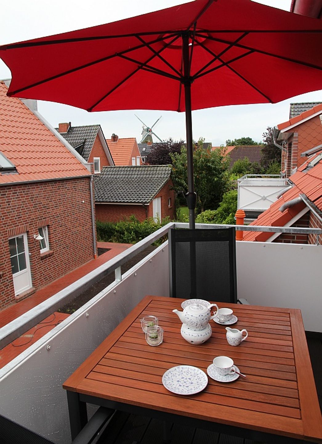 Der große Balkon ist möbliert mit 4 bequemen Gartenstühlen, einem großen Tisch und einem Sonnenschirm. Von hier aus genießen Sie einen Blick auf eine der beiden Greetsieler Zwillingsmühlen.