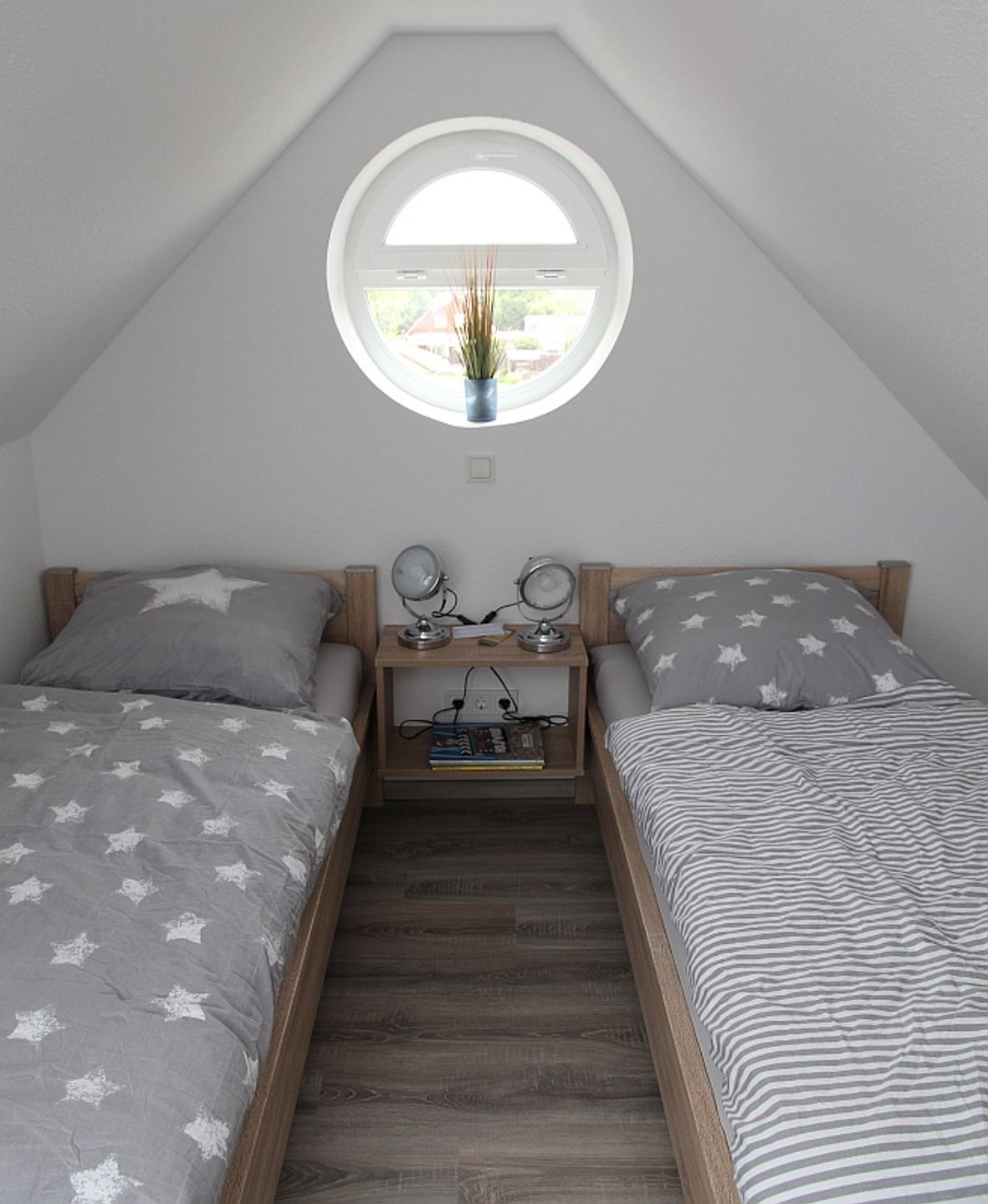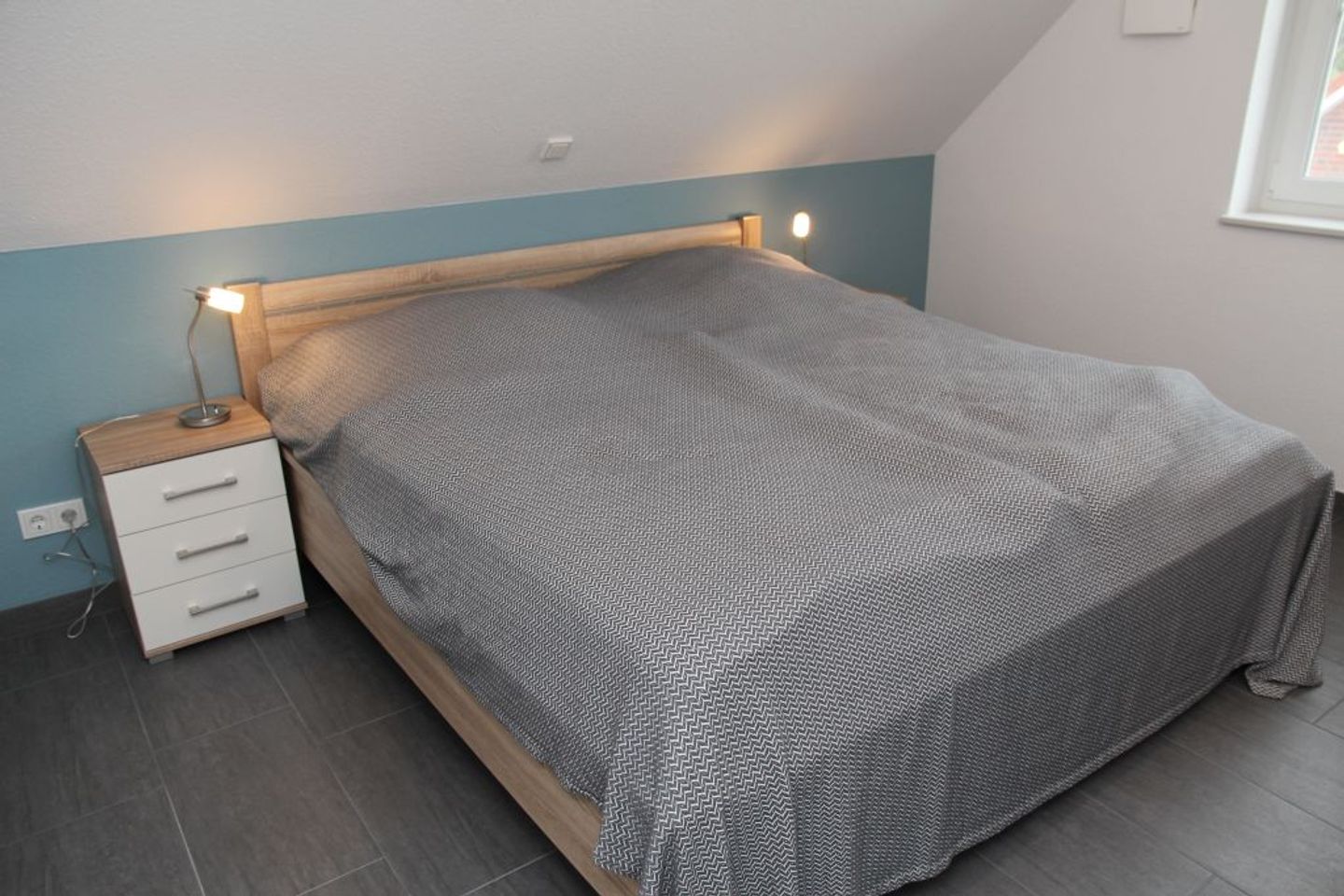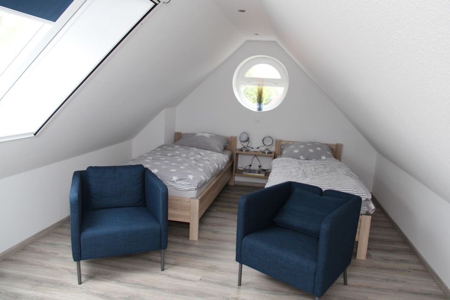 Hier finden Sie alles, was Ihr Urlauberherz begehrt. Die Wohnung verfügt über zwei Schlafzimmer, wovon sich ein Schlafzimmer mit zwei Einzelbetten im ausgebauten Dachboden befindet. Ein Flachbildfernseher ist vorhanden. Die Fenster sind hier abdunkelbar und mit Insektenschutz versehen. Das zweite Schlafzimmer mit einem Doppelbett und einem Kleiderschrank befindet sich im 1. OG. Fliegengitter und Außenjalousien sind auch hier vorhanden.